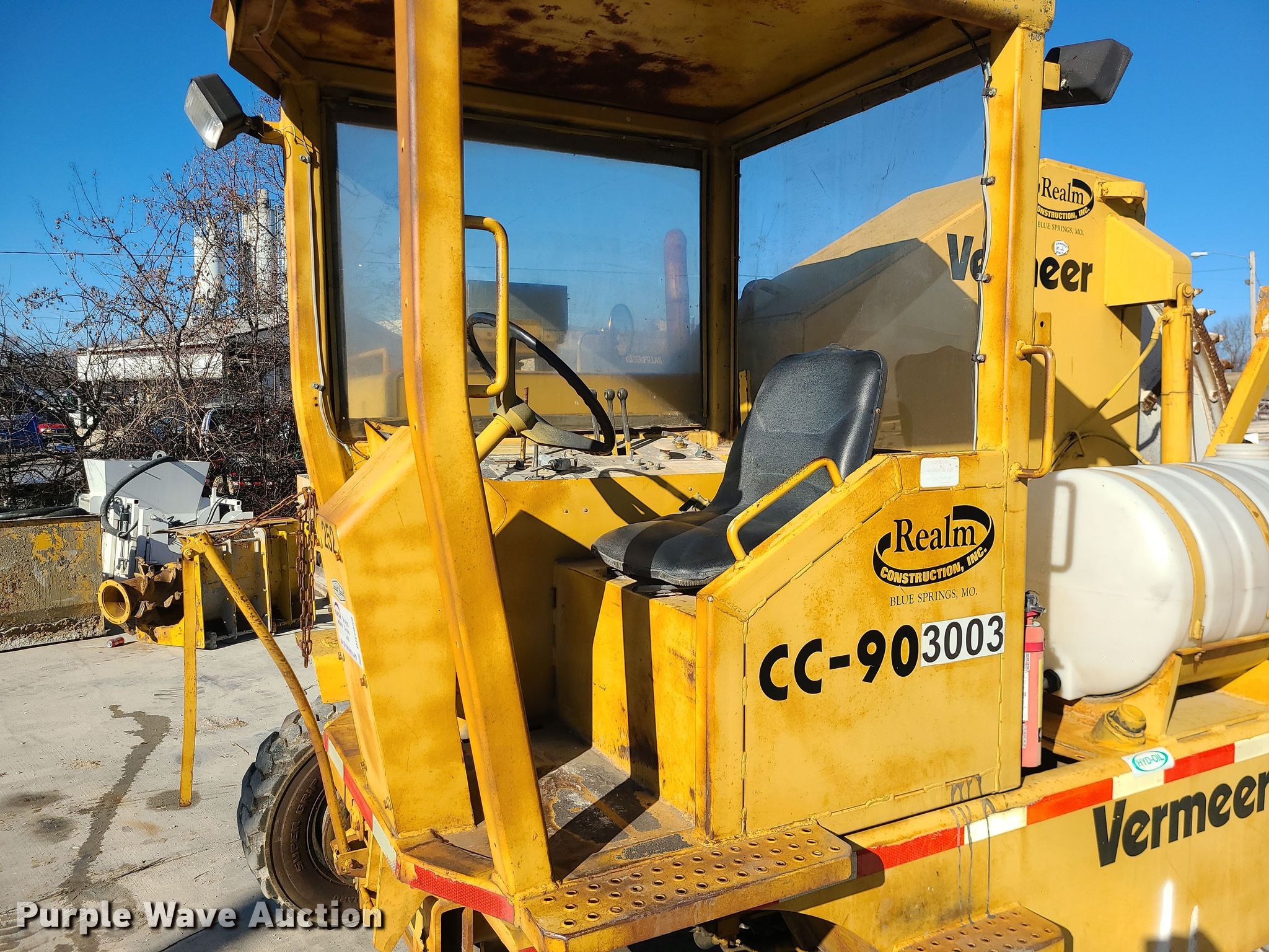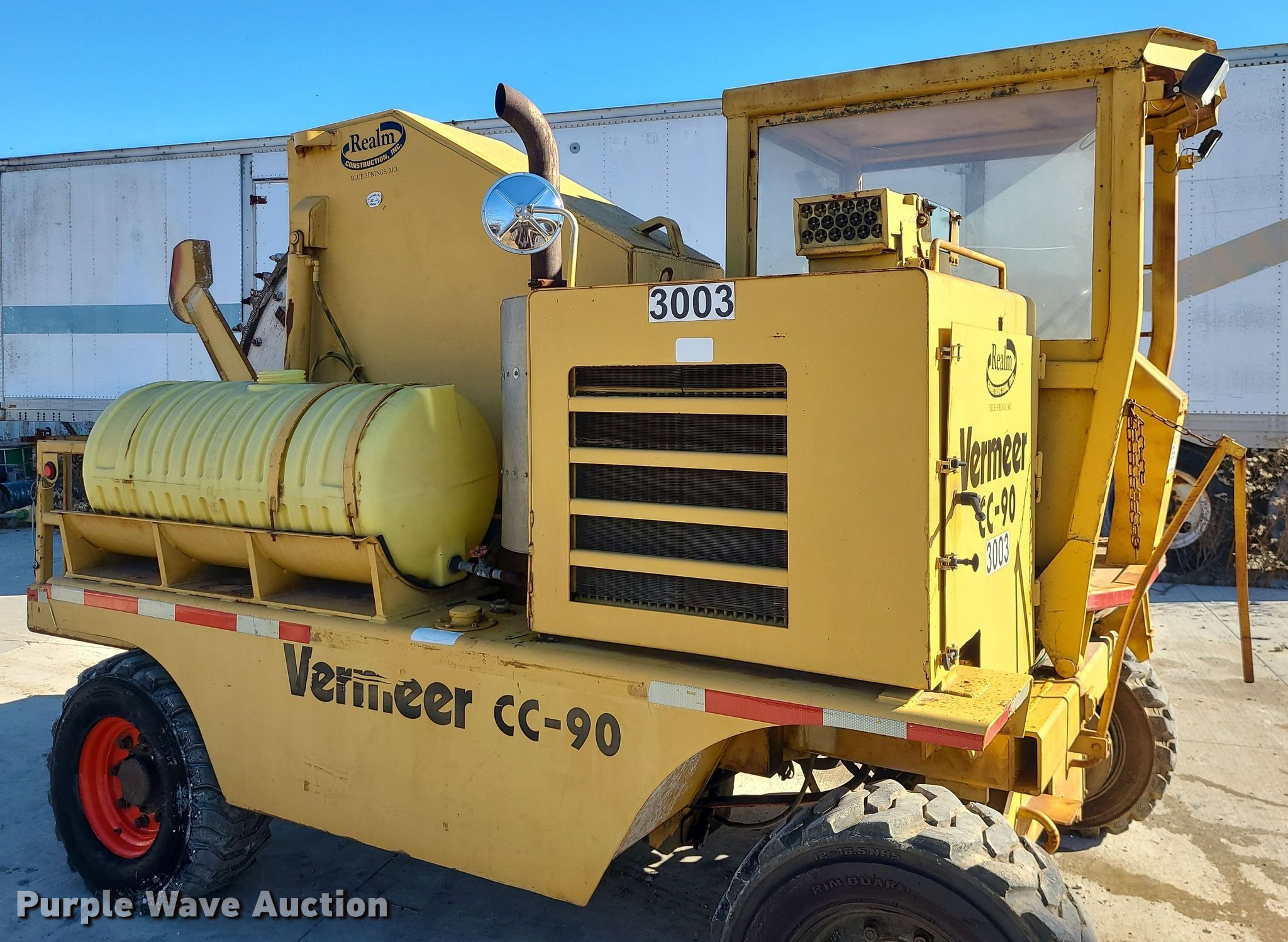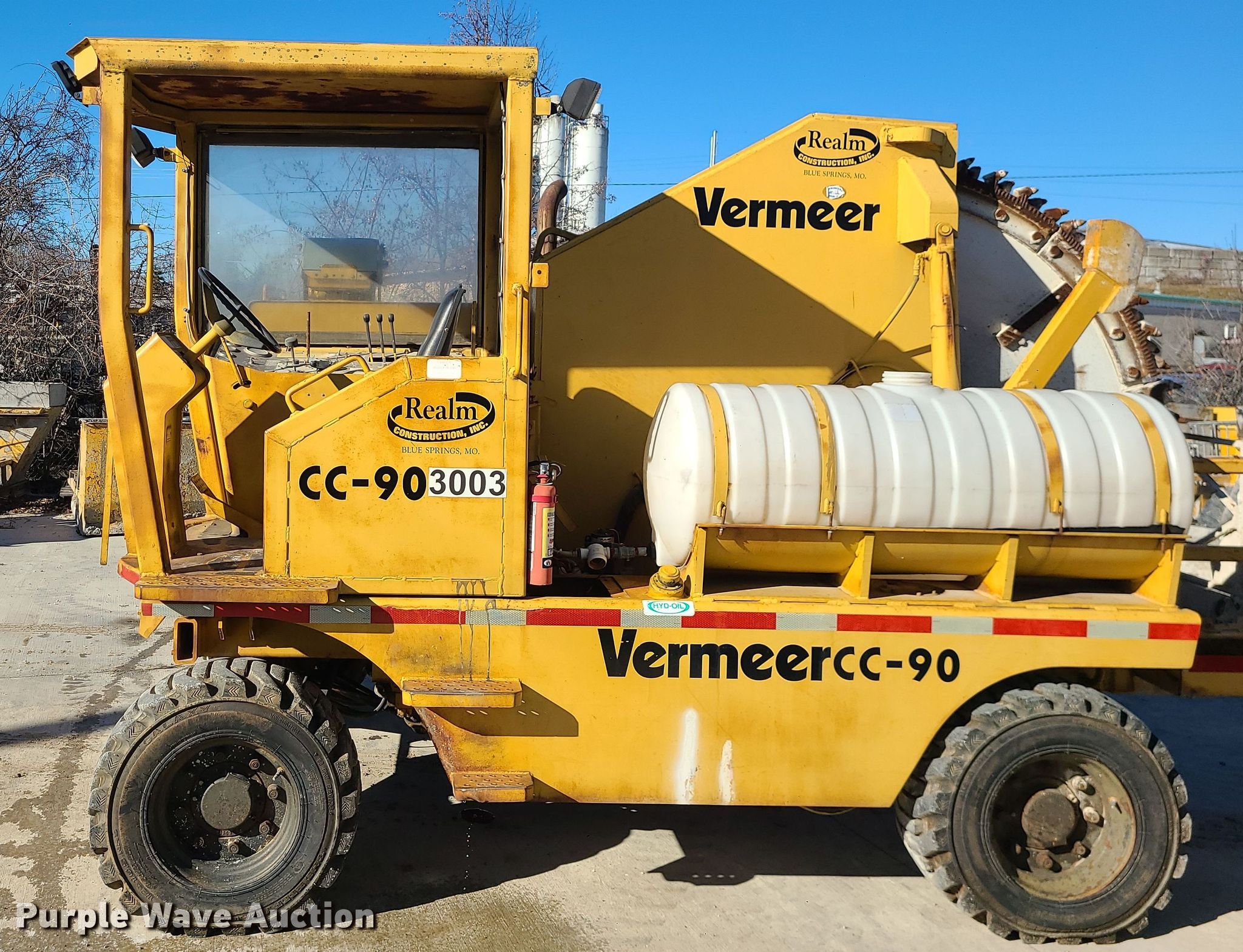 1985 Vermeer CC-90 rock saw. Hours: 3,089 on meter, Serial: 1VRF122N4F1000131. Engine Detroit Diesel , Cylinders: 3, Fuel type: Diesel. Transmission Hydrostatic. Operators station Canopy. Features Rock wheel Wheel diameter: 84", Cutting width: 4". Tires Size: 12-16.5. Realm Construction, Inc.. 604 SE Industrial Dr. Blue Springs, MO 64014