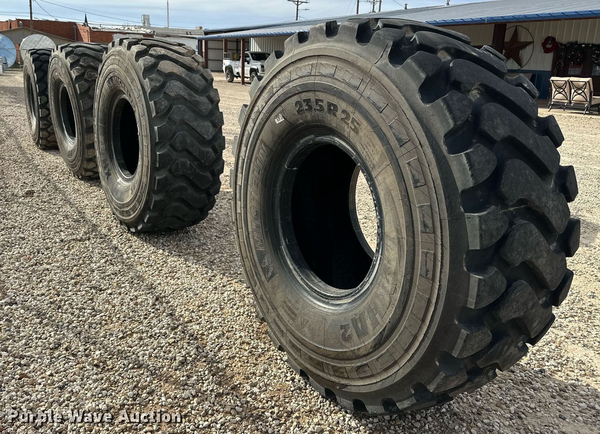 (4) Michelin XHA2 tires. Size: 23.5R25. HH Farms LLC. 932 West I-27 Svc Rd. Abernathy, TX 79311