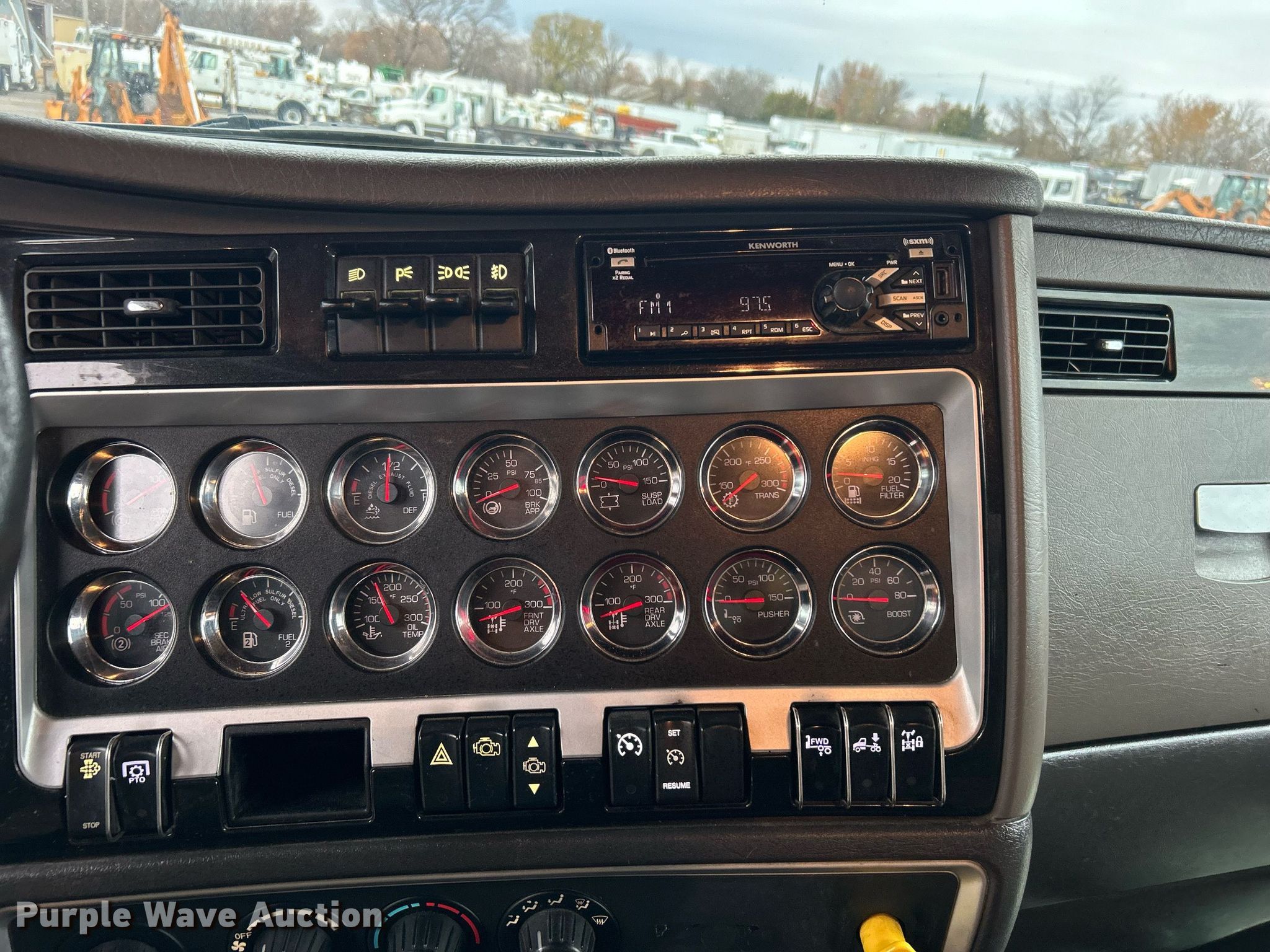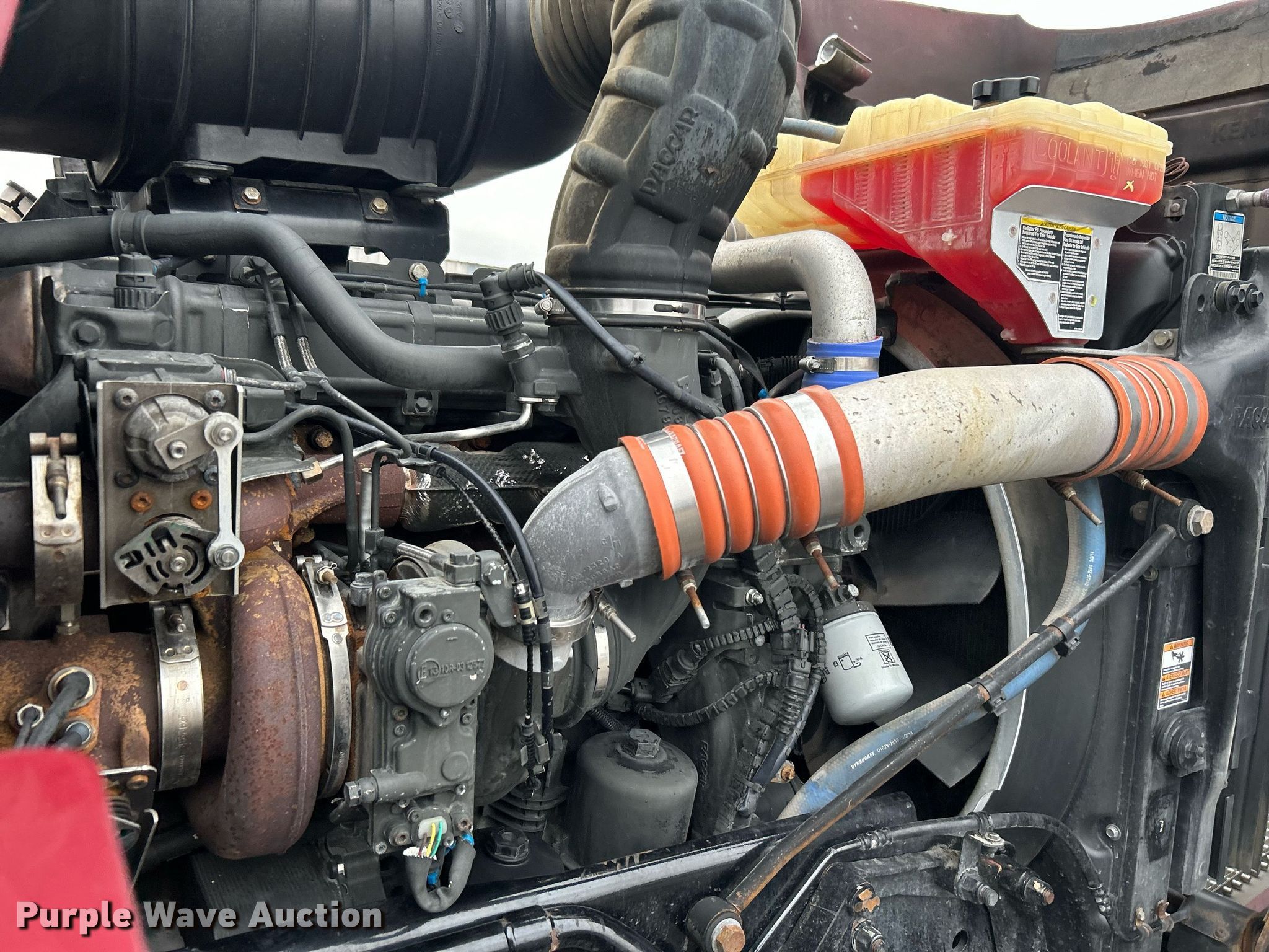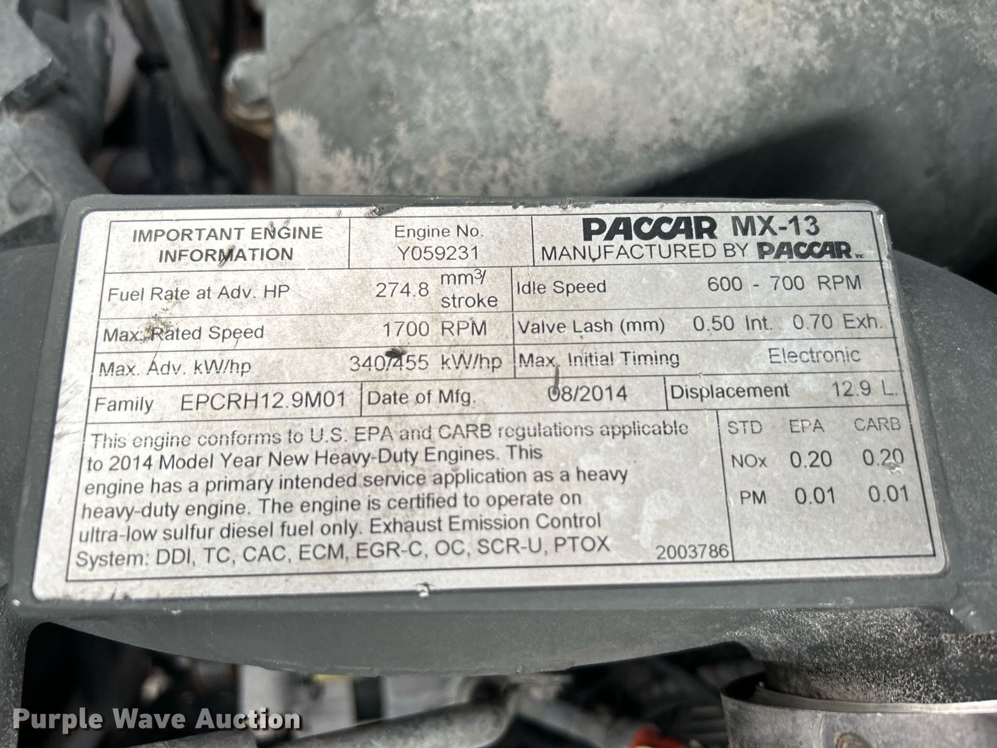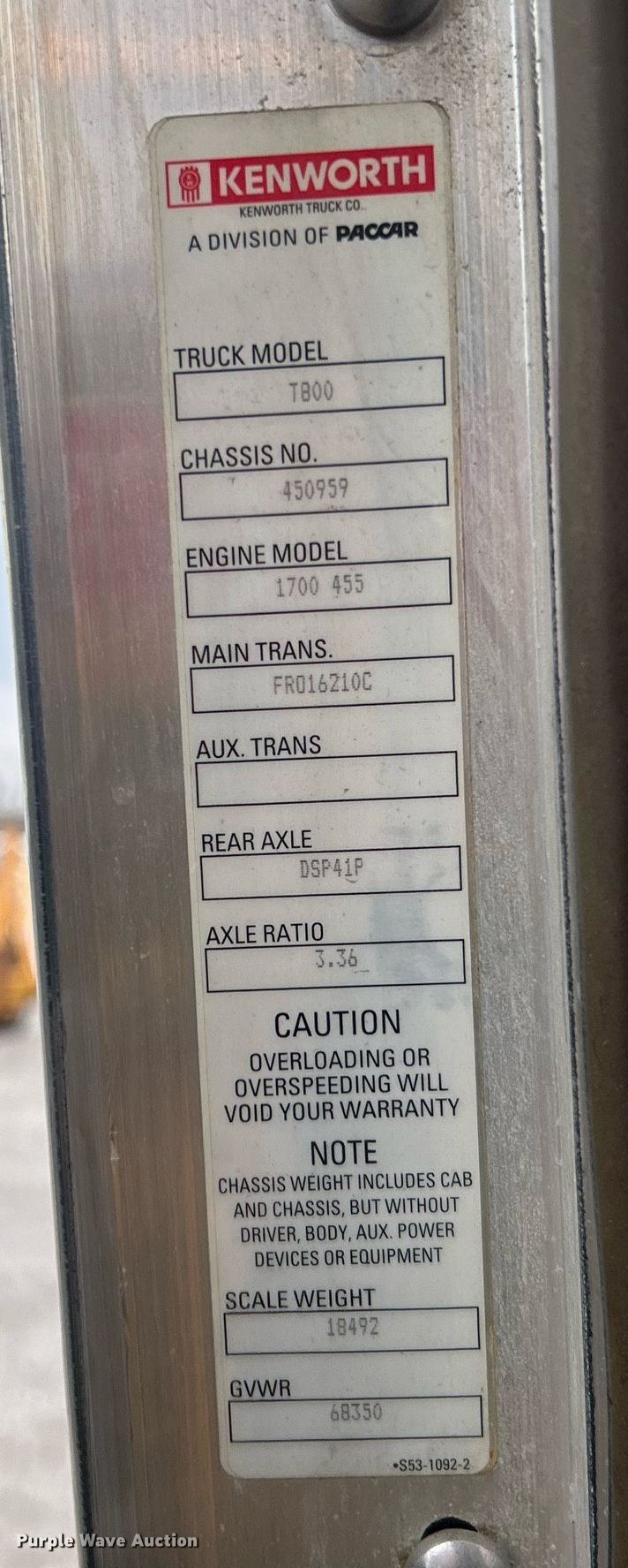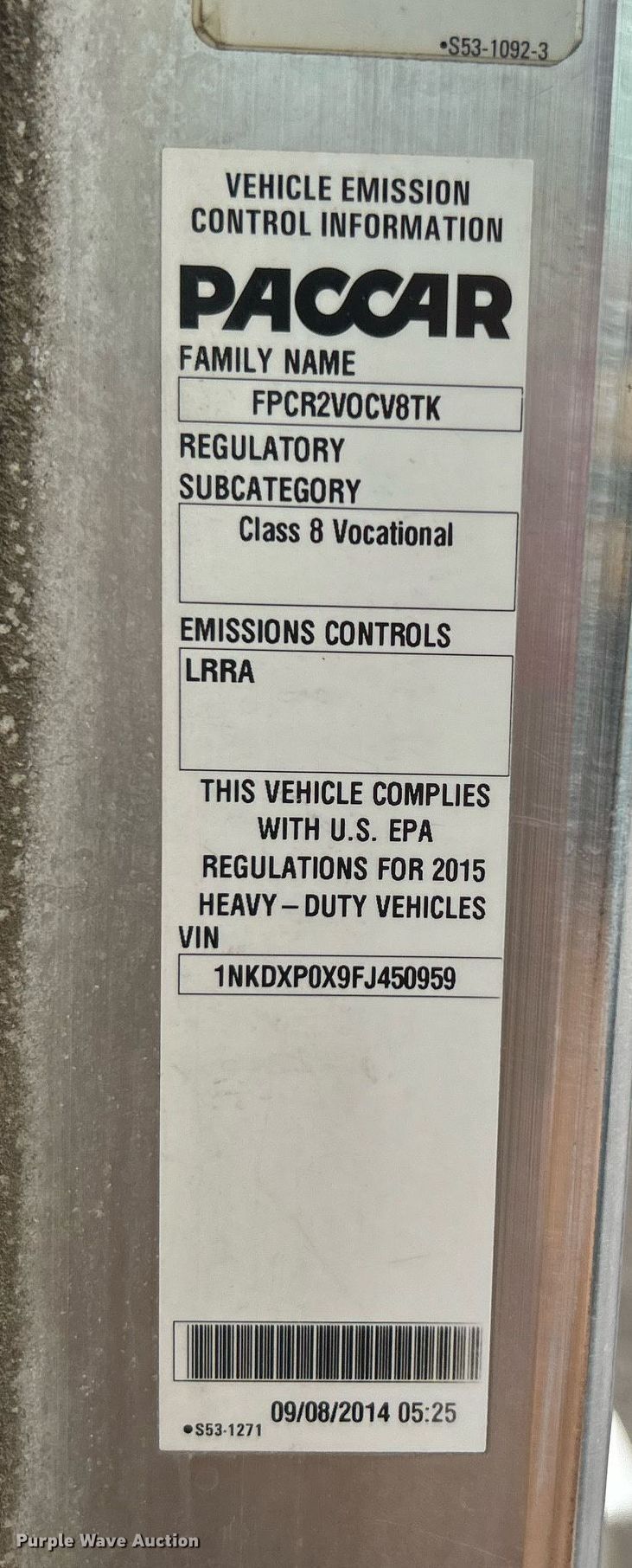2015 Kenworth T800 tank truck. Miles: 534,081 on odometer, Hours: 13,132 on meter, VIN: 1NKDXP0X9FJ450959. Engine Paccar MX13, Serial: Y059231, Displacement: 12.9L, Cylinders: 6, Fuel type: Diesel, HP: 455, kW: 340. Transmission Eaton Fuller, Manual, Speed: 10. Chassis Axles: Tandem, Pusher axle, Differential lock: Inter-axle, Suspension: Air Dump valves, Brakes: Air, PTO, GVWR: 68,350 lbs. Interior AC, Heat, Power windows, Power locks, Cruise control. Features Bed / tank 19' 8" L x 84" W, Compartments: 1. Tires Front: 315/80R22.5, Rear: 11R22.5, Lift axle: 295/75R22.5. Notes Tank damage. Oklahoma title. Title distribution may be delayed up to 14 days from verification of funds. 15107 North 137th East Avenue. Collinsville, OK 74021
