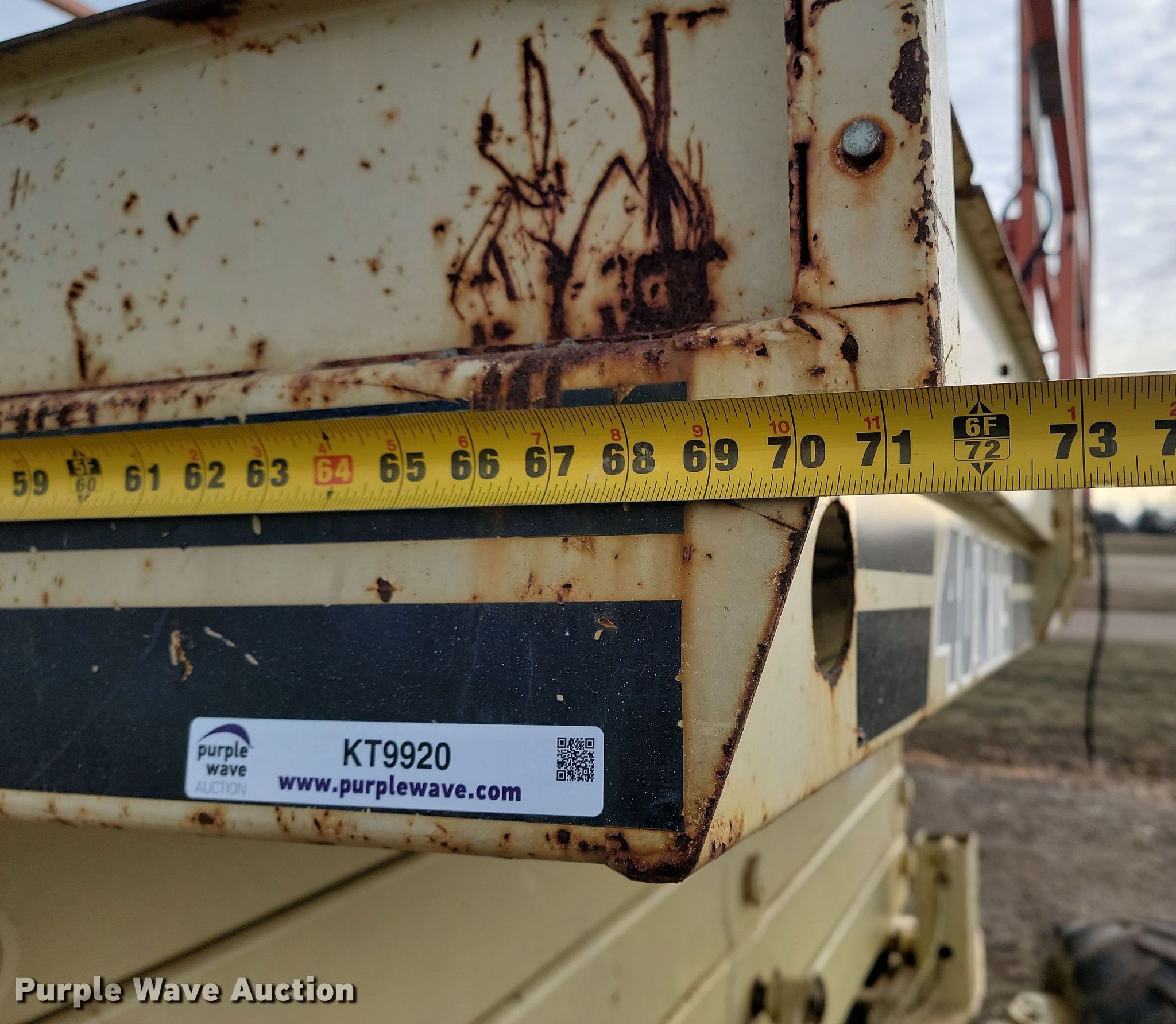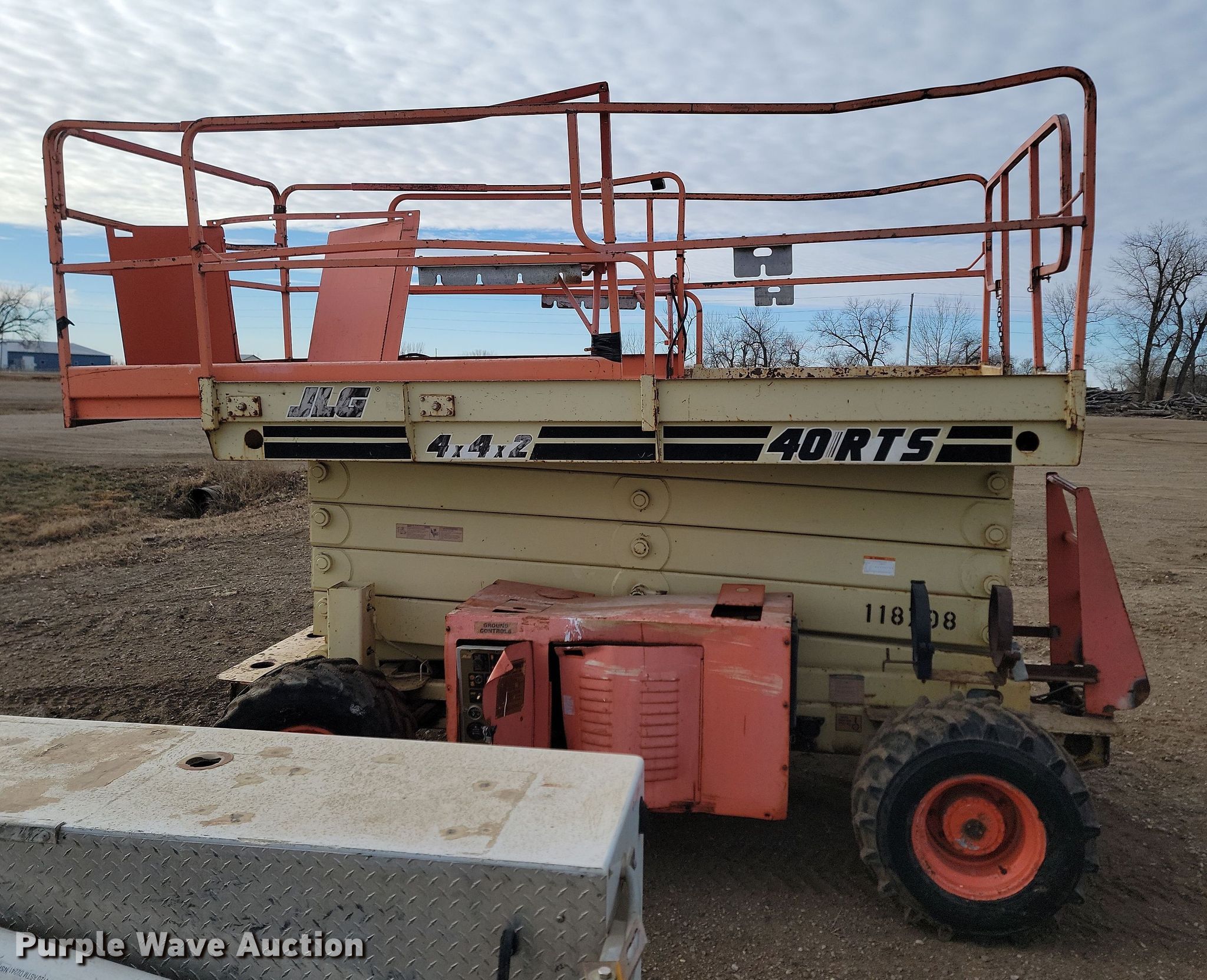 2000 JLG 40-RTS scissor lift. Hours: 2,700 on meter, Serial: 0200065706. Chassis Four wheel drive. Features Rough terrain, Maximum lift capacity: 750 lbs, Maximum lift height: 40', Platform: 126" L x 72" W, AC power outlet, Controls: Ground, Platform extensions: Manual. Tires Tire size: Unreadable , Foam filled. Notes Engine missing , Parts only, Parts may be missing, Unit must be towed or hauled, Non-operational unit. Basin Construction and Drain Tile. 1212 Basin Rd. Hayti, SD 57241
