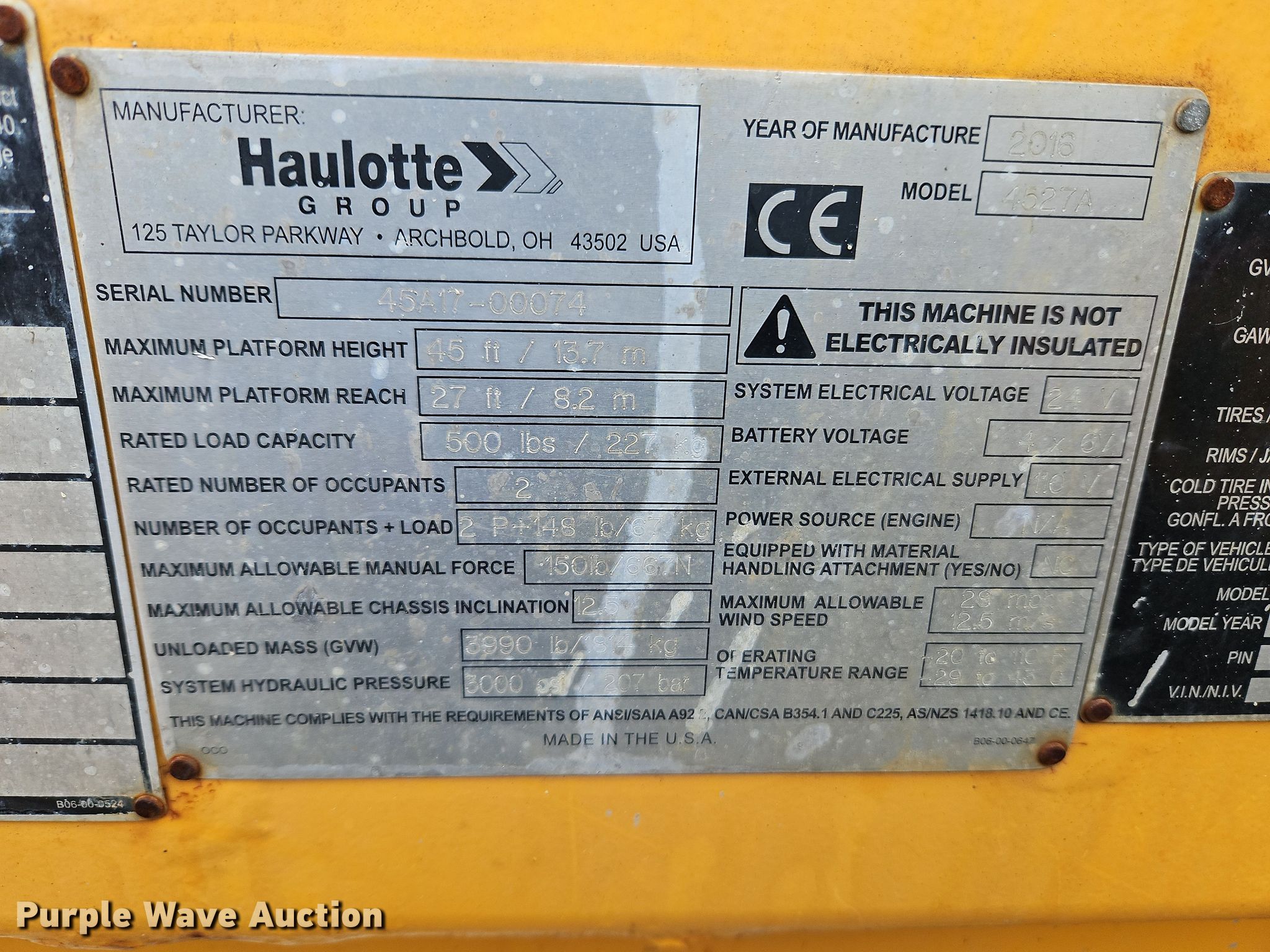2016 Haulotte 4527A boom lift. VIN: 5CUAJ201XHA000074. Features Tow behind, Maximum lift capacity: 500 lbs, Maximum reach length: 27', Maximum lift height: 45', Hydraulic outriggers, Hydraulic extendable jib, Hydraulic leveling, Platform: 27" L x 47" W, AC power outlet, Air outlet, Controls: Platform, Ground. Tires Tire size: ST225/75R15. This is worksite support equipment and will not come with a title. Transfer of ownership documentation will be a bill of sale. Gerken Rent-All. 31600 Old KC Rd. Paola, KS 66071