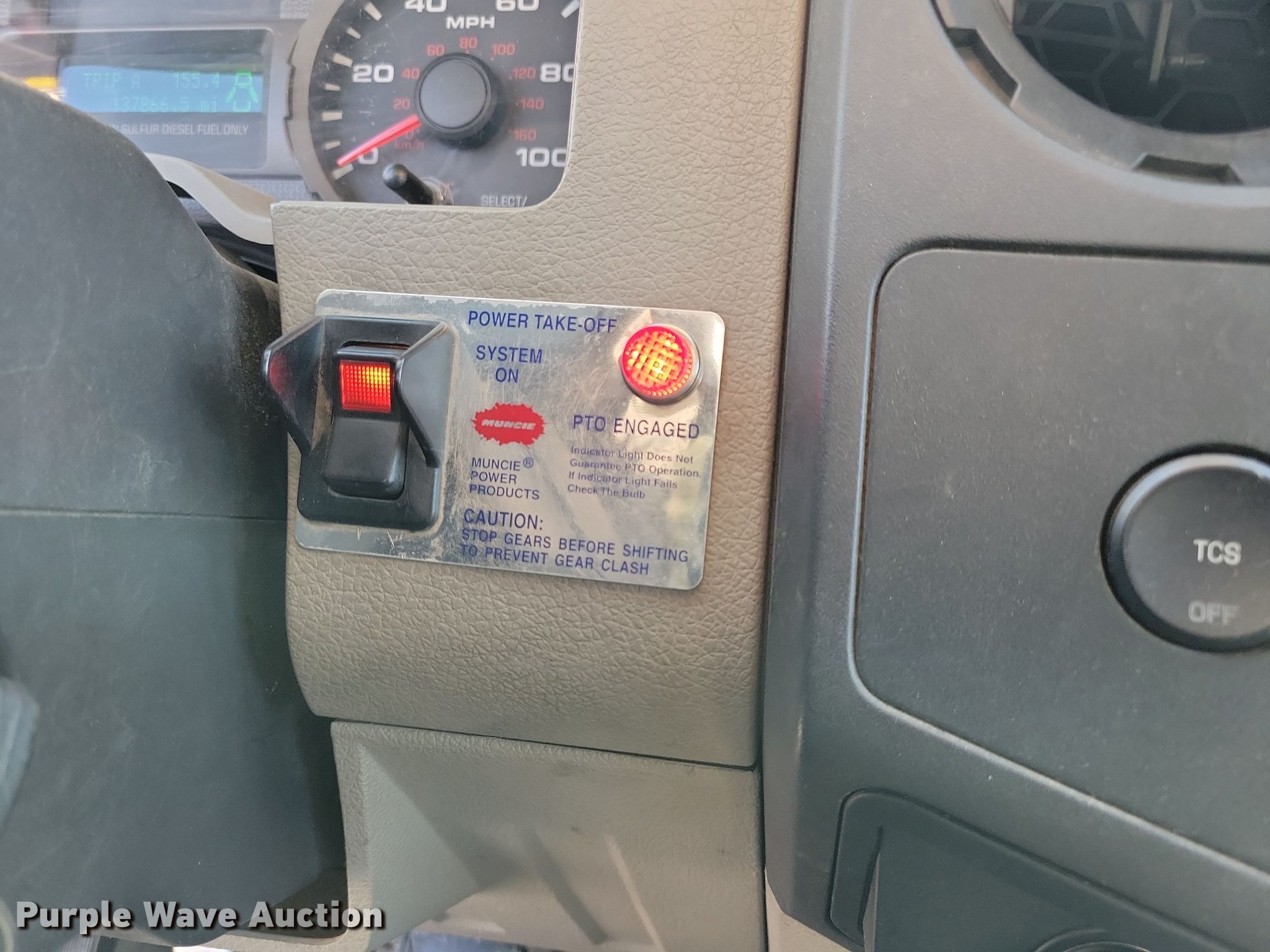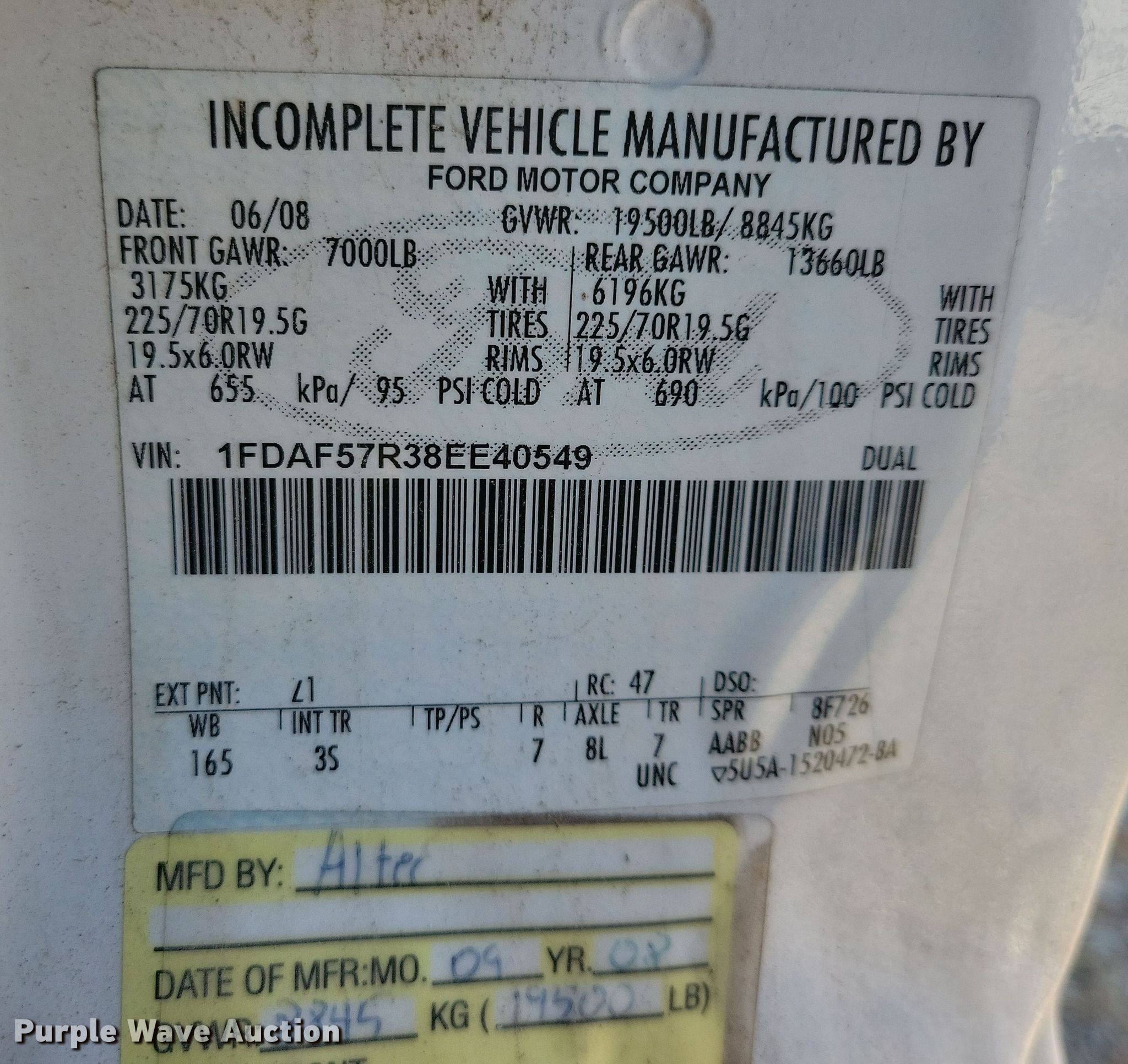 2008 Ford F550 bucket truck. Miles: 137,866 on odometer, VIN: 1FDAF57R38EE40549. Engine Powerstroke, Displacement: 6.4L, Cylinders: 8, Fuel type: Diesel. Transmission Manual, Speed: 6. Chassis Four wheel drive, Axles: Single, Suspension: Spring, Brakes: Hydraulic, PTO, GVWR: 19,500 lbs, Wheelbase: 165". Interior AC, Heat, Auxiliary controls, Brake controller. Features Bed Brand FX, Serial: 0819966, 13' L x 94" W, Boom 2008 Altec AT37-G, Serial: 0808DE9828, Boom length: 28.5', Mast height: 9', Maximum lift capacity: 350 lbs, Maximum lift height: 37.5', Boom type: Articulating, Insulated, Man basket, Boom controls Platform/ basket.. Tires Size: 225/70R19.5. Notes Non-operational turbo. Iowa title. Title distribution may be delayed up to 14 days from verification of funds. Baker Group. 4224 Hubbell Avenue. Des Moines, IA 50317