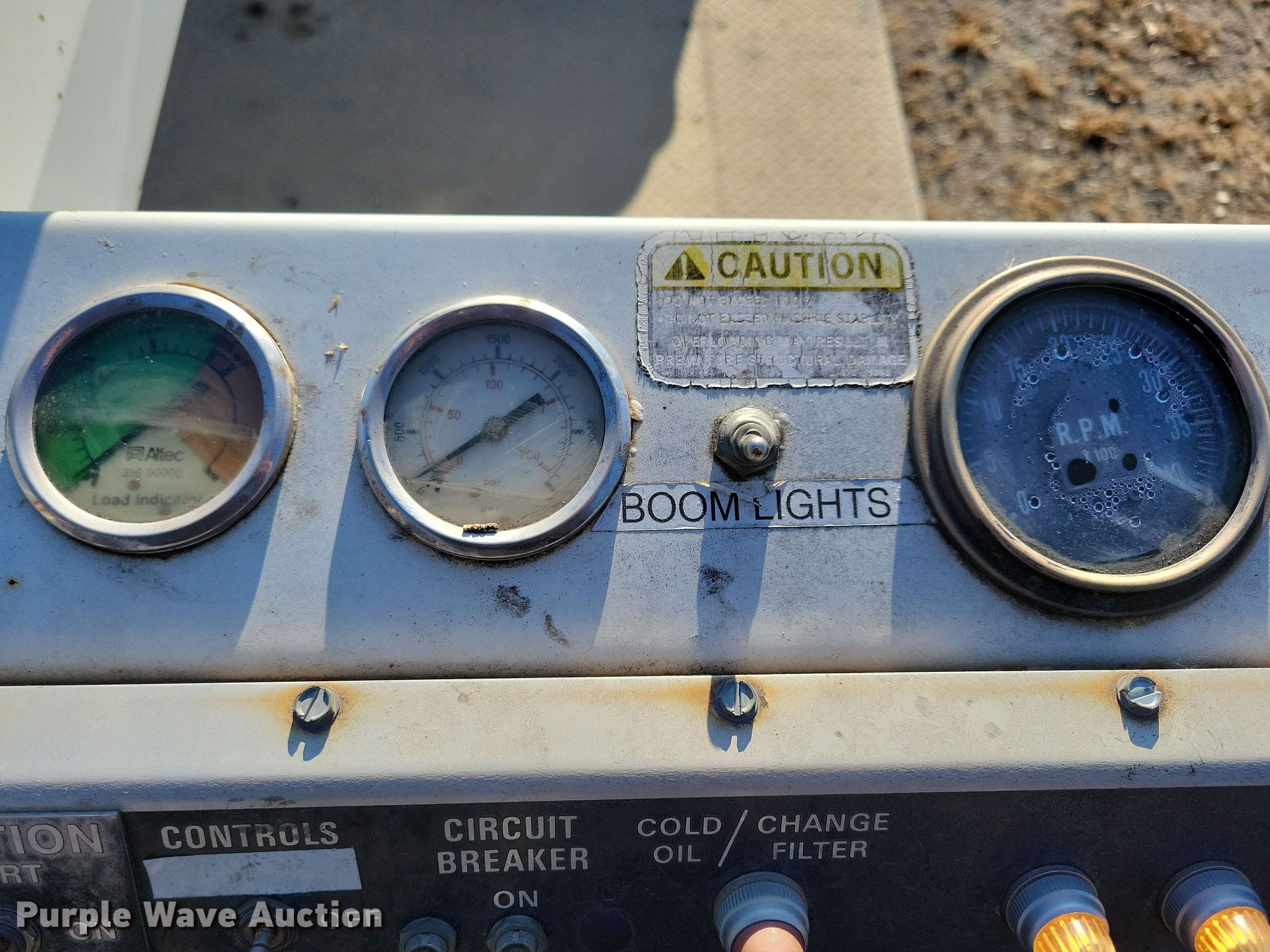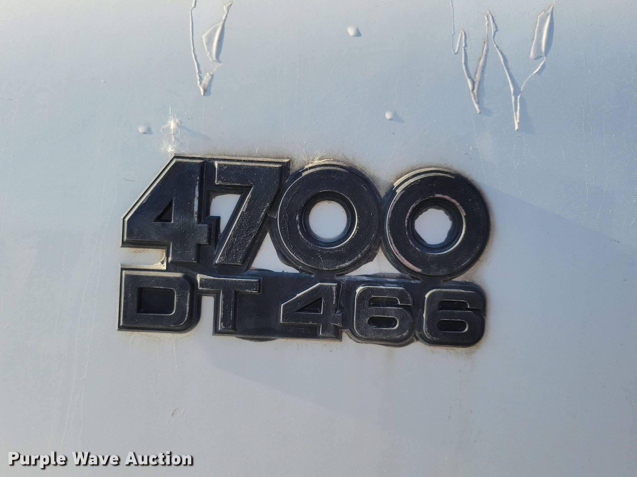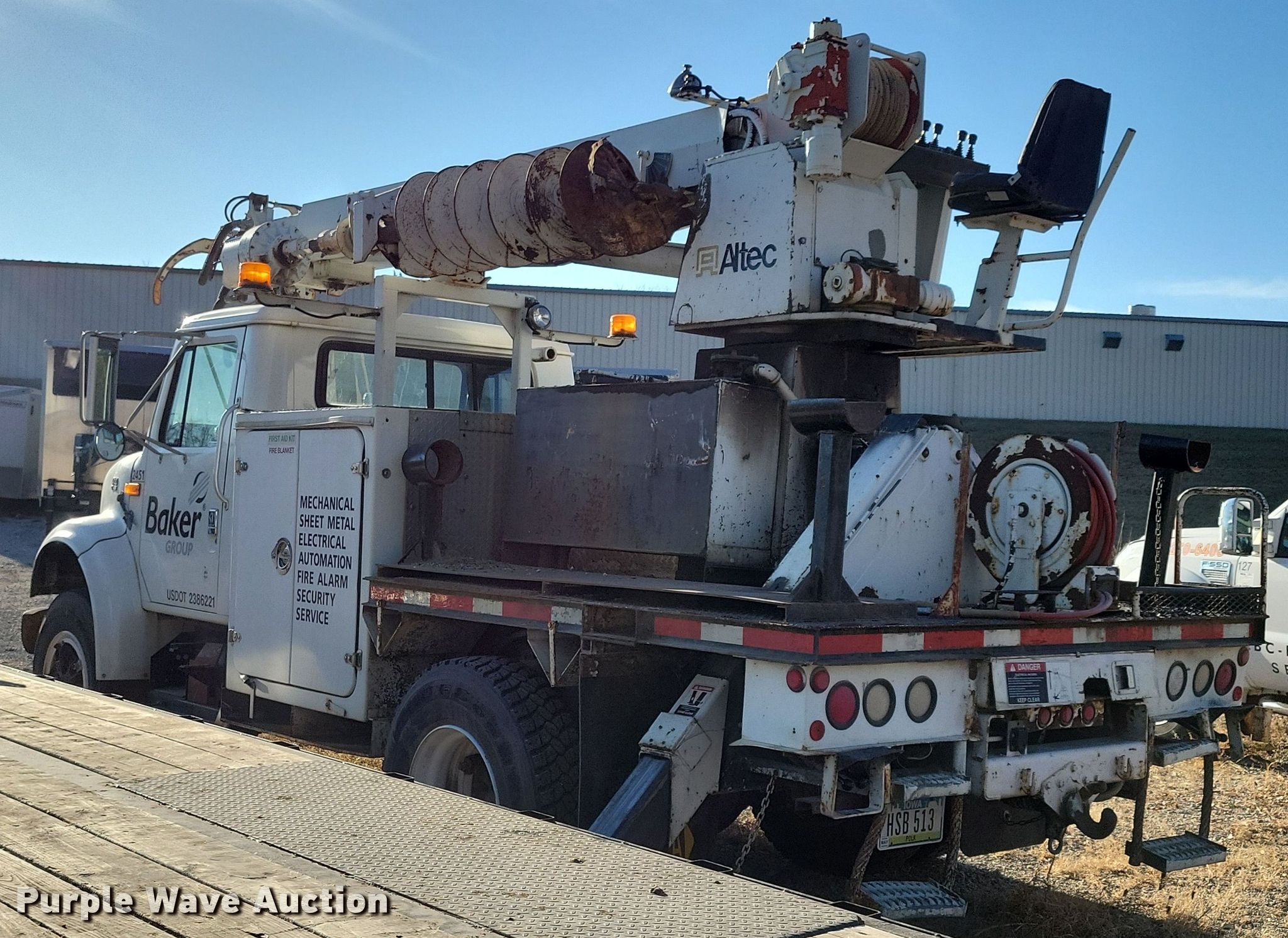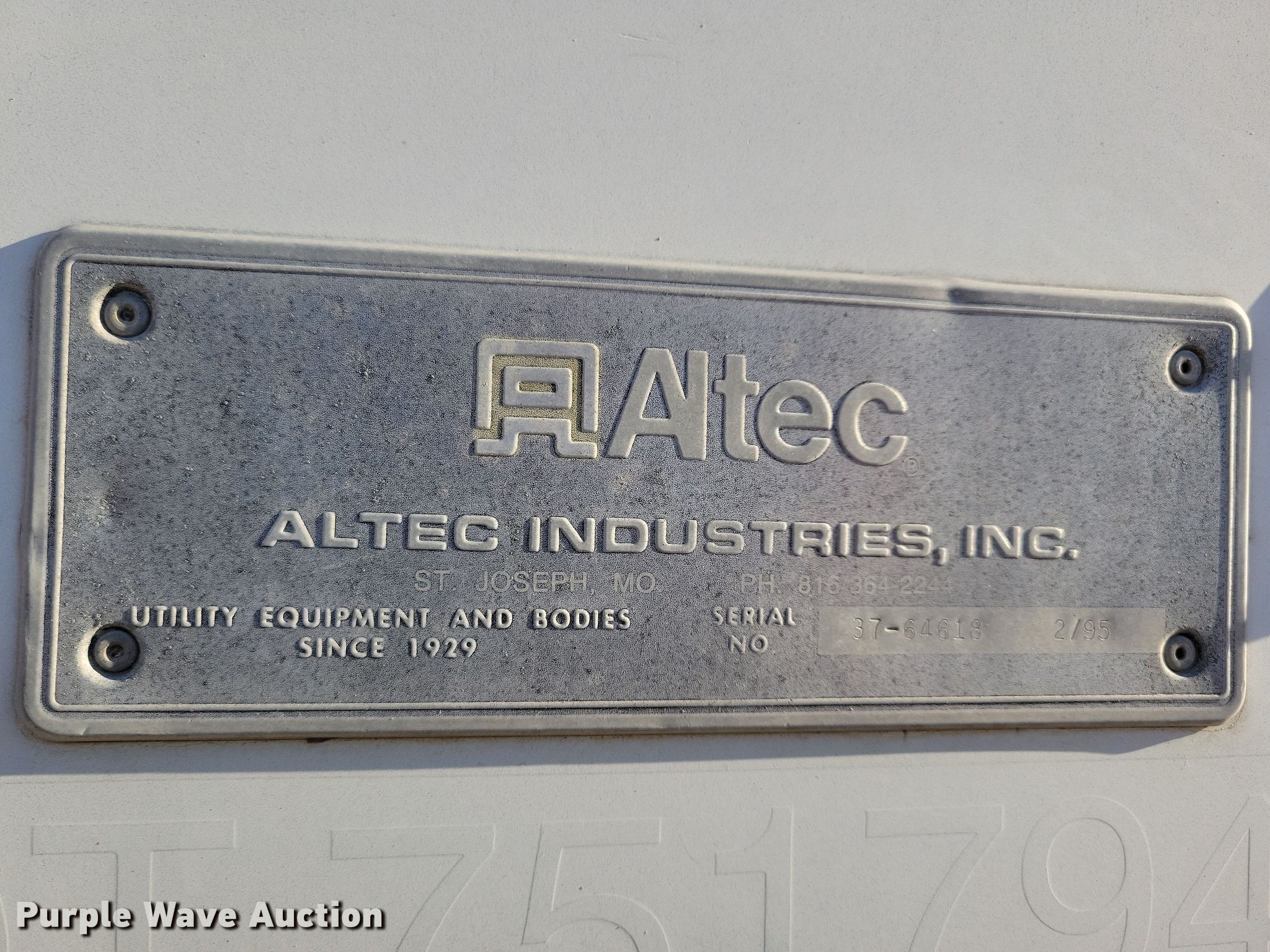 1995 International 4700 bucket truck. Miles: 57,007 on odometer, Hours: 4,443 on meter, VIN: 1HTSCAAN8SH669026. Engine International DT466, Serial: 1823823, Displacement: 7.6L, Cylinders: 6, Fuel type: Diesel, HP: 210. Transmission Spicer, Manual, Speed: 5, plus 2. Chassis Axles: Single, Suspension: Spring, Brakes: Air, PTO, Wheelbase: 152". Interior Heat, Brake controller. Features Bed Altec, Serial: 37-64618, 12' L x 96" W, Boom Altec D820-T, Serial: 1194-A1463, Boom length: 26', Mast height: 10', Maximum lift capacity: 13,800 lbs, Maximum lift height: 36', Boom type: Articulating, Telescopic, Boom controls Platform/ basket, Pole guide, Auger Diameter: 18".. Tires Size:11R22.5. Notes Non-operational rear end , Dead battery, Unit must be towed or hauled. Iowa title. Title distribution may be delayed up to 14 days from verification of funds. Baker Group. 4224 Hubbell Avenue. Des Moines, IA 50317