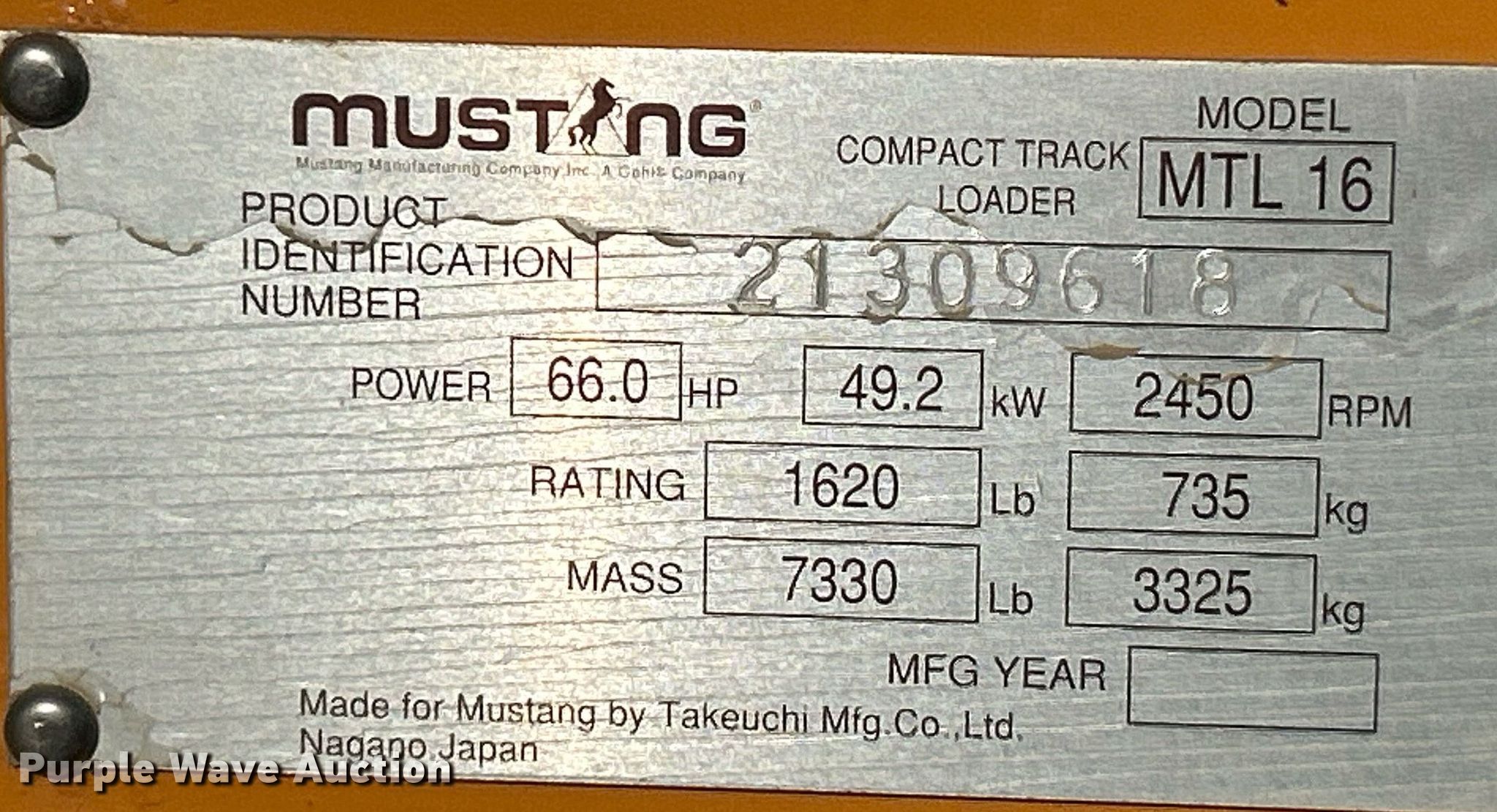 Purple Wave is selling a used Tracked Skid Steer Loader in Missouri. This item is a 2007 Mustang MTL16 tracked skid steer loader with the following: Hours: 902 on meter, Serial: 21309618