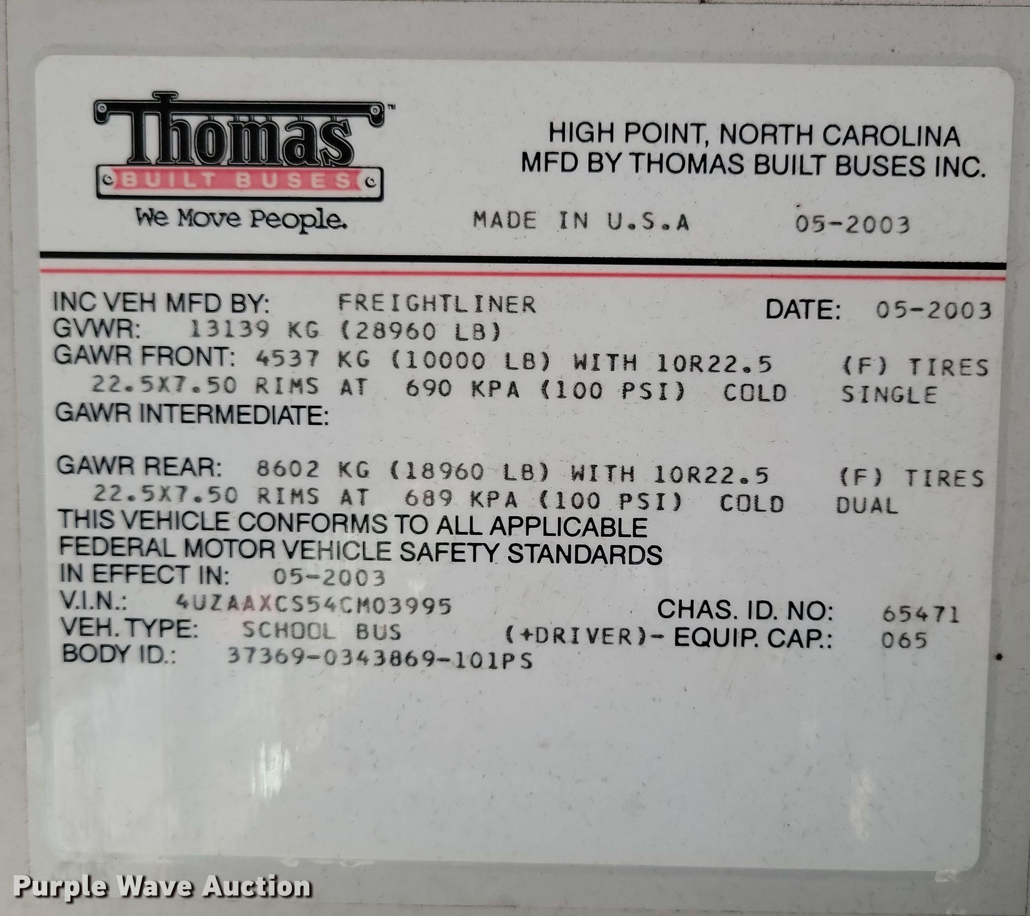 2004 Freightliner FS65 school bus. Miles: 180,843 on odometer, VIN: 4UZAAXCS54CM03995, Unit #: 690. Engine Mercedes Benz MBE 900, Displacement: 6.4L, Cylinders: 6, Fuel type: Diesel, HP: 300, kW: 224. Transmission Automatic. Chassis Axles: Single, Suspension: Air, Brakes: Air, GVWR: 28,960 lbs. Interior Heat, Heated mirrors, Cruise control, Auxiliary controls, Passengers: 65. Tires Size: 10R22.5. Notes Non-operational rear door latch, alarm remains on. Iowa title. Seller is a government entity who will be assigning and distributing the title. Please contact the seller for distribution questions. Des Moines Public Schools. 1915 Prospect Rd. Des Moines, IA 50310