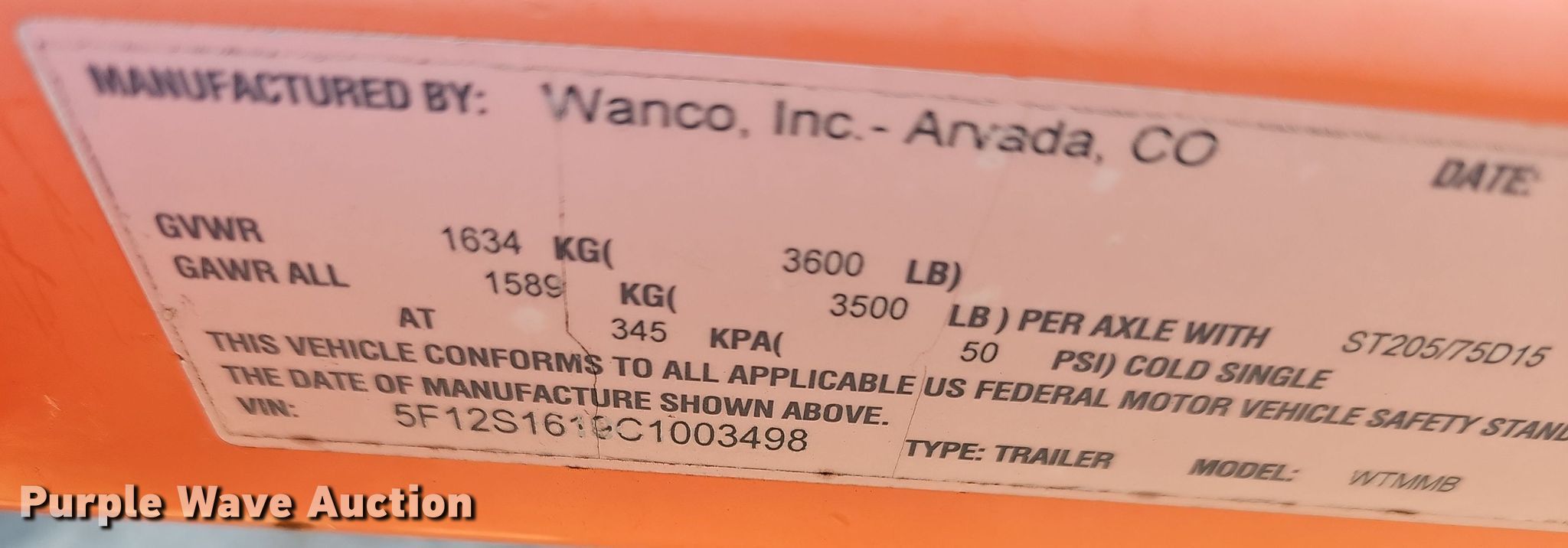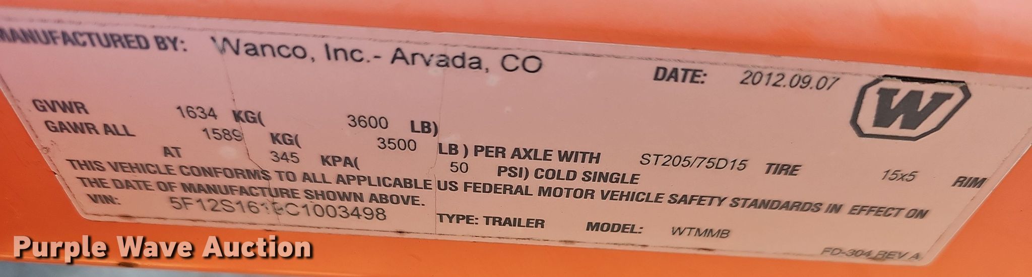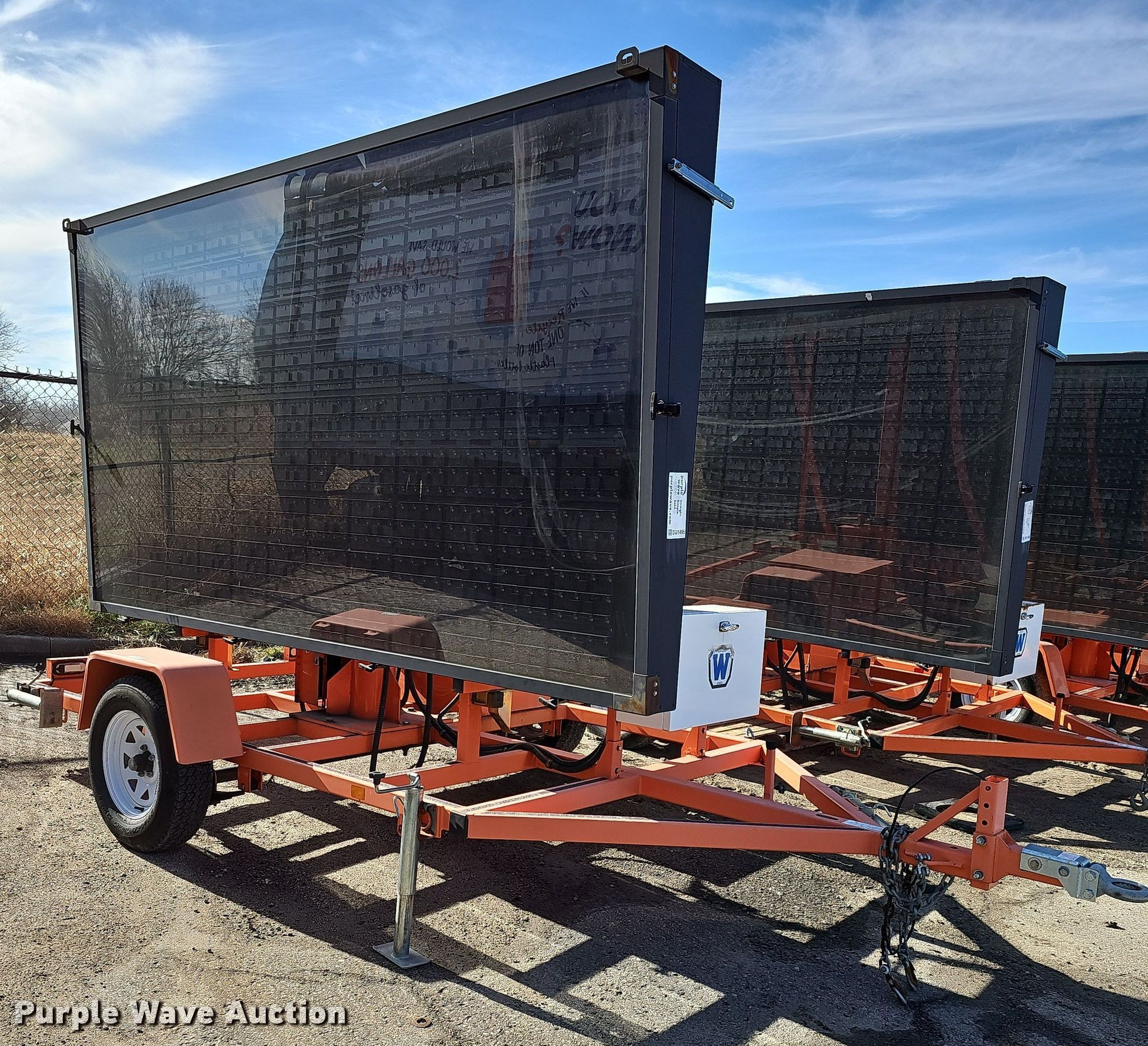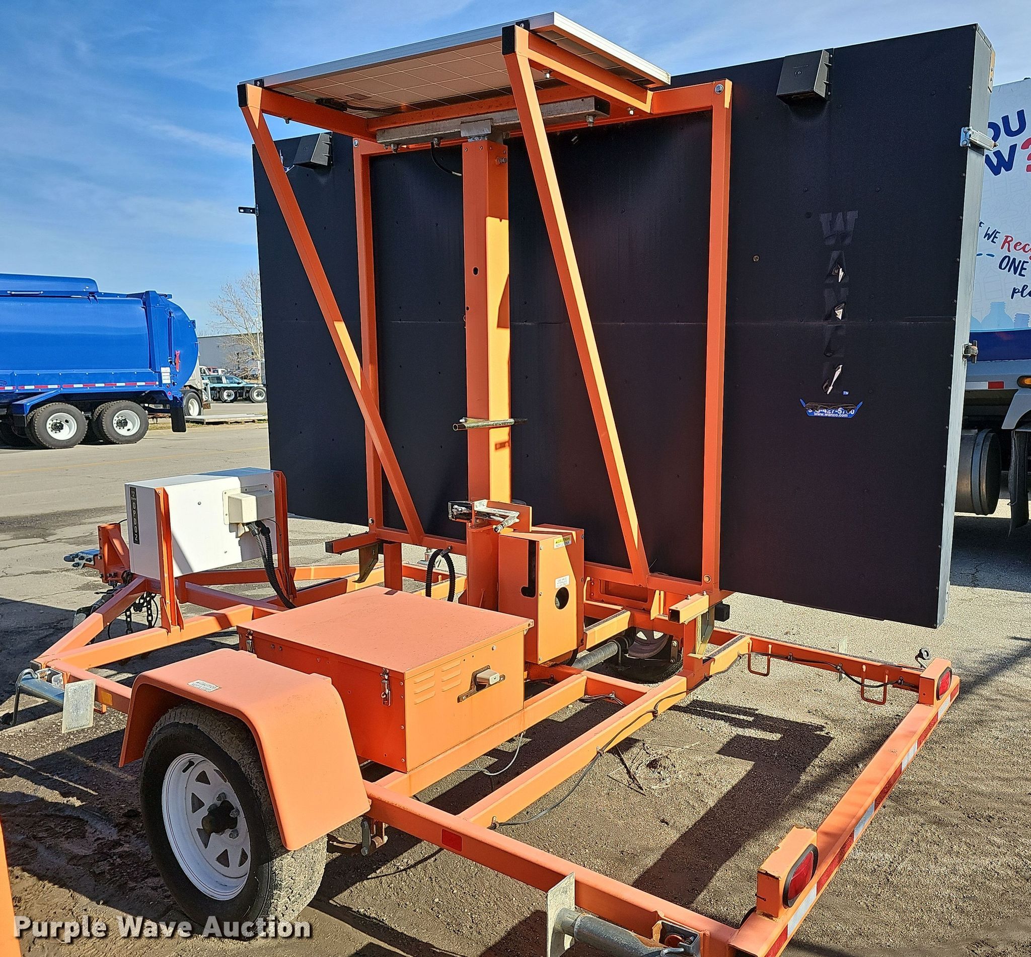 Purple Wave is selling a used Road Safety Equip. in Kansas. This item is a 2012 Wanco WTMMB portable road sign with the following: VIN: 5F12S1619C1003498, Unit #: OPD02, Hitch: Pintle, GVWR: 3,600 lbs, Stabilizers: 4