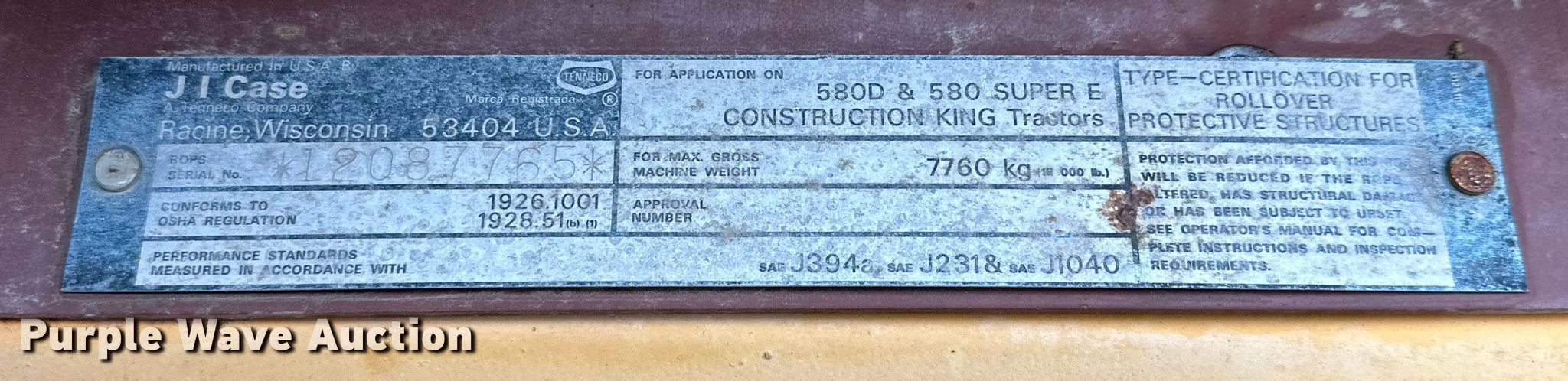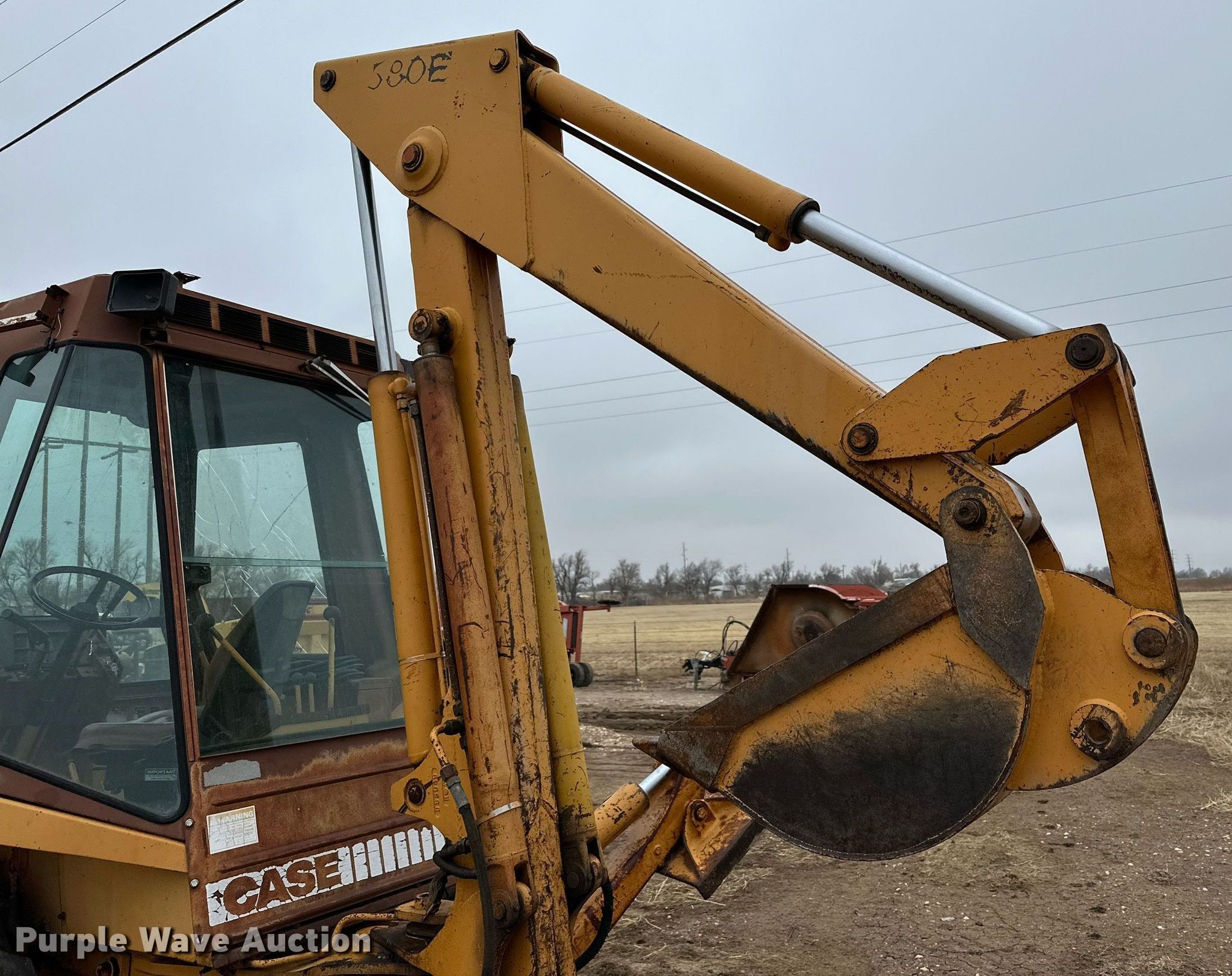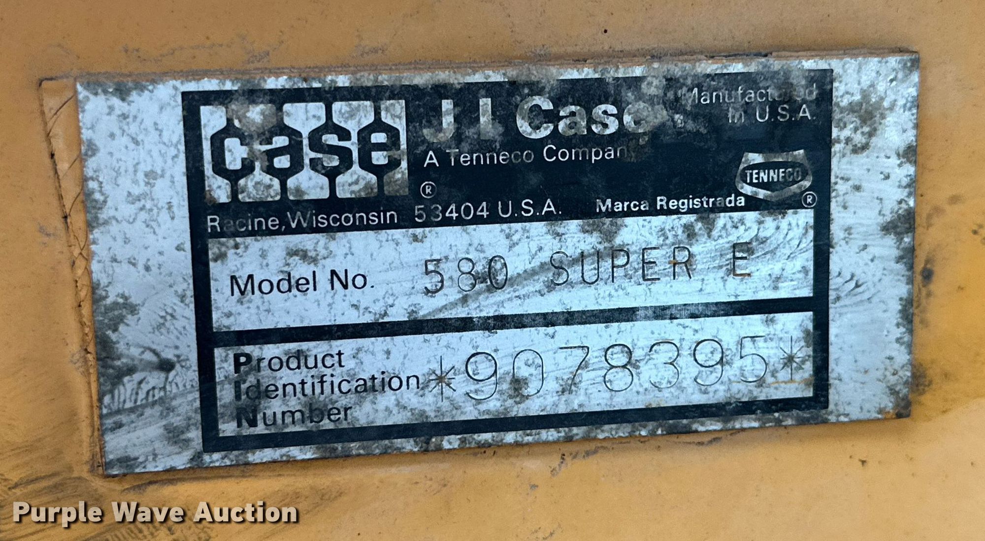 Case 580 Super E backhoe. Hours: 2,375 on meter, Serial: 9078395. Engine JI Case 4-390, Serial: 44105341, Cylinders: 4, Fuel type: Diesel. Transmission Shuttle shift, 4F - 4R. Chassis Differential lock. Operators station Enclosed cab, Backhoe controls: Four stick. Features Loader Bucket Case, Four-in-one, Width: 80", Cutting edge: Weld-on, Backhoe Bucket Width: 12", Teeth: 3, Bucket Width: 30" , Teeth: 5.. Tires Front: 11-16, Rear: 17.5-24. Notes Glass cracked. Ochiltree County, TX. 301 N Main St. Perryton, TX 79070