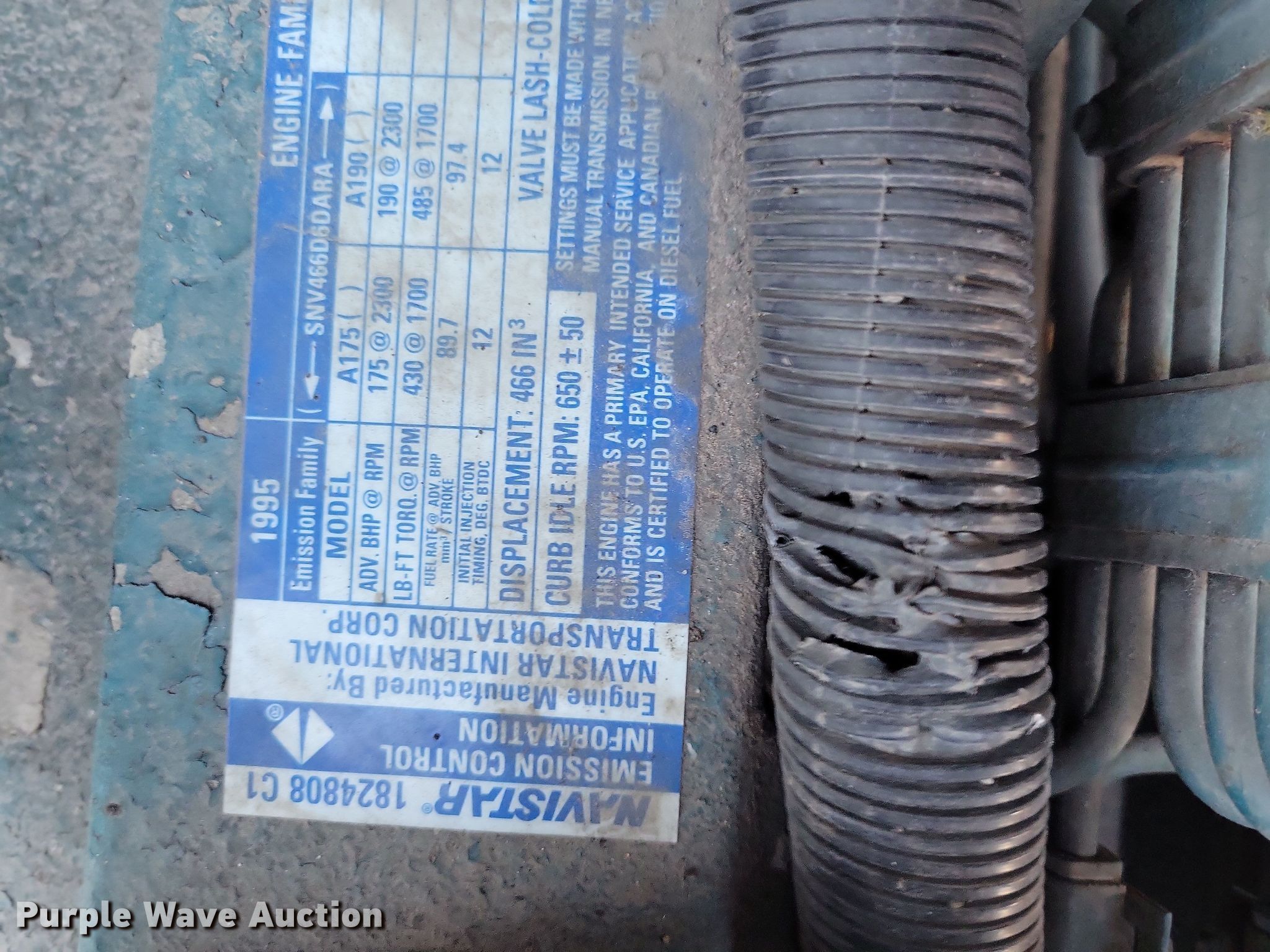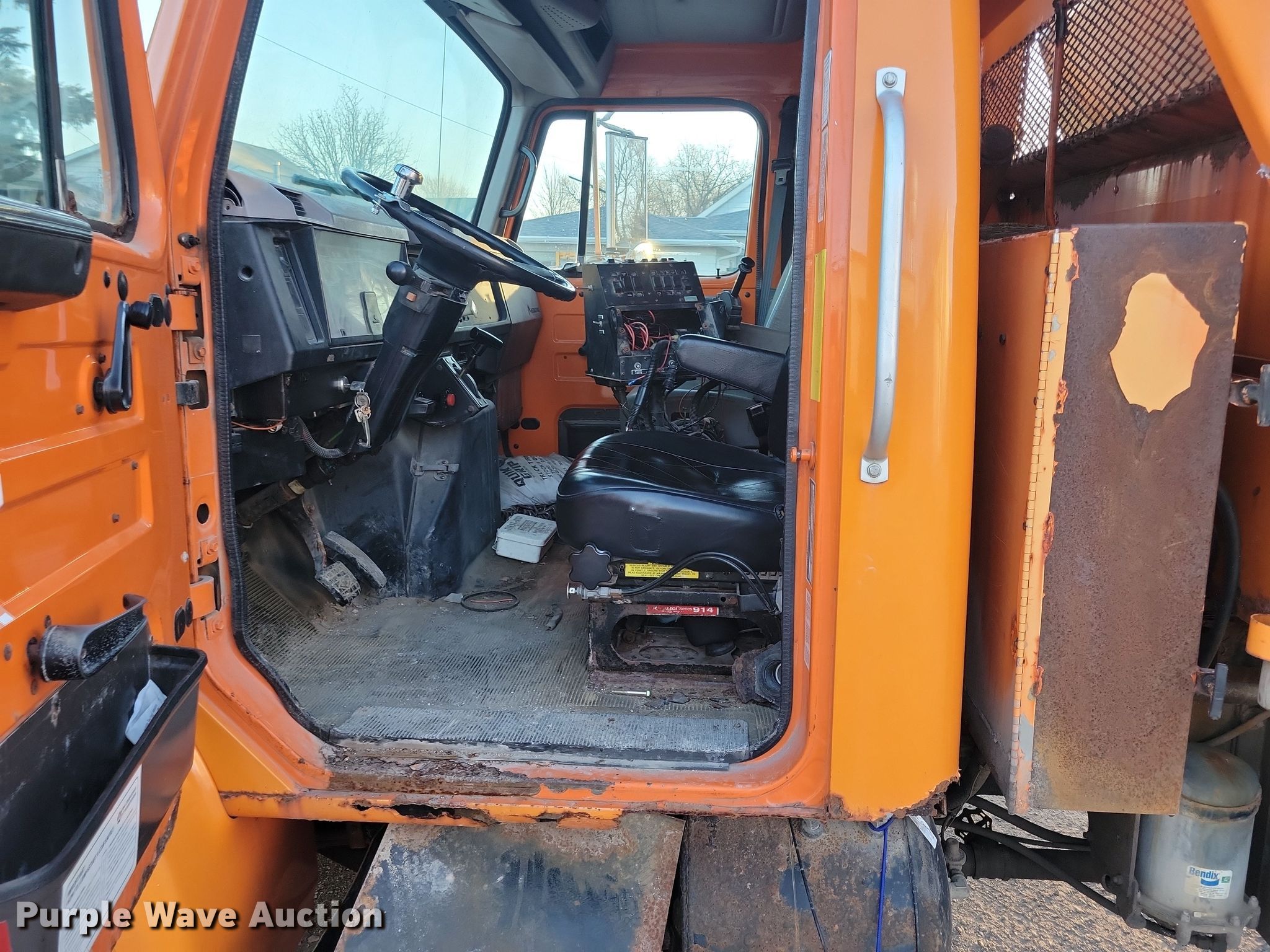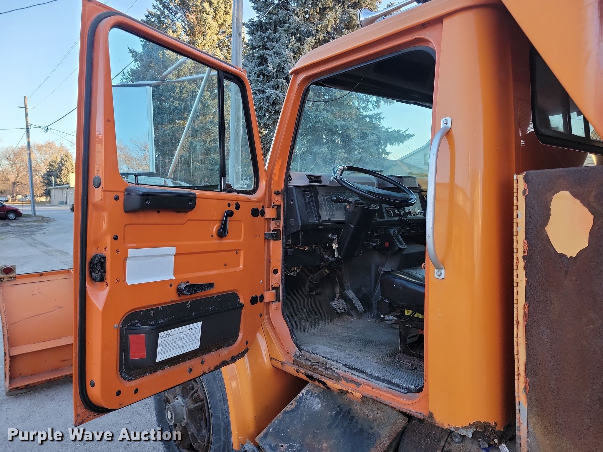 1996 International 4700 dump truck. Miles: 150,801 on odometer, Hours: 9,548 on meter, VIN: 1HTSCAAN8TH242396. Engine International DT466, Serial: 1824808, Displacement: 7.6L, Cylinders: 6, Fuel type: Diesel, HP: 210. Transmission Automatic. Chassis Double frame, Axles: Single, Suspension: Spring, Brakes: Air. Interior Heat, Heated mirrors, Brake controller. Features Dump bed 10' L x 98" W, Side height: 24", Bed type: Steel, Ram: Single , End gate: Manual, Spreader Monroe, Plow Valk IA-1142, Width: 132". Tires Size: 11R22.5. Notes Bed rust damage. Iowa title. Seller is a government entity who will be assigning and distributing the title. Please contact the seller for distribution questions. Humboldt CSD. 25 5th st. Dakota City, IA 50529
