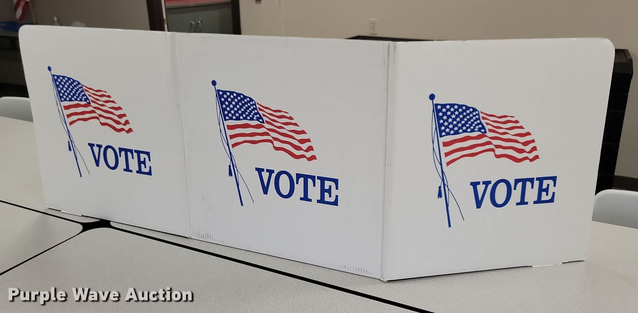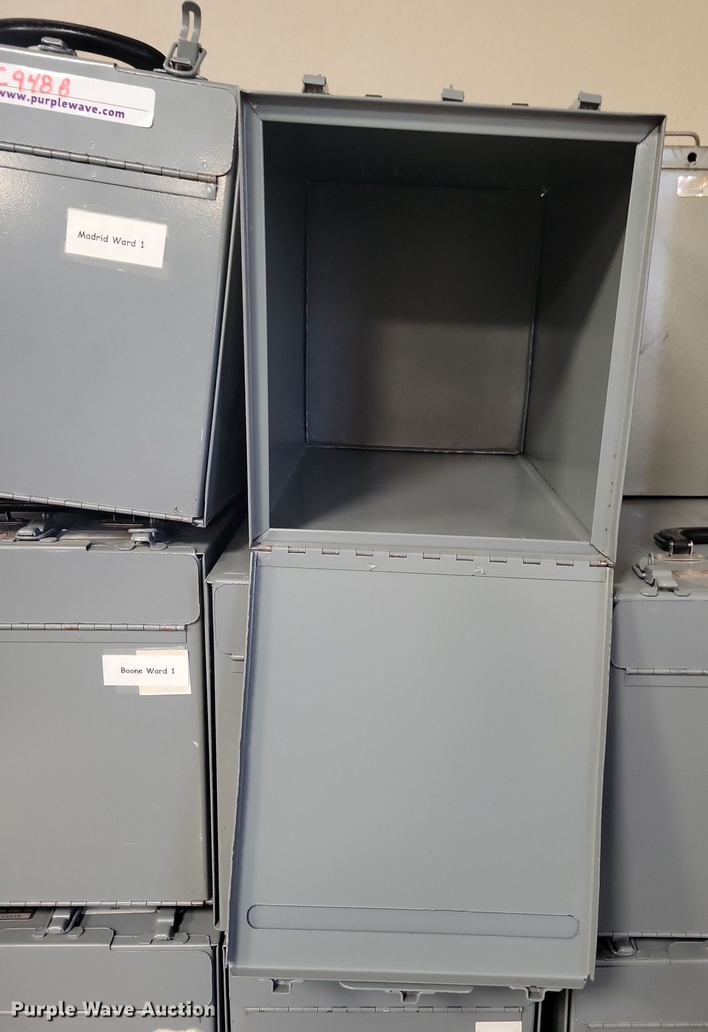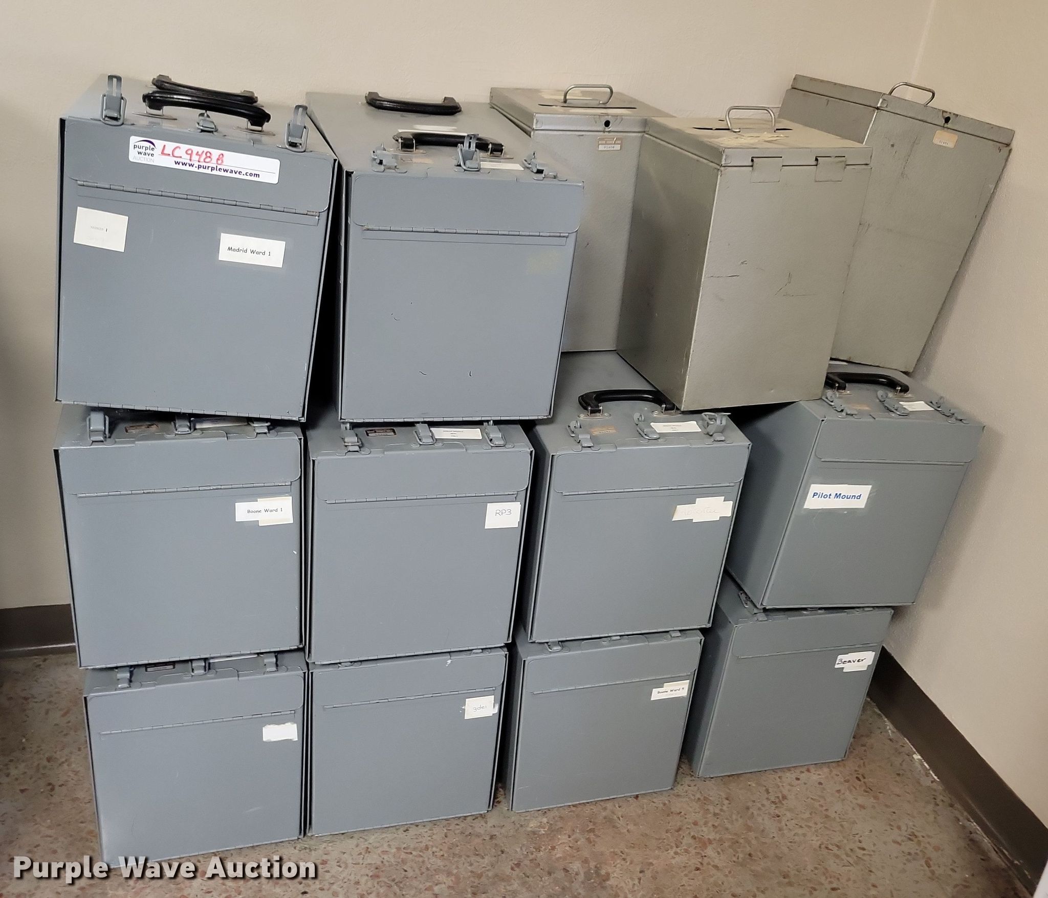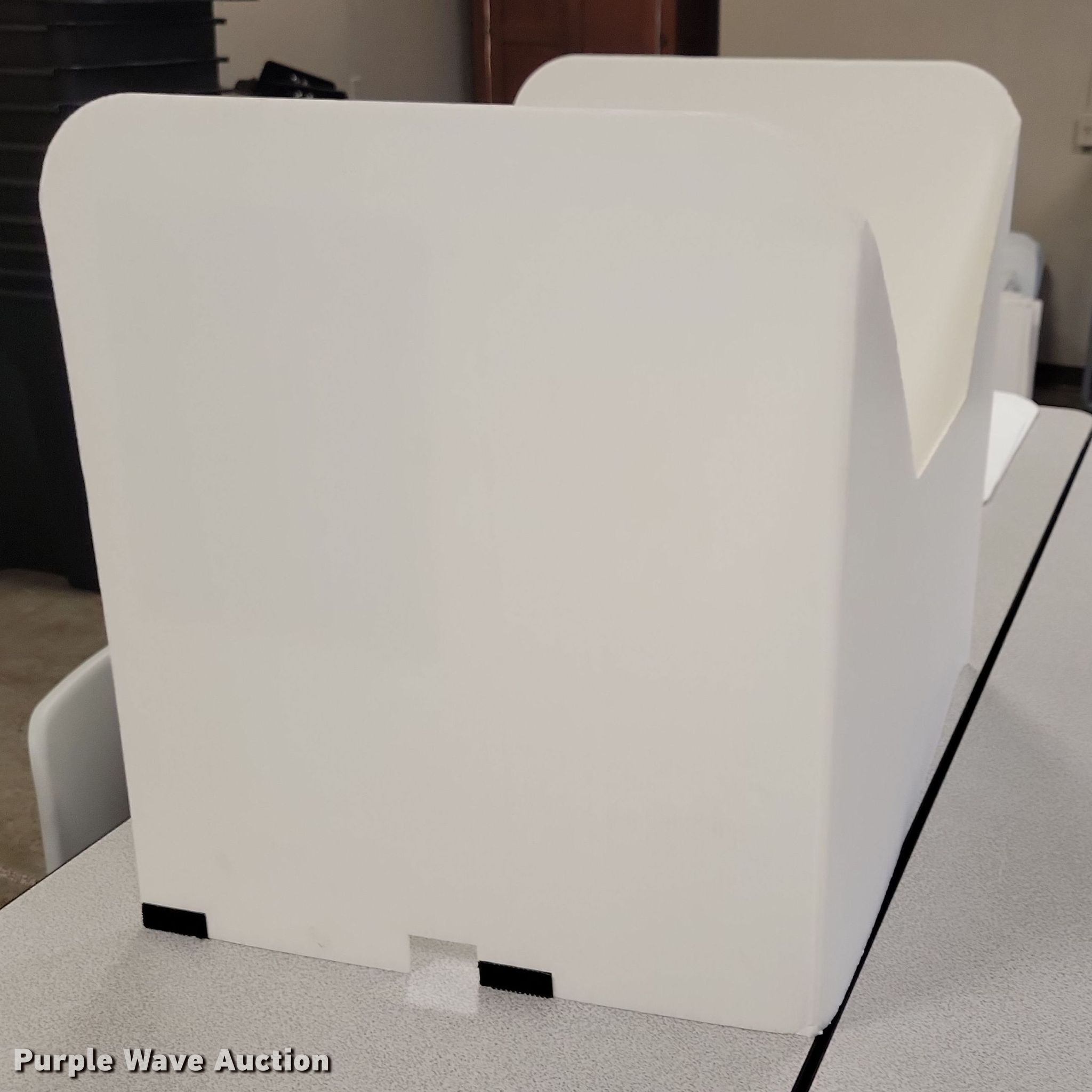 Purple Wave is selling a used Office Supplies and Equip. in Iowa. This item is a Voting equipment with the following: Approx. (68) cardboard voting booths, (13) ballot boxes