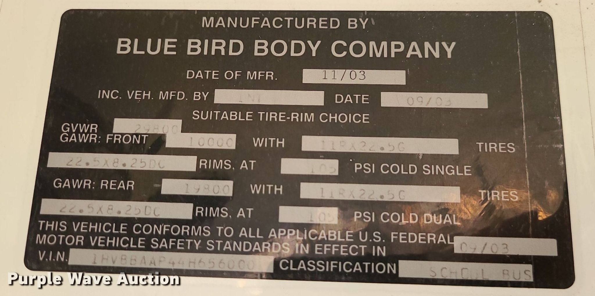 Purple Wave is selling a used Bus in Missouri. This item is a 2004 Blue Bird school bus with the following: Miles: 162,404 on odometer, VIN: 1HVBBAAP44H656000