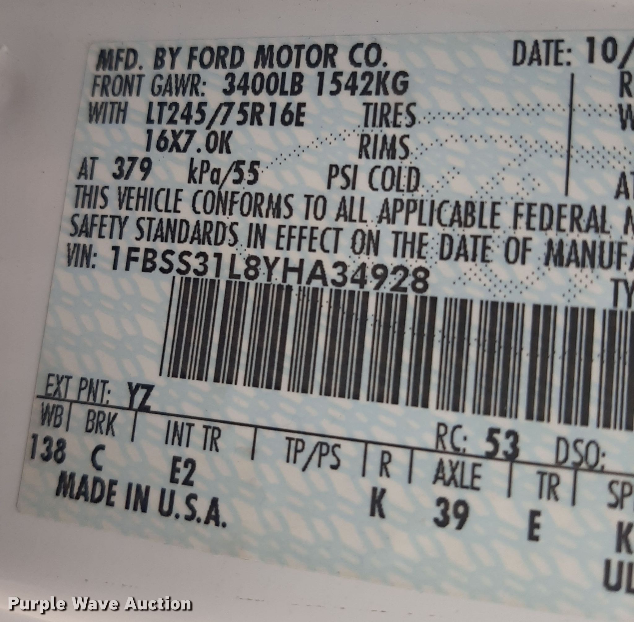 Purple Wave is selling a used Passenger Vehicle in Kansas. This item is a 2000 Ford E350 van with the following: Miles: 152,021 on odometer, VIN: 1FBSS31L8YHA34928