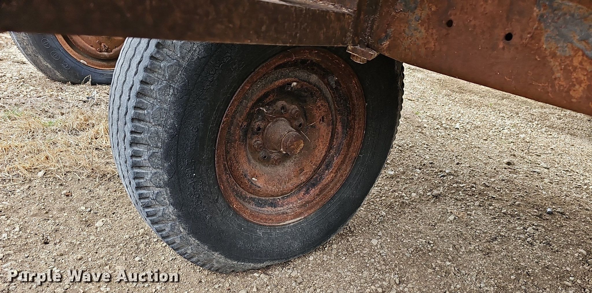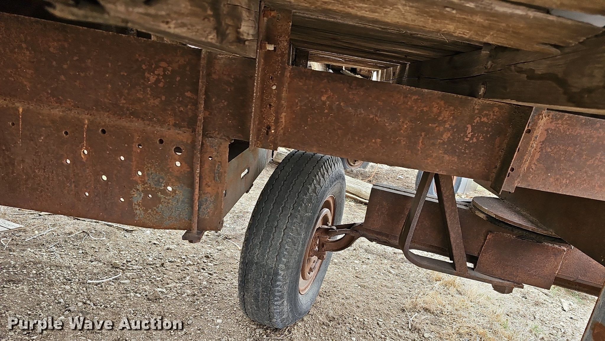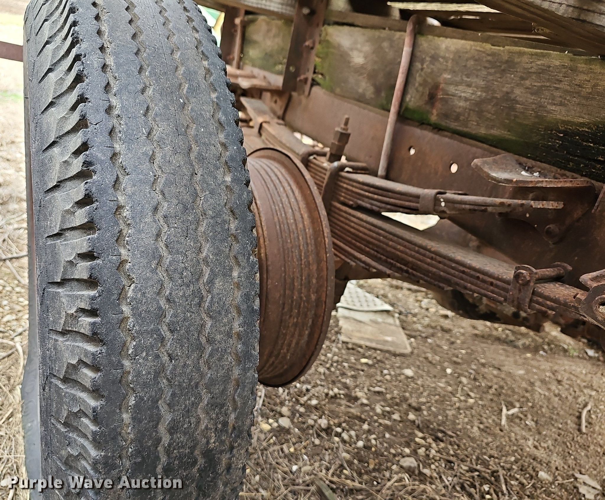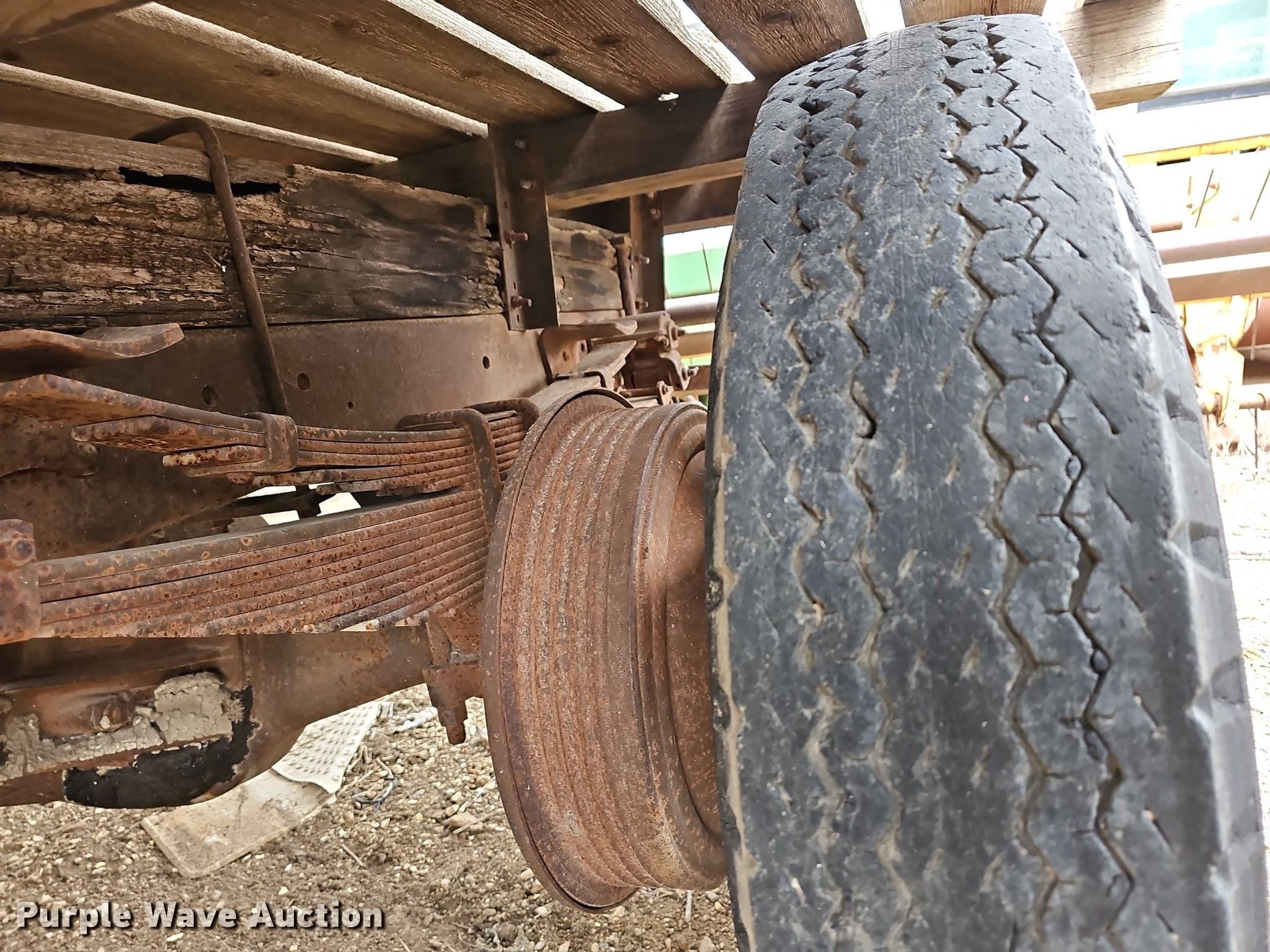 Hay wagon. Unit #: 32. Dimensions Length: 15'. Features Wood floor. Chassis Hitch: Pin, Suspension: Spring. Tires Front: 7.00-15, Rear: 7.50-20. Notes Tire damage, Contents not included. Manhattan, KS 66503