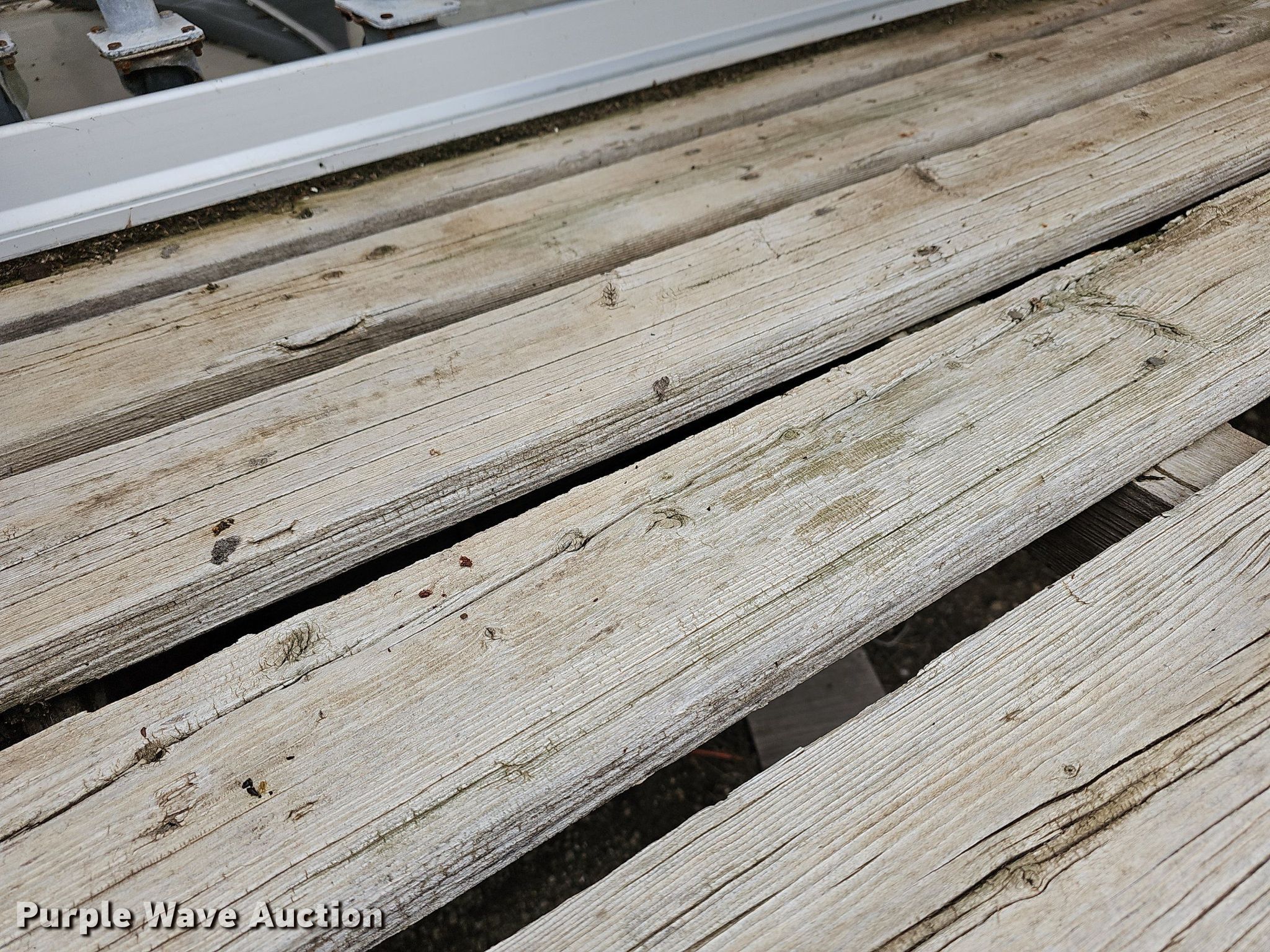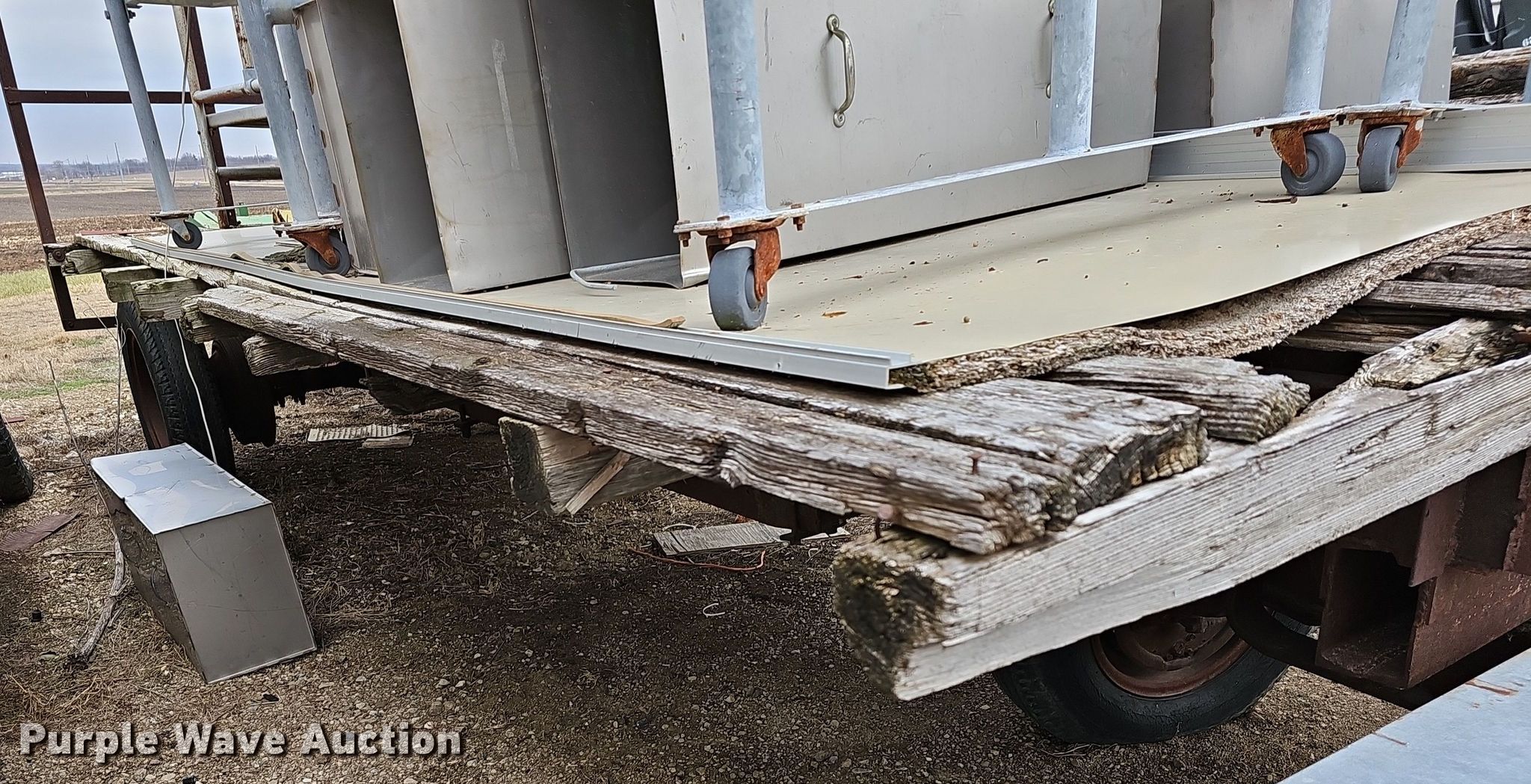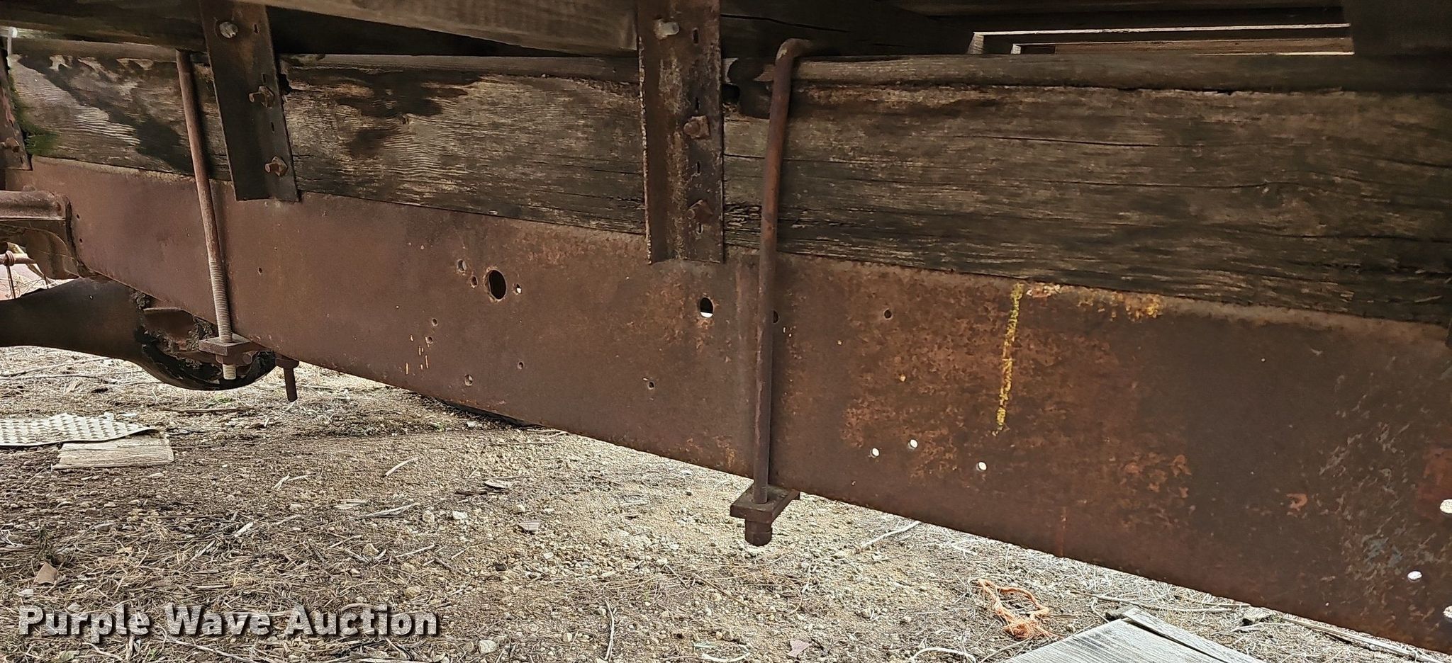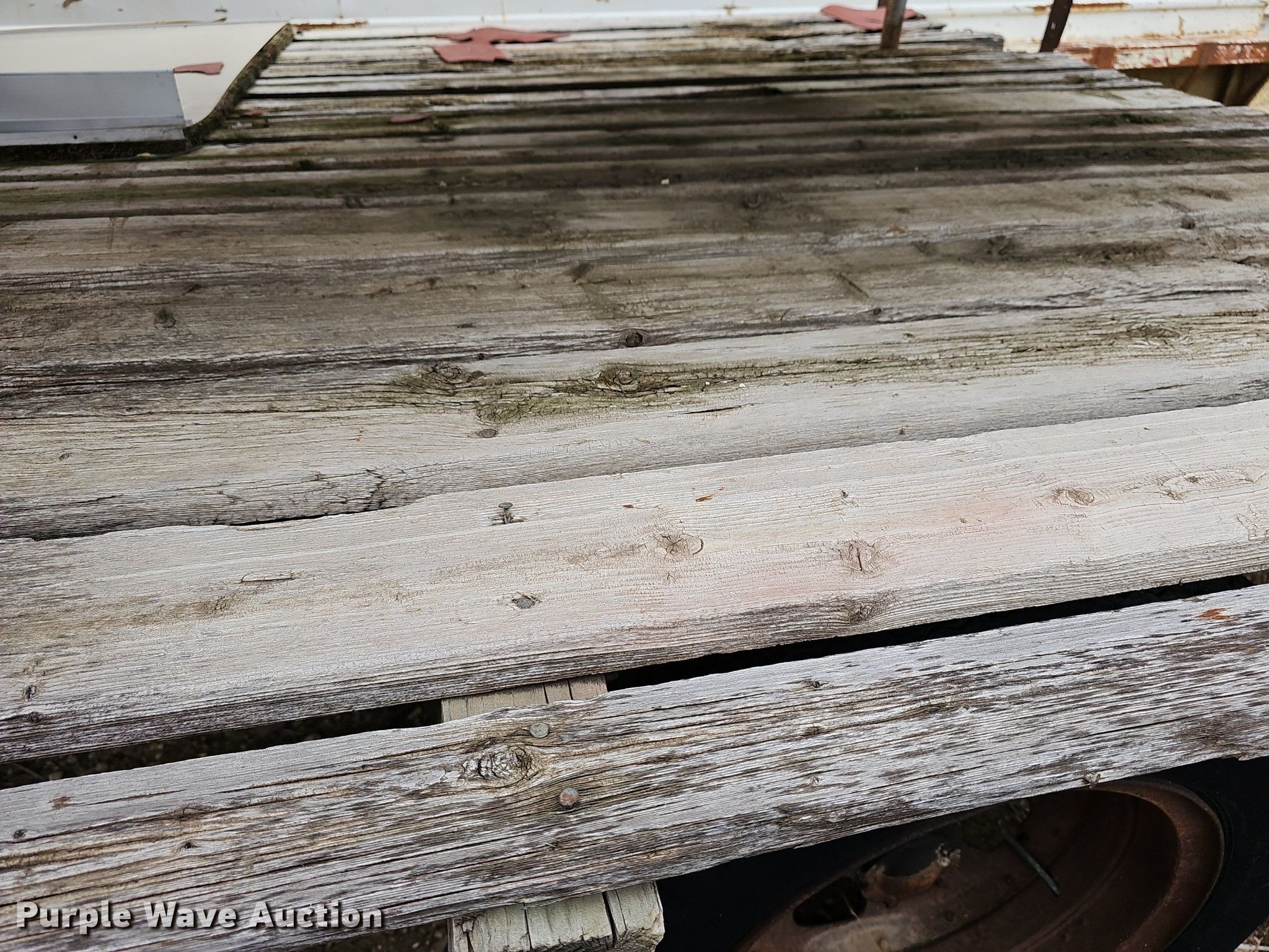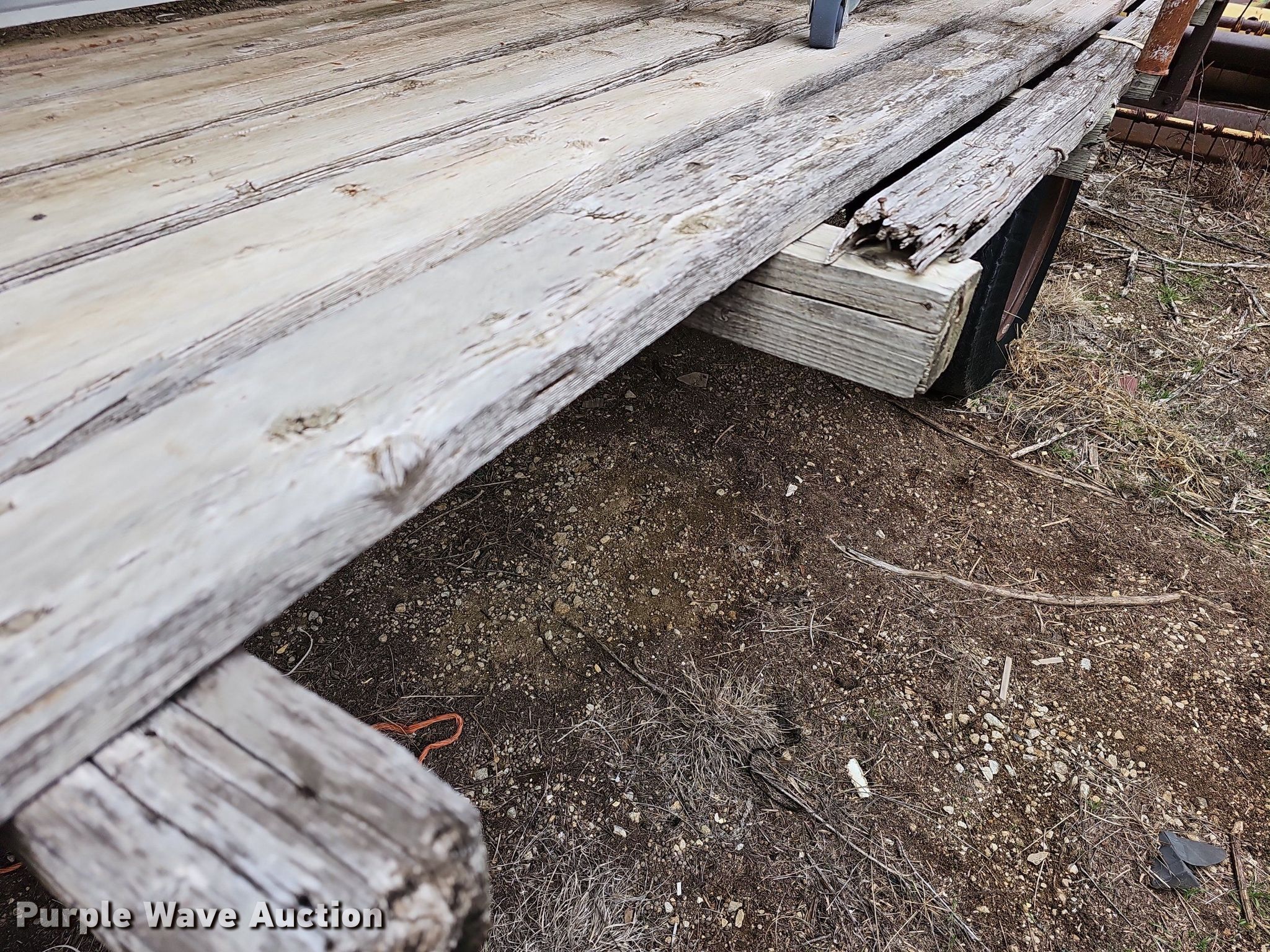 Hay wagon. Unit #: 32. Dimensions Length: 15'. Features Wood floor. Chassis Hitch: Pin, Suspension: Spring. Tires Front: 7.00-15, Rear: 7.50-20. Notes Tire damage, Contents not included. Manhattan, KS 66503
