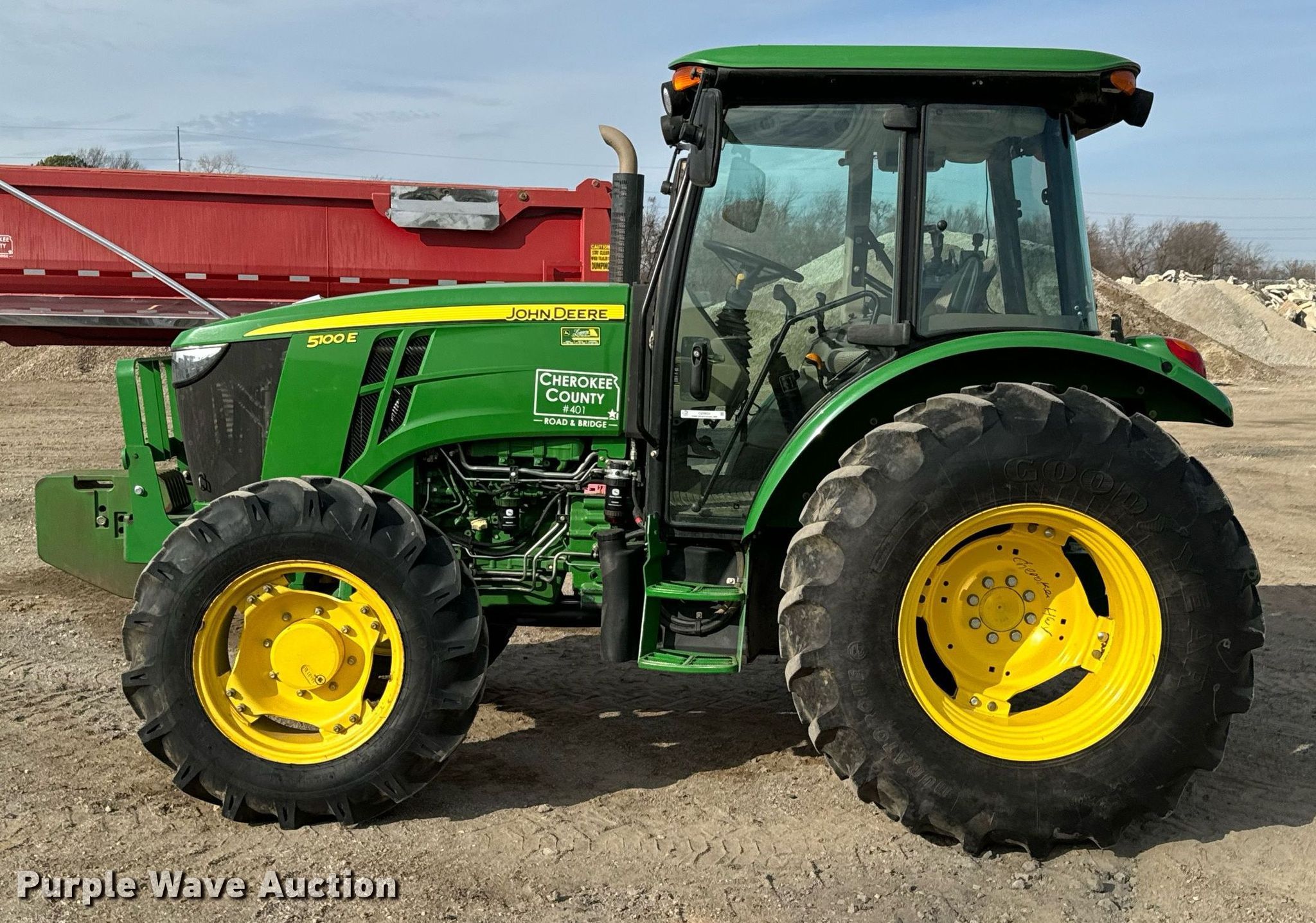 2014 John Deere 5100E MFWD tractor. Hours: 2,041 on meter, Serial: 1LV5100EVEY240959. Engine Cylinders: 4, Fuel type: Diesel. Transmission Synchro, 12F - 12R, Left-hand reverser. Operators station AC, Heat. Features PTO: 540, Three point, Hydraulic remote sets Rear: 2, Suitcase weights: 6. Tires Front: 12.4-24, Rear: 18.4-30. Cherokee County Road and Bridge. Columbus, KS 66725