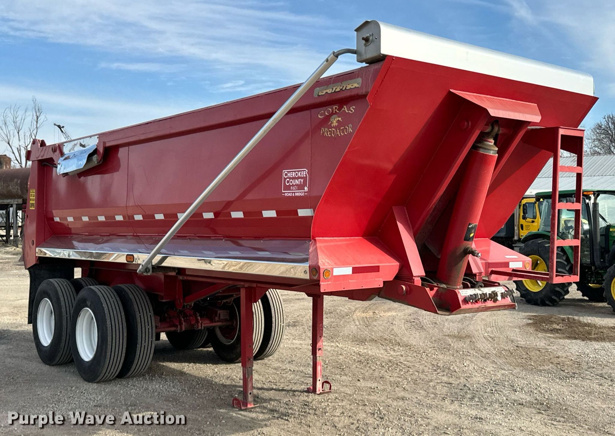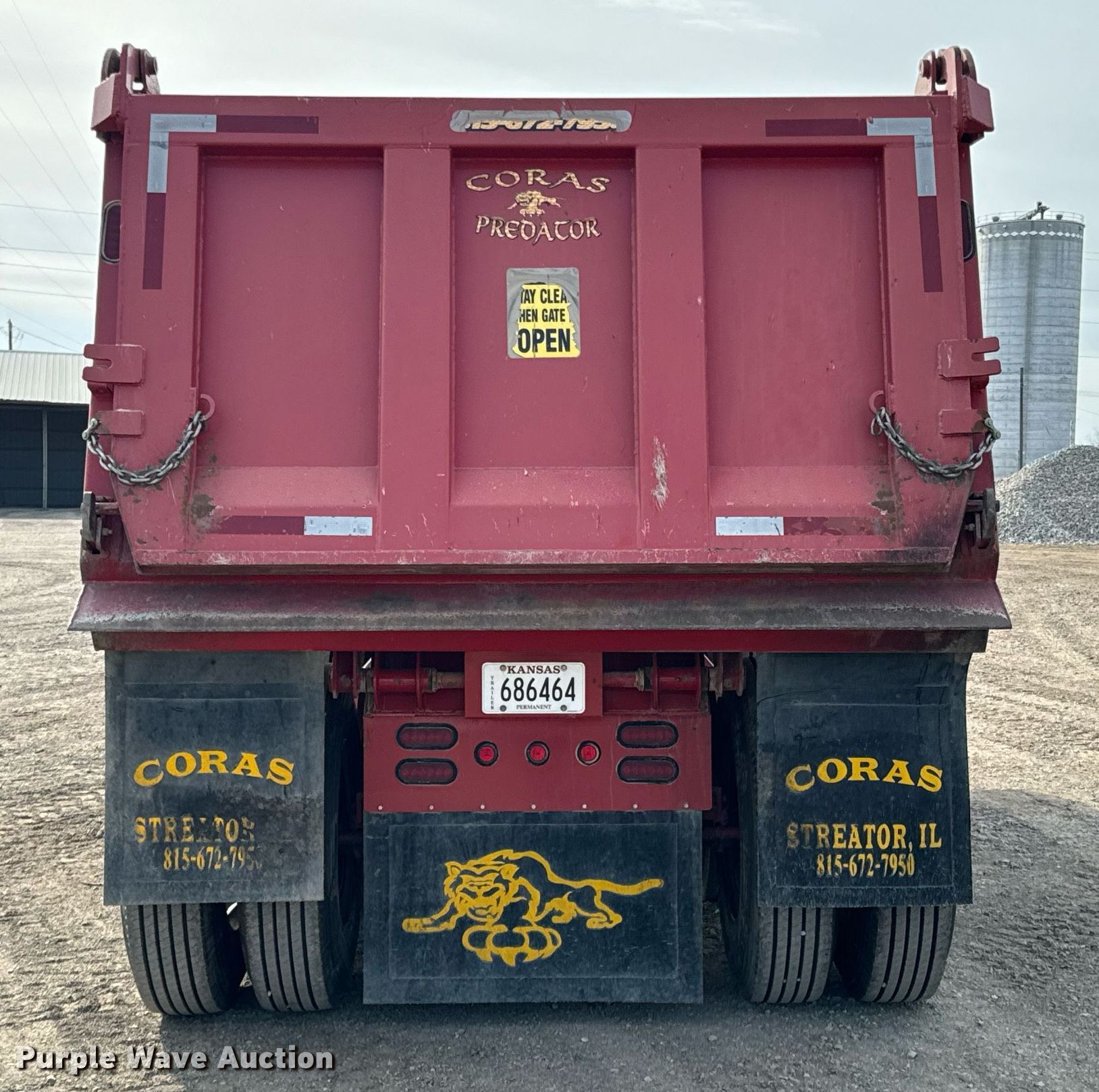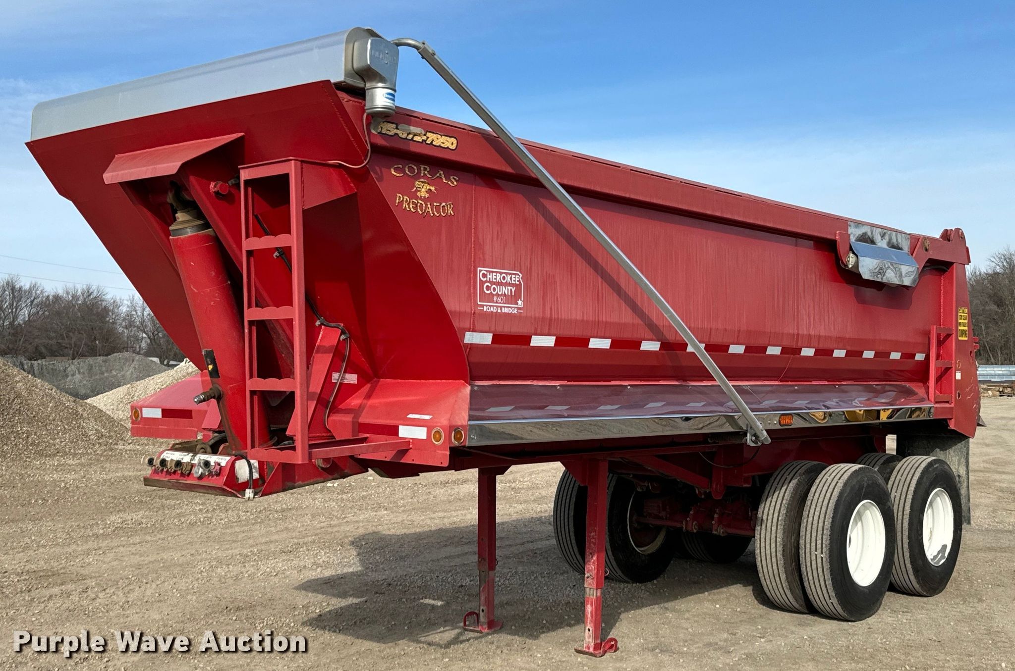 2018 Coras end dump trailer. VIN: 4C9C5D321JS072147. Dimensions Overall: 23' L x 8' W, Side height: 55". Features Body type: Steel, Ram: Single, End gate: Air operated, Roll tarp. Chassis Landing gear: Dual, Suspension: Spring, Brakes: Air, Axles: Tandem, GVWR: 56,000 lbs. Tires Steel wheels, Size: 12R22.5. Kansas title. Title distribution may be delayed up to 14 days from verification of funds. Cherokee County Road and Bridge. Columbus, KS 66725