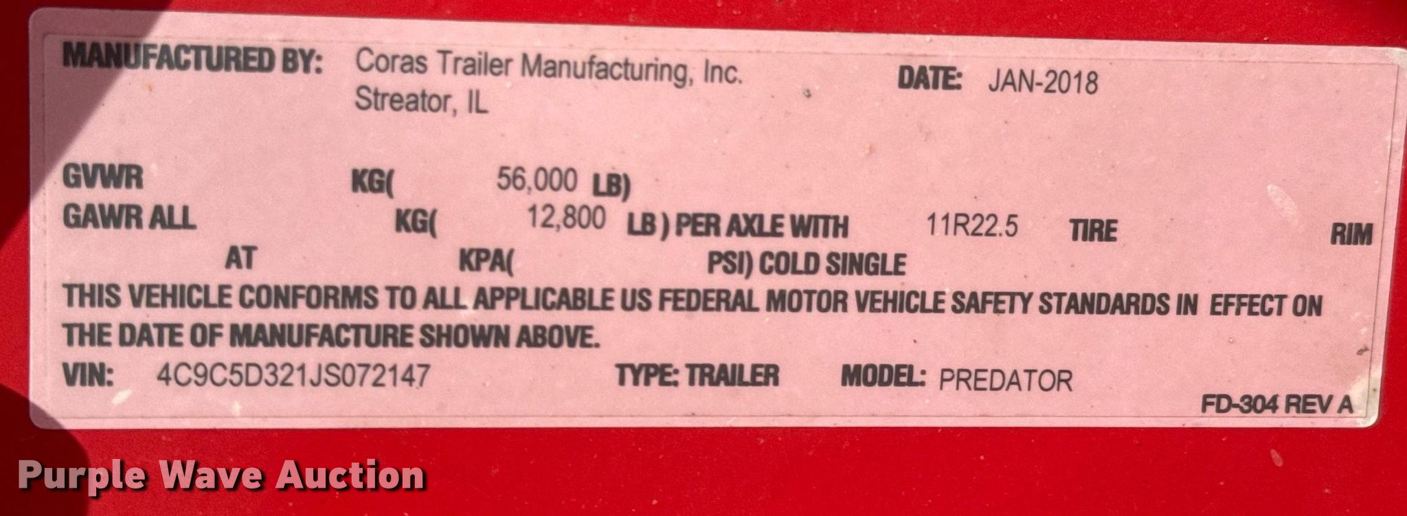 Purple Wave is selling a used End Dump Rock Trailer in Kansas. This item is a 2018 Coras end dump trailer with the following: VIN: 4C9C5D321JS072147