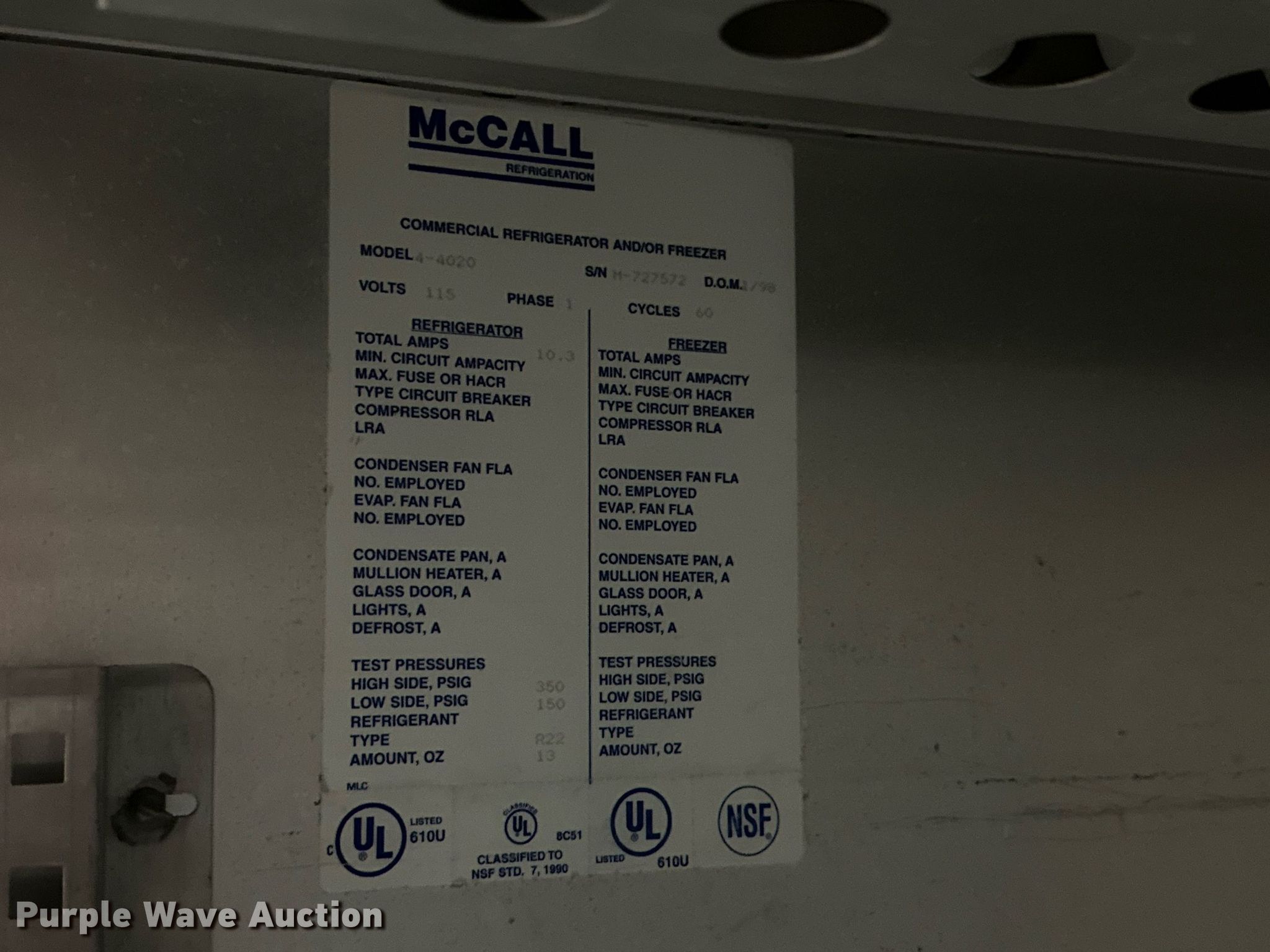 Purple Wave is selling a used Restaurant Equip. in Kansas. This item is a McCall 4-4020 refrigerator with the following: Serial: M-727572, 28" x 82" x 32", Phase: Single, Volts: 115