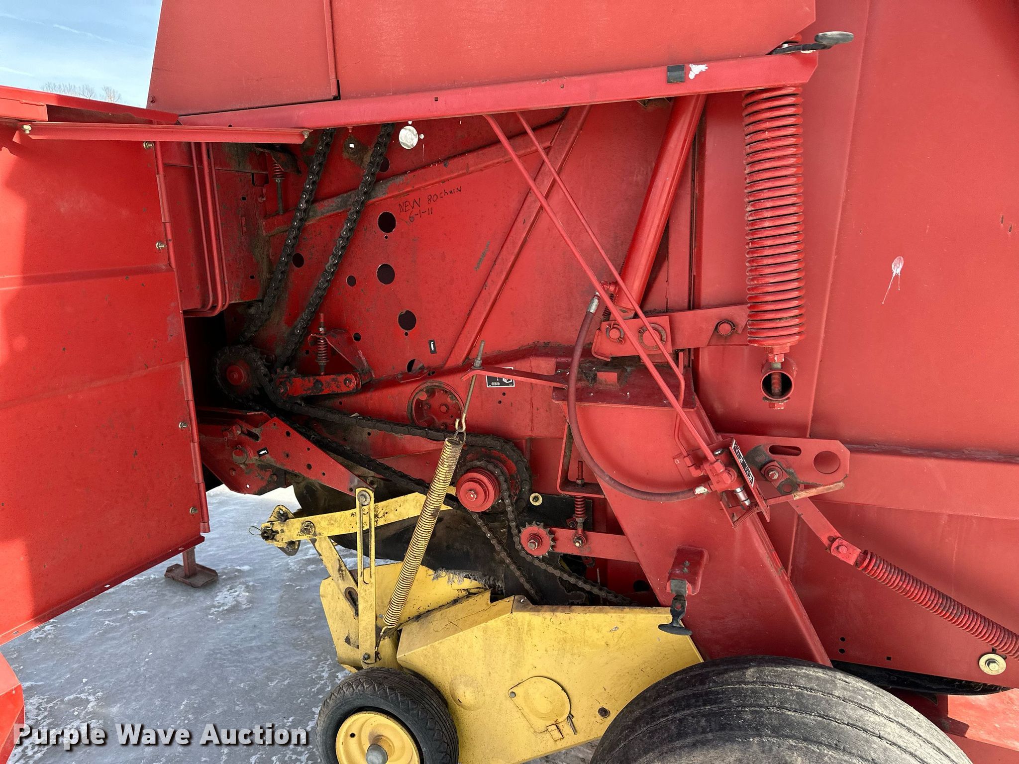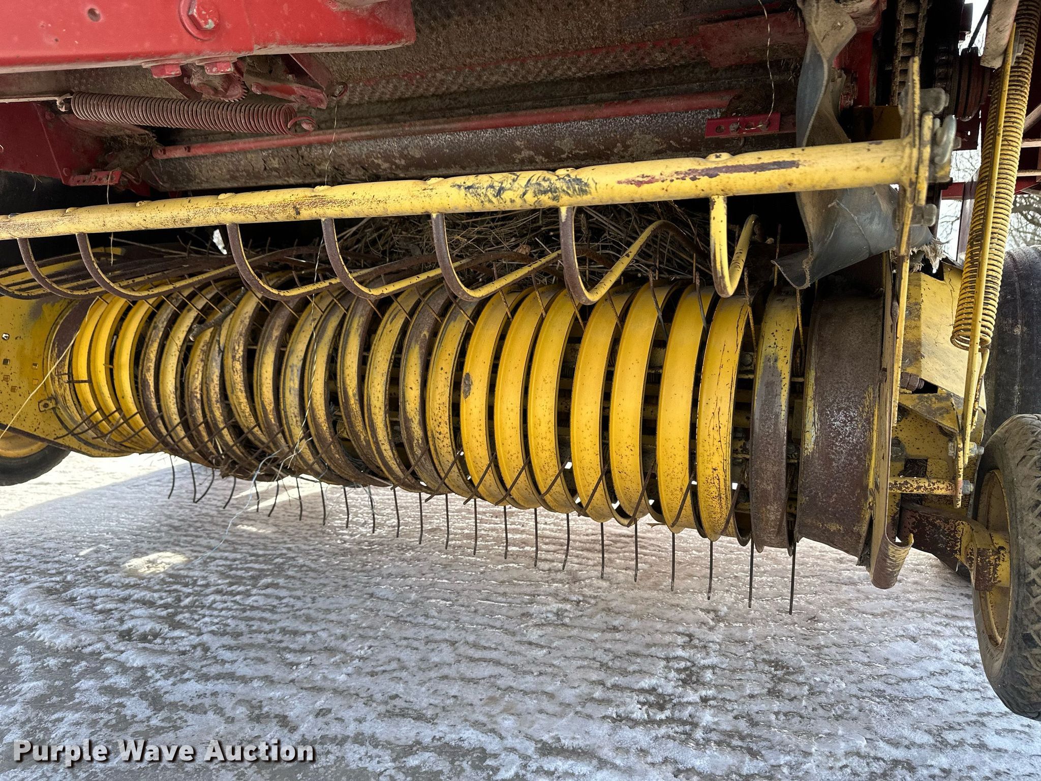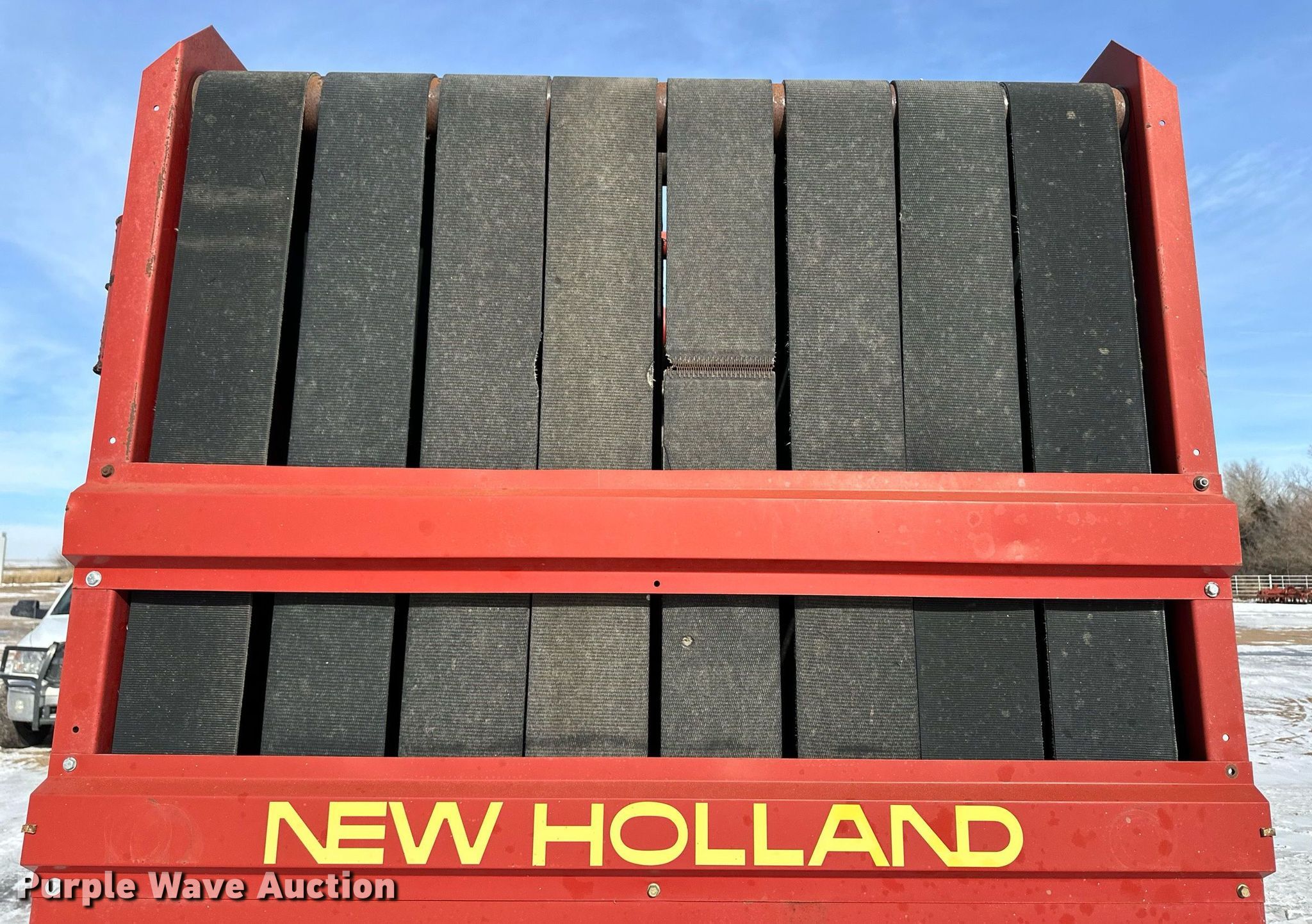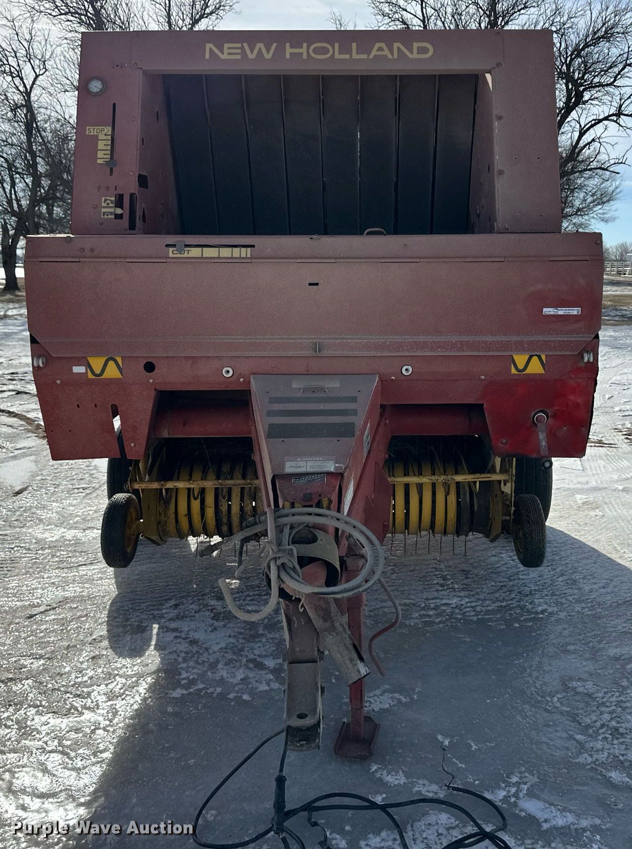 1994 New Holland New Holland round baler. Serial: 894043. Features PTO: 540, Monitor, Gauge wheels Size: 4.80-8, Pickup width: 5' 8", Hydraulic pickup lift, Twine tie, Bale ramp. Tires Size: 11L-14SL. Notes PTO shaft removed but included. Kinsley, KS 67547