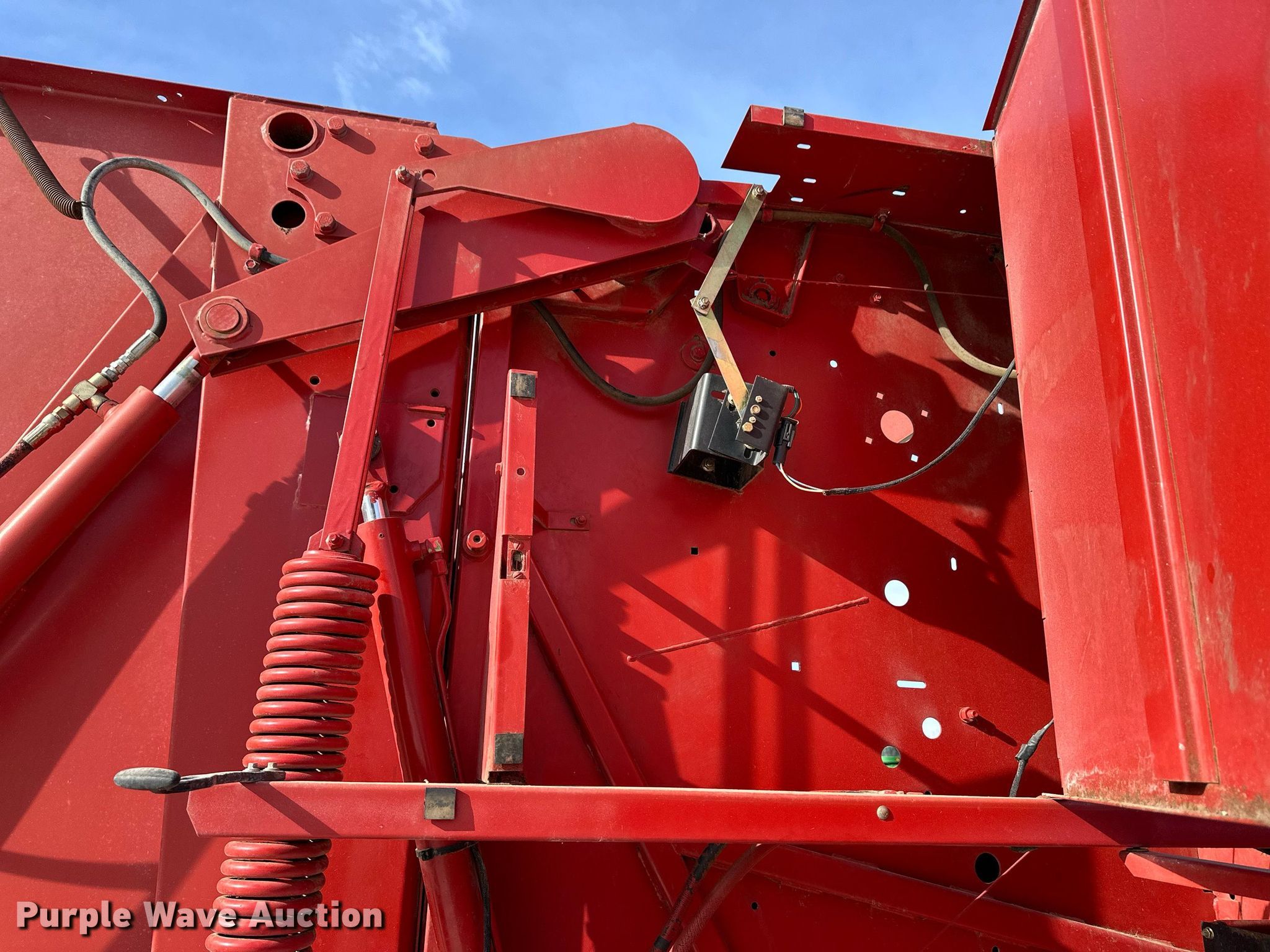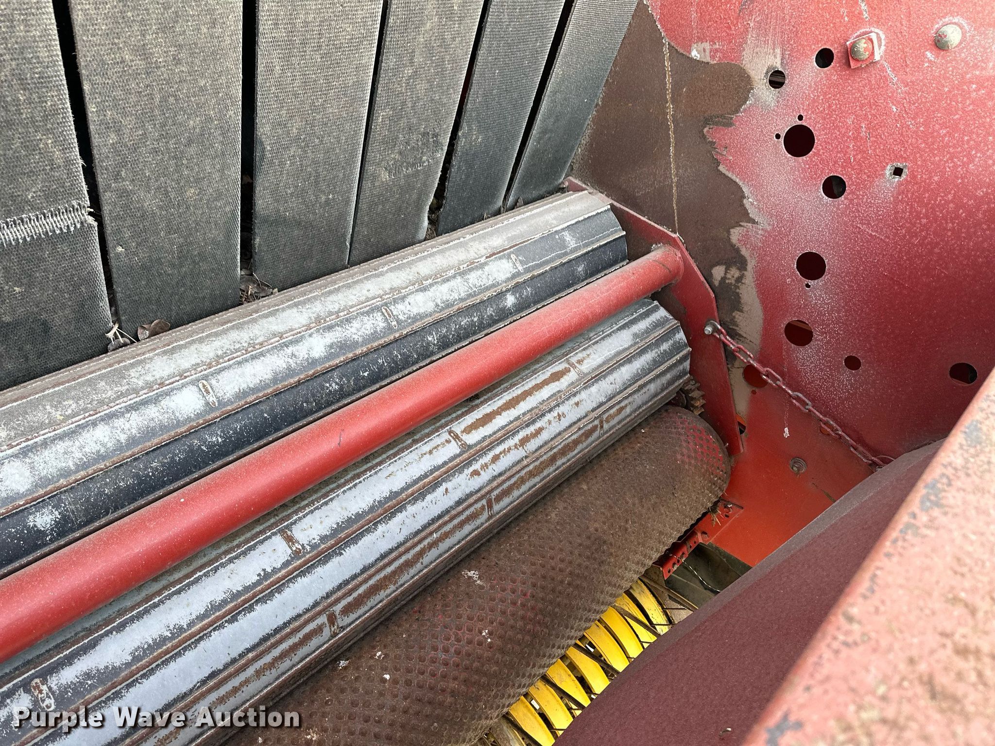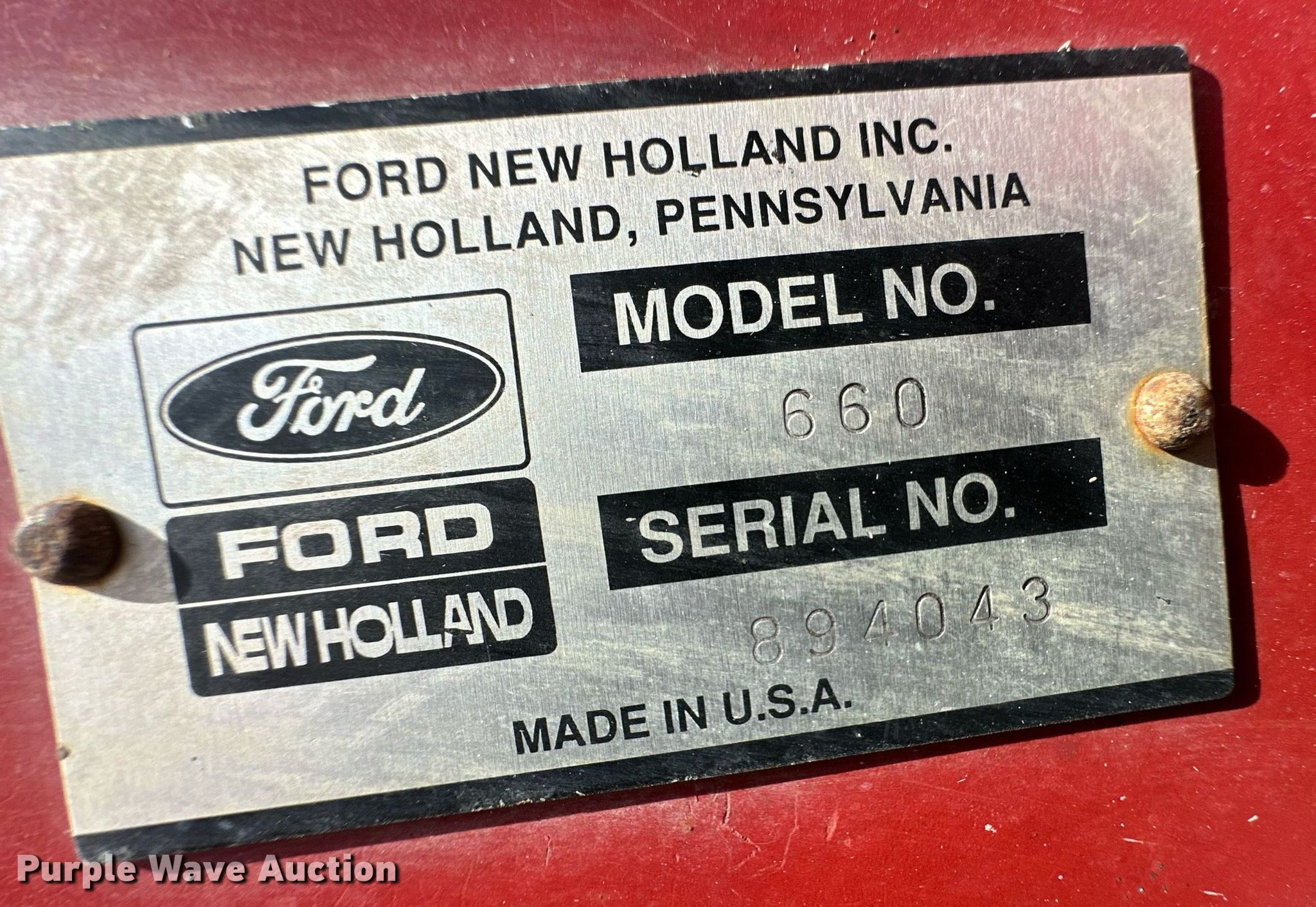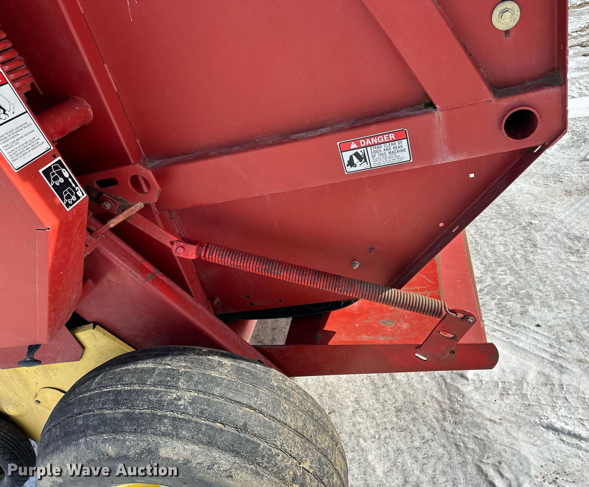 1994 New Holland New Holland round baler. Serial: 894043. Features PTO: 540, Monitor, Gauge wheels Size: 4.80-8, Pickup width: 5' 8", Hydraulic pickup lift, Twine tie, Bale ramp. Tires Size: 11L-14SL. Notes PTO shaft removed but included. Kinsley, KS 67547