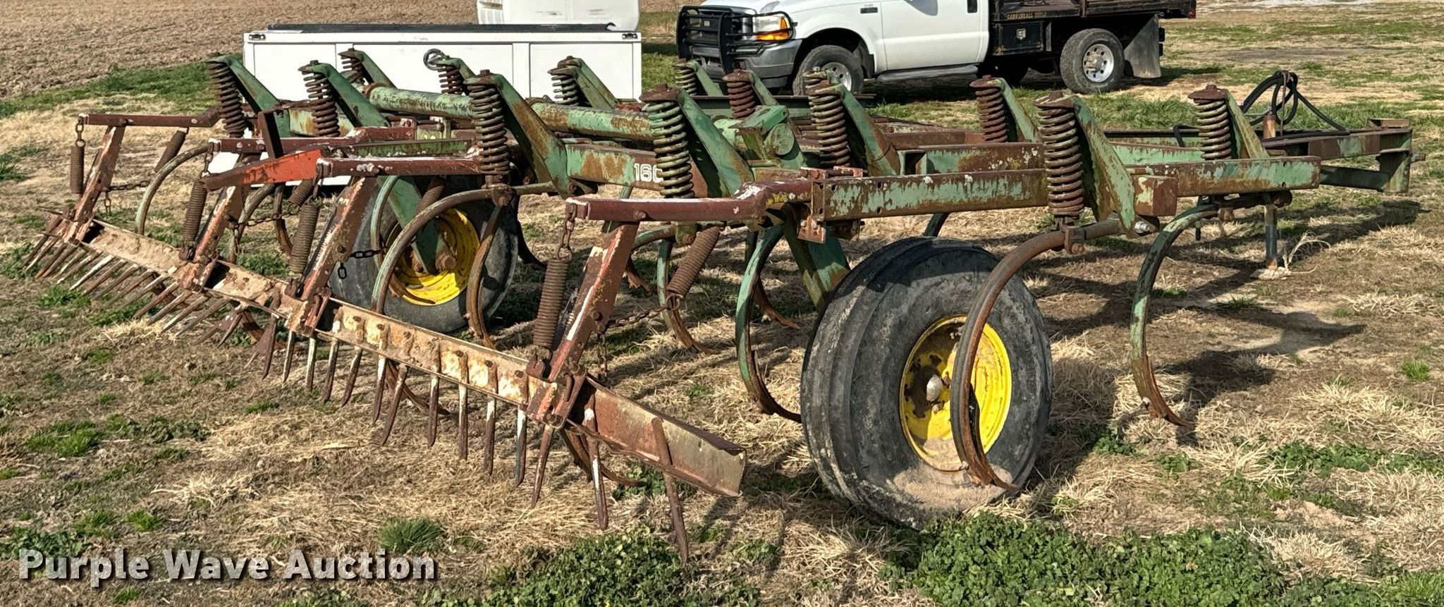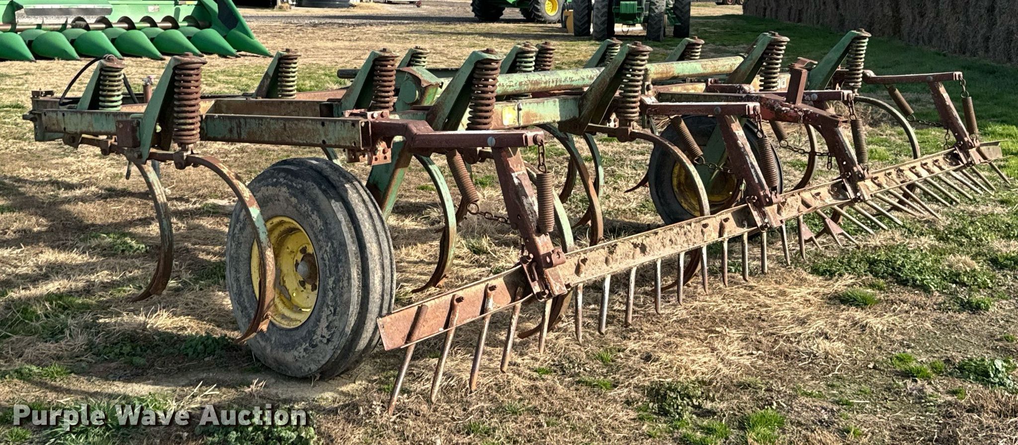 John Deere chisel. Overall width: 13'. Features Shanks: 15, Operation Hydraulic lift, Attachments Spike tooth harrow Harrow bars: 1.. Tires Tire size: 10.00-16. Jennings Farms. Quapaw, OK 74363