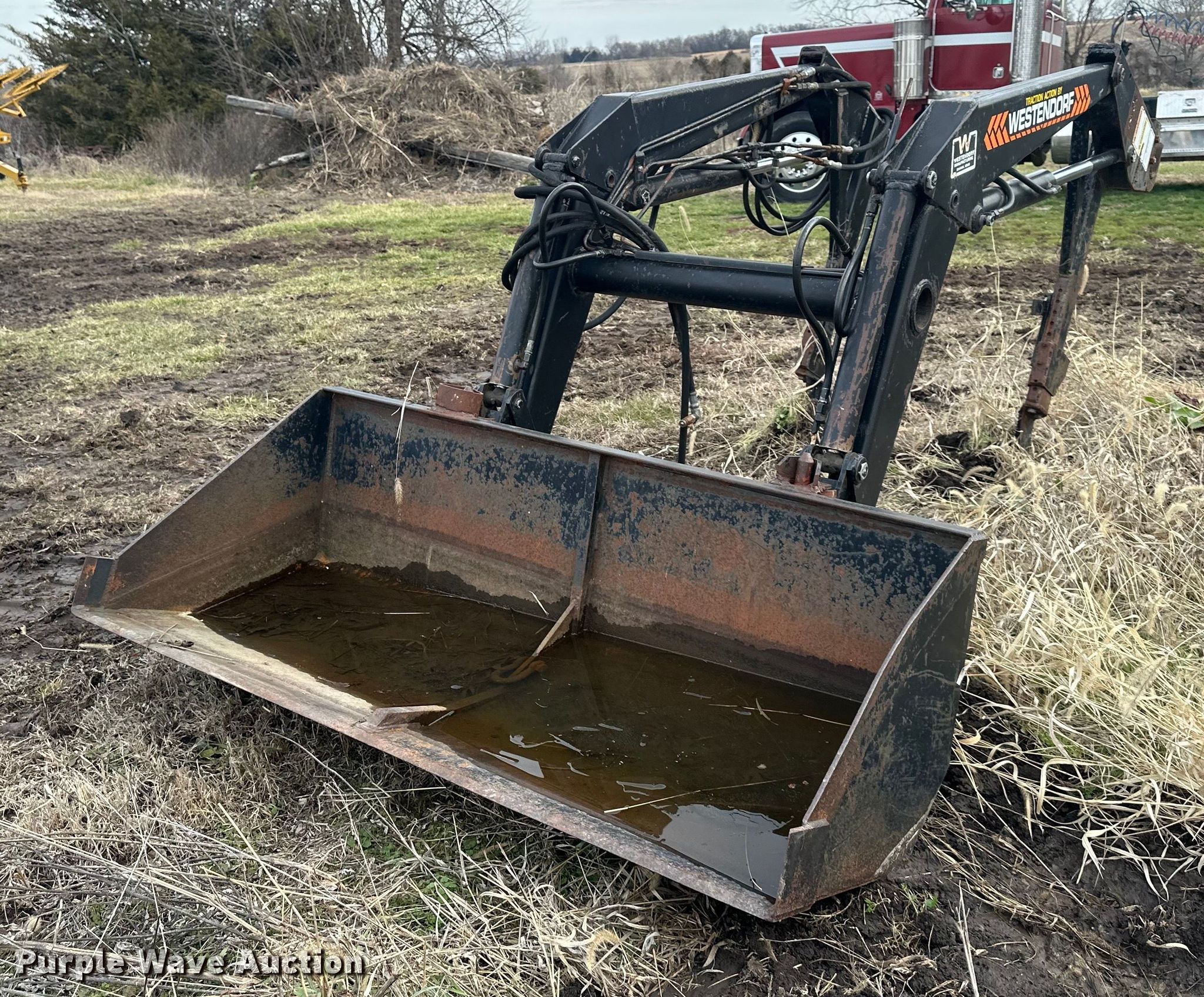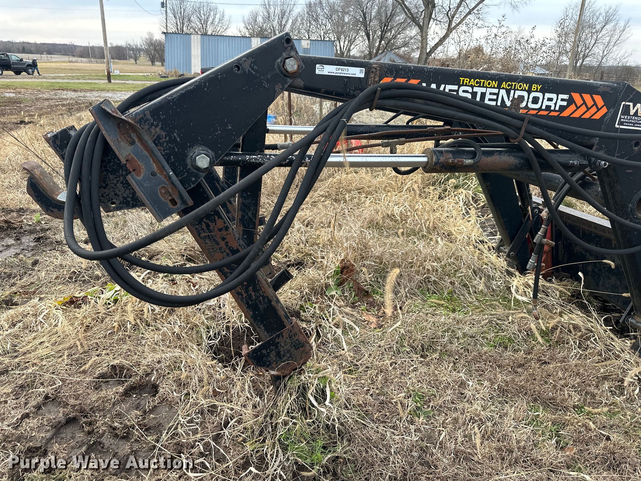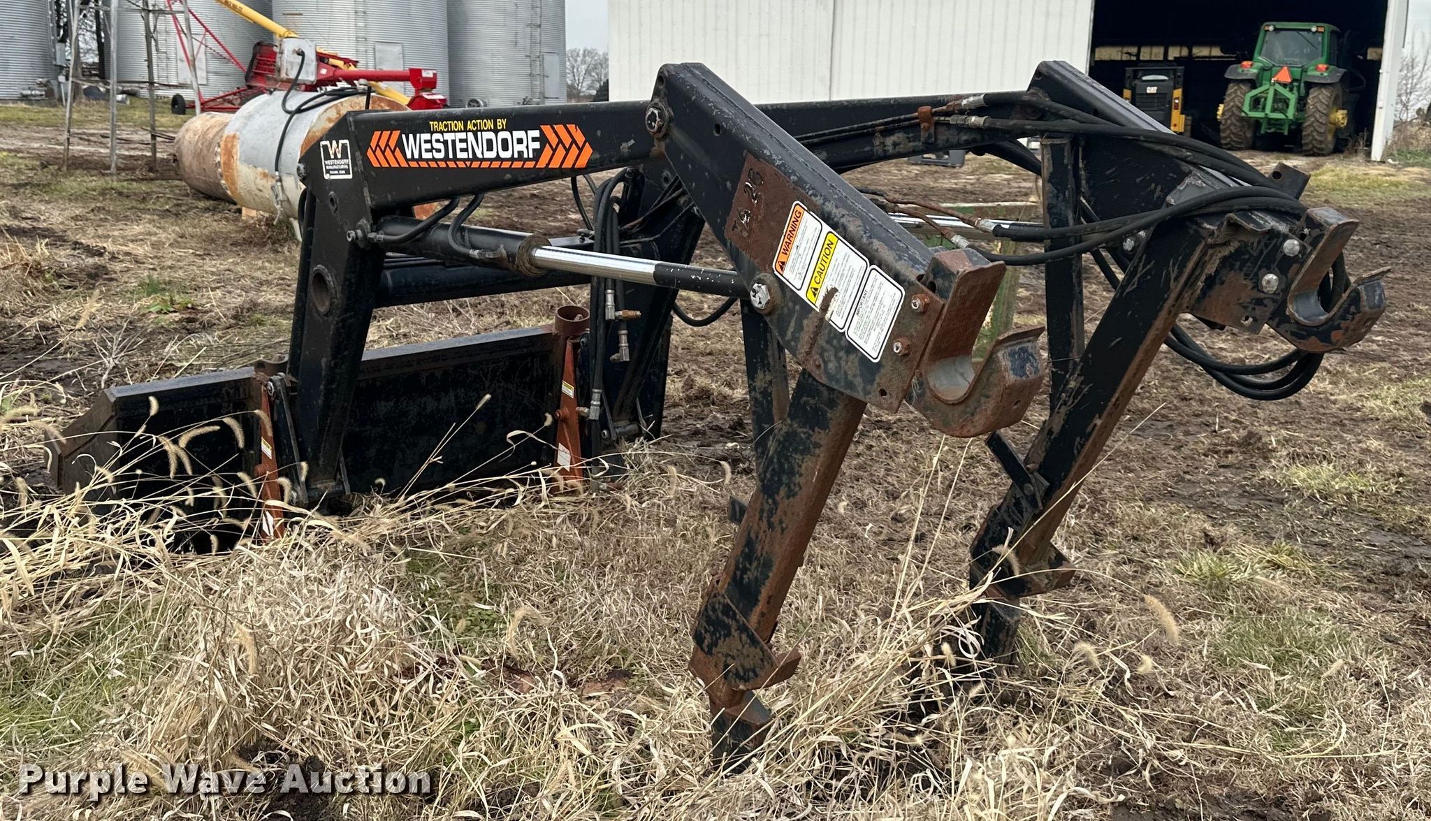 Purple Wave is selling a used Ag Tractor Loader or Attach. in Kansas. This item is a Westendorf TA26 loader with the following: Quick attach, Bale spear, Bucket, Width: 73", Removed from John Deere 4055