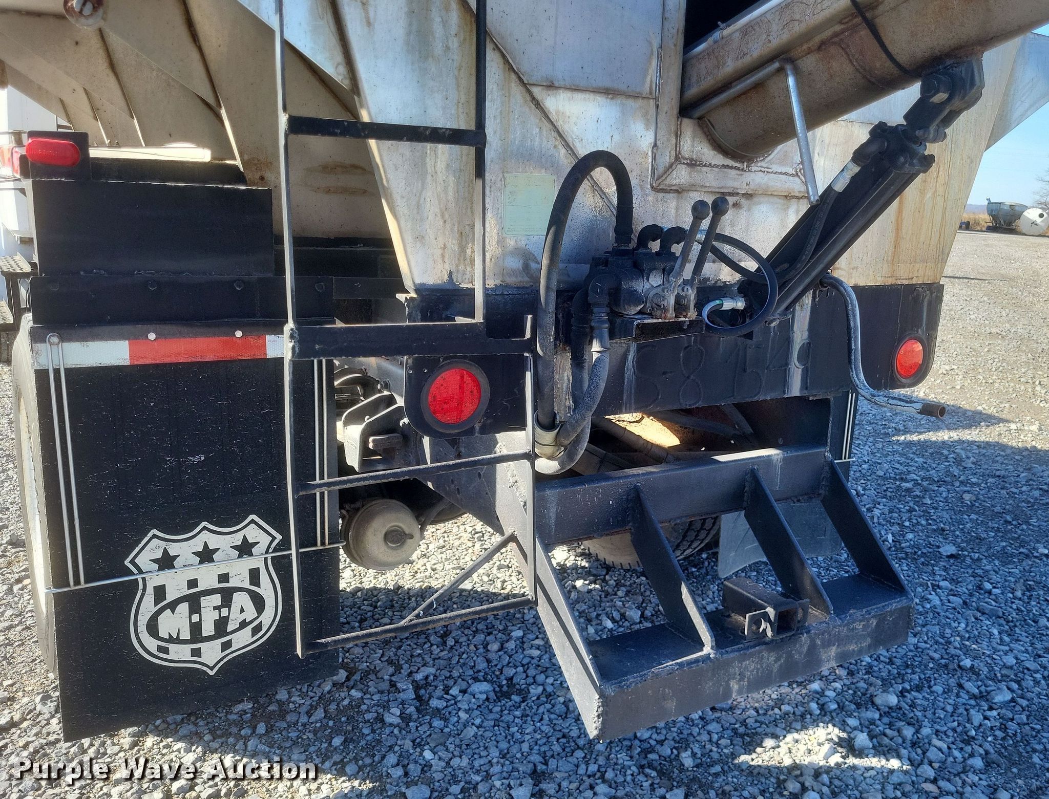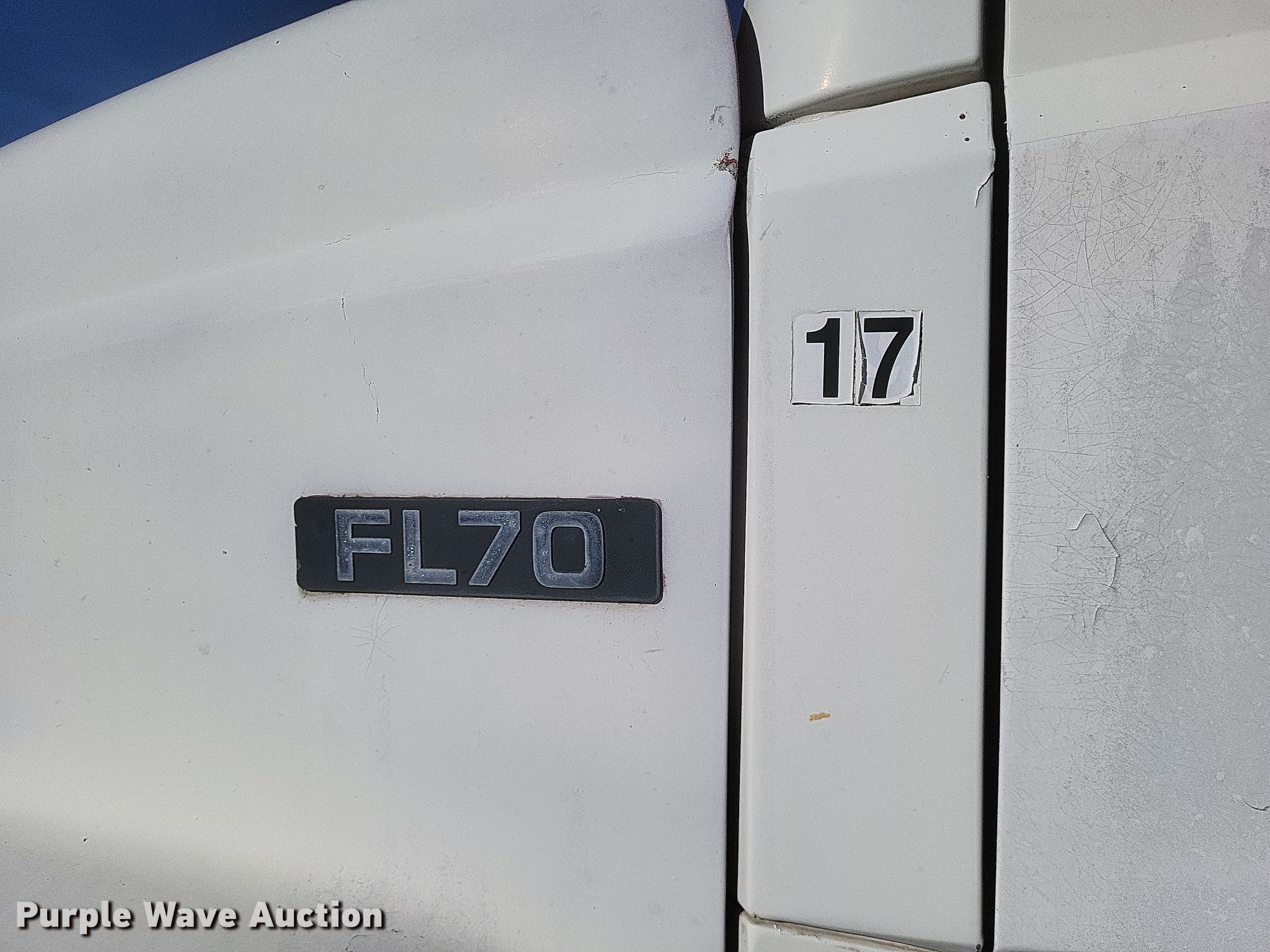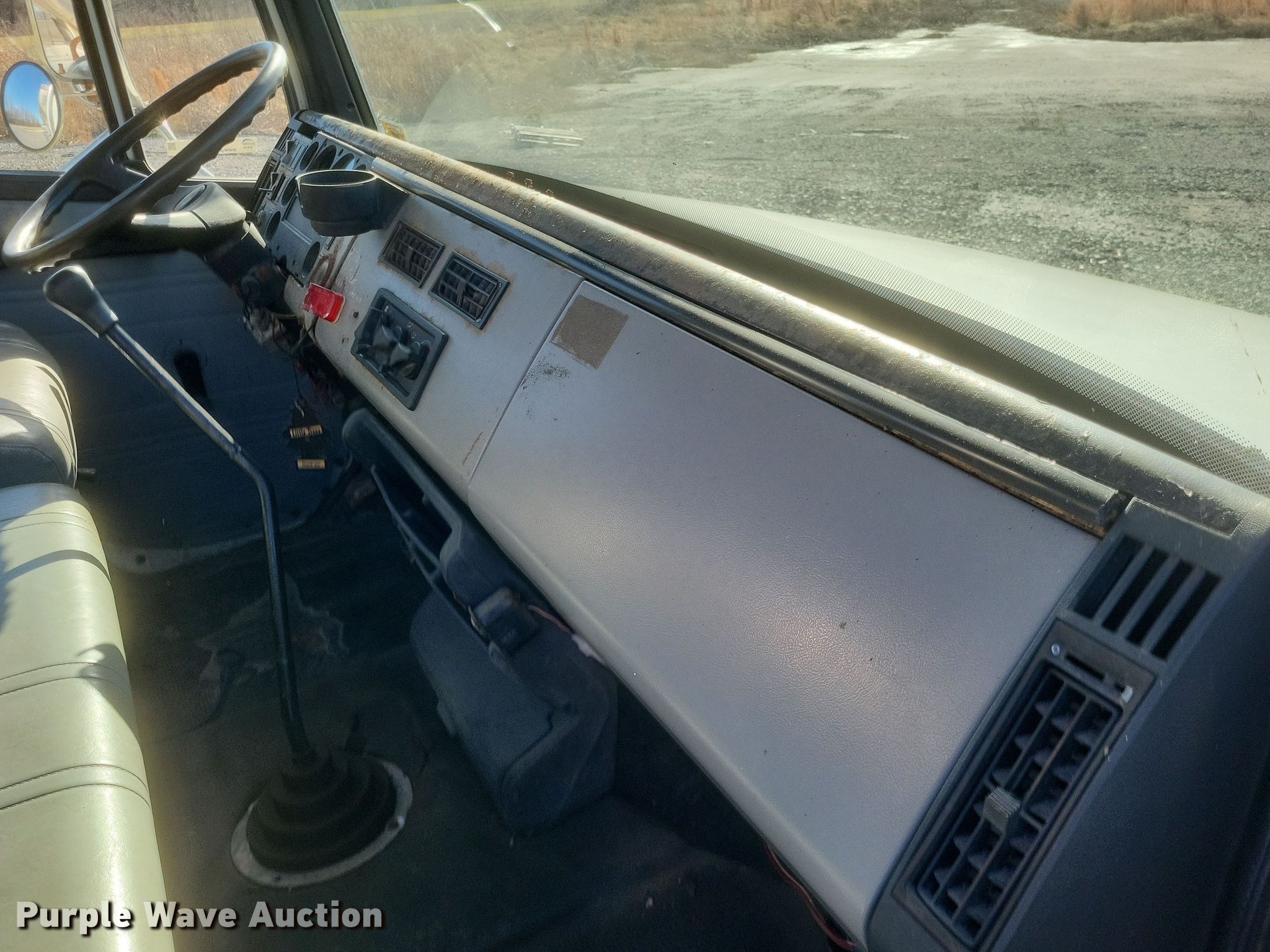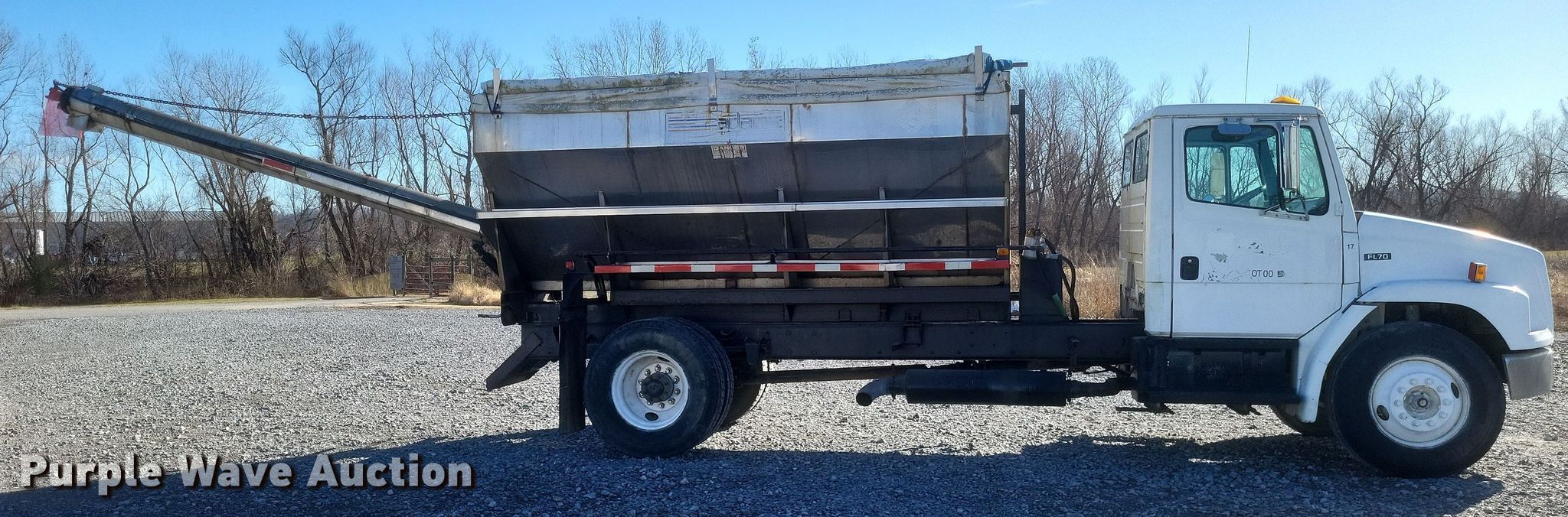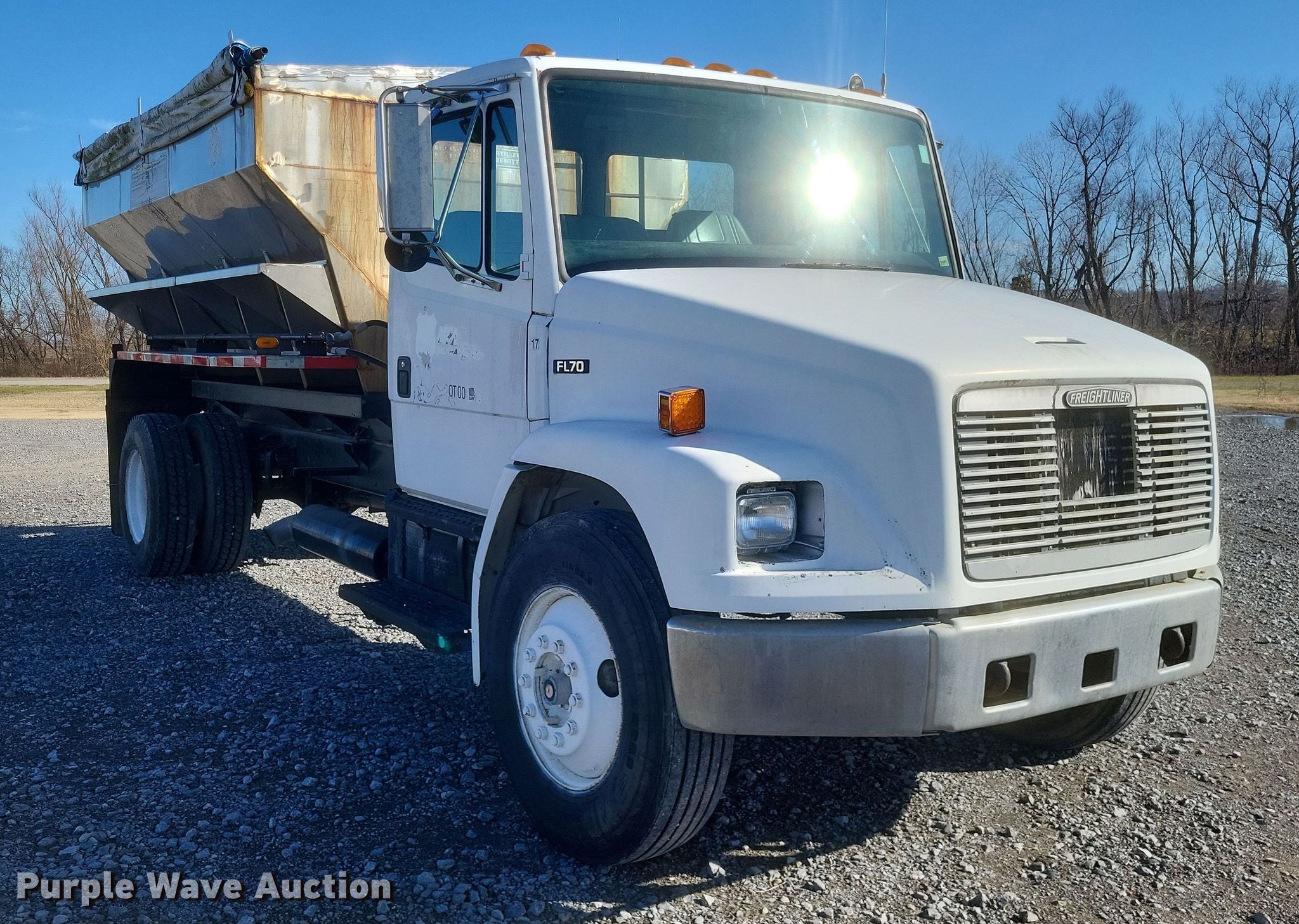 1995 Freightliner FL70 fertilizer delivery truck. Miles: 187,361 on odometer, VIN: 1FV6HFAA4SL548649. Engine Cummins, Displacement: 5.9L, Cylinders: 6, Fuel type: Diesel. Transmission Manual, Speed: 6. Chassis Axles: Single, Suspension: Spring, Brakes: Air, PTO, GVWR: 13,000 lbs. Interior AC, Heat. Features Delivery bed Adam, 13' L, Capacity: 8 tons, Compartments: 2, Discharge auger Diameter: 9", Length: 14', Rear, Tarp, Ground controls. Tires Size: 11R22.5. Notes Driver door latch issues. Title distribution may be delayed up to 14 days from verification of funds. MFA INC.. 1980 Cummins Drive. Chaffee, MO 63740