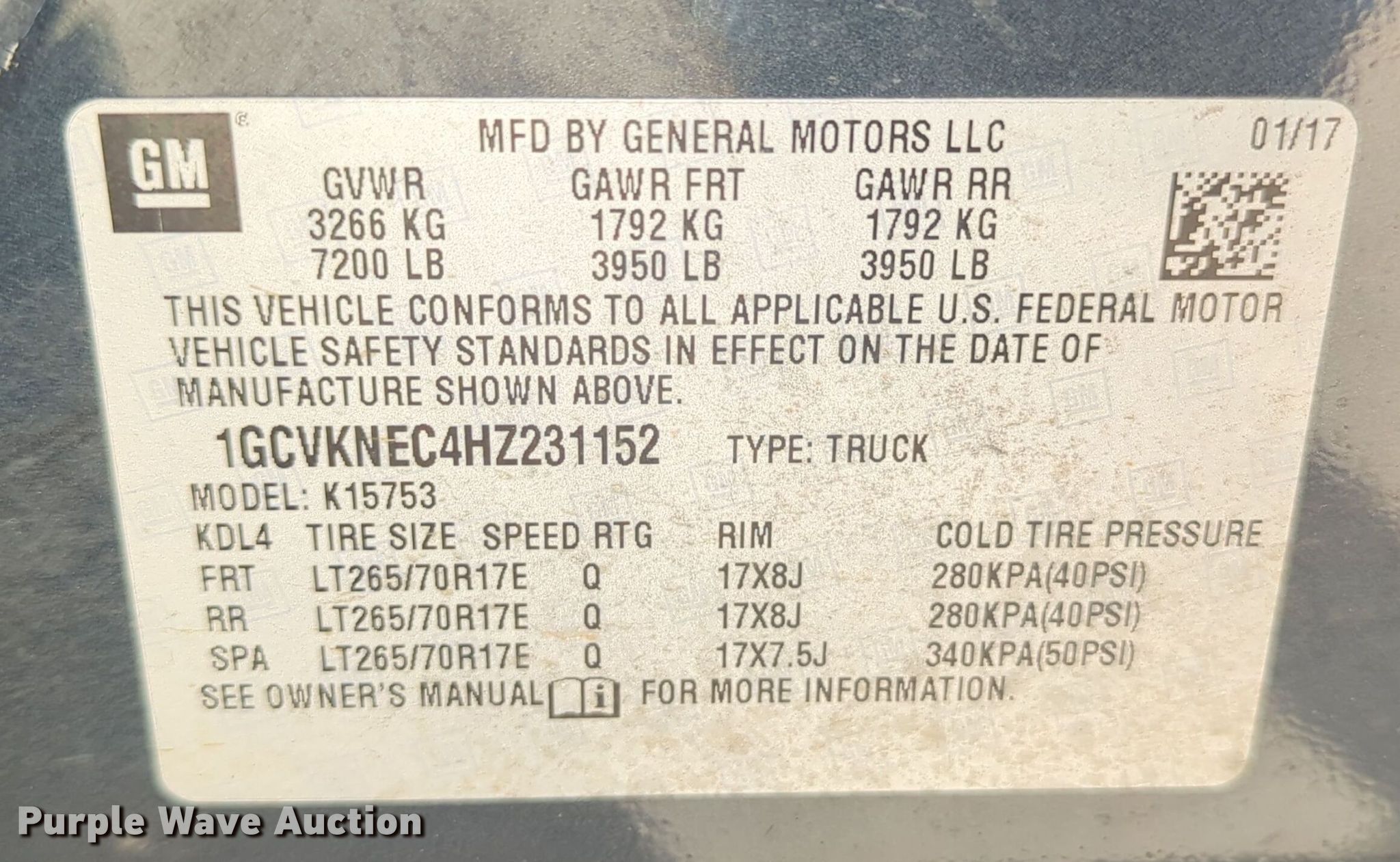 Purple Wave is selling a used 1/2 Ton Pickup or Van in Oklahoma. This item is a 2017 Chevrolet Silverado 1500 Double Cab pickup truck with the following: Miles: 112,283 on odometer, VIN: 1GCVKNEC4HZ231152, Unit #: 231152