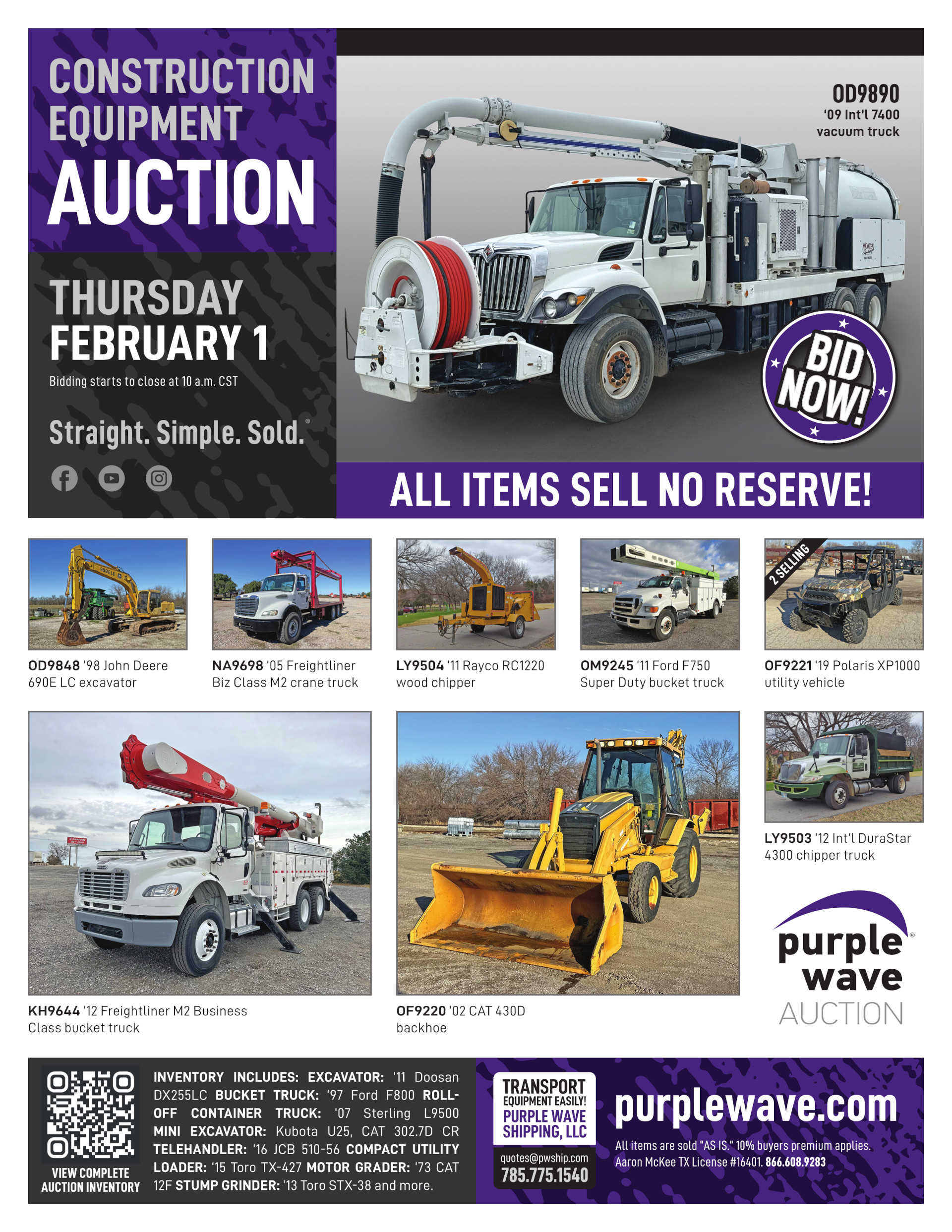 Purple Wave Shipping, LLC provides shipping and transportation services to winning bidders on ag, construction and fleet type assets. Purple Wave Shipping, LLC does not provide shipping on items weighing less than 1,000 pounds.