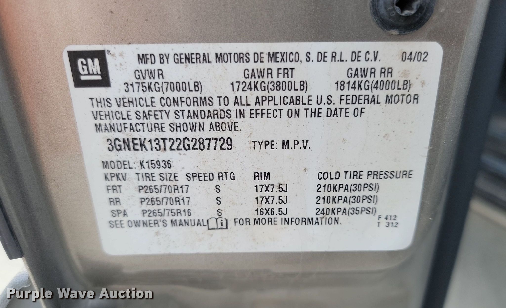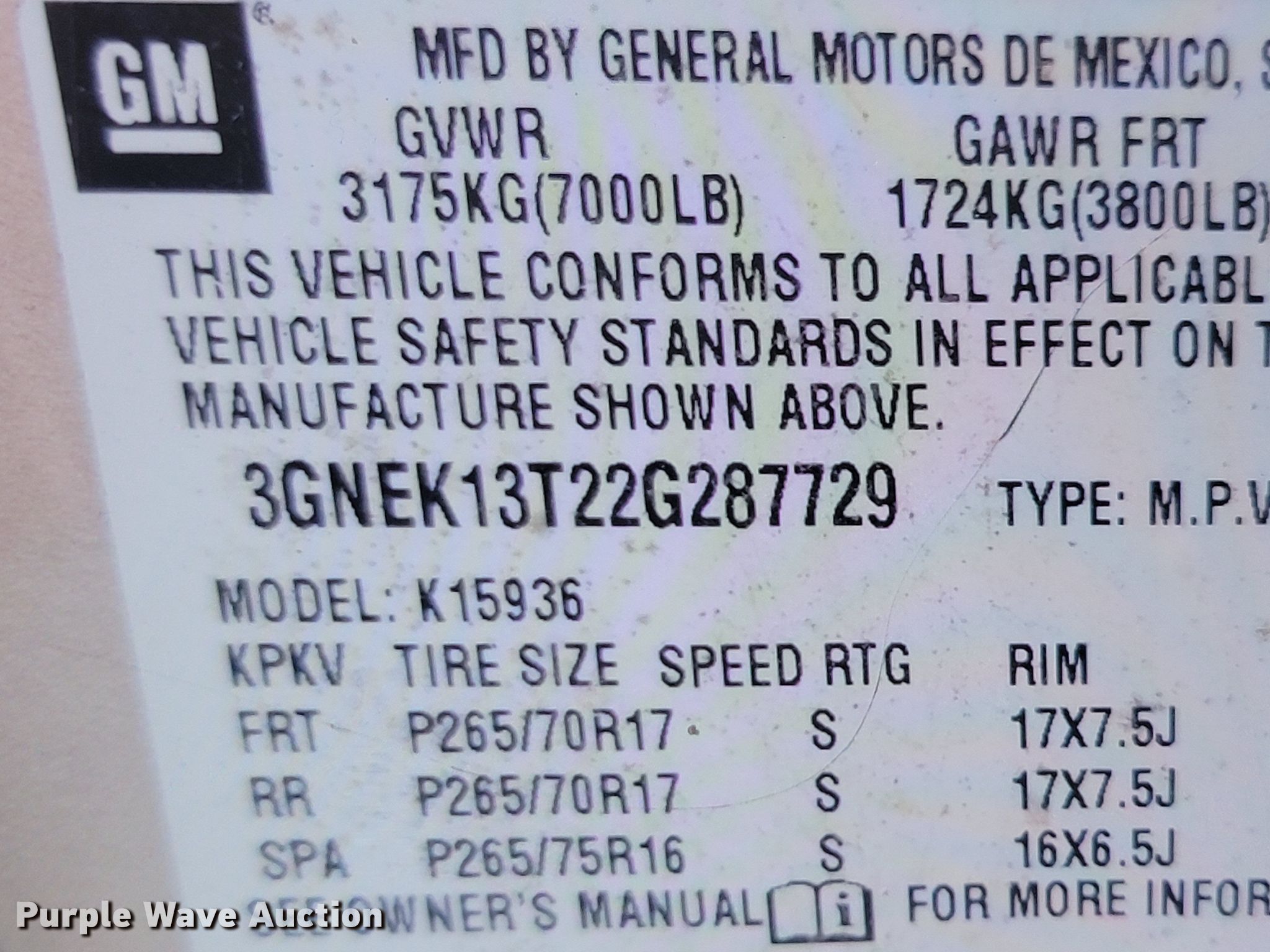 - VIN: 3GNEK13T22G287729