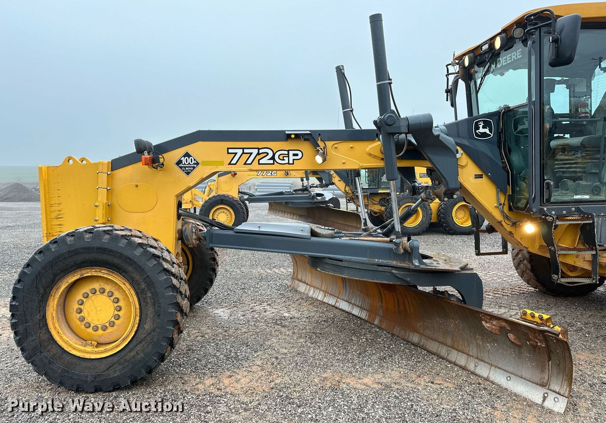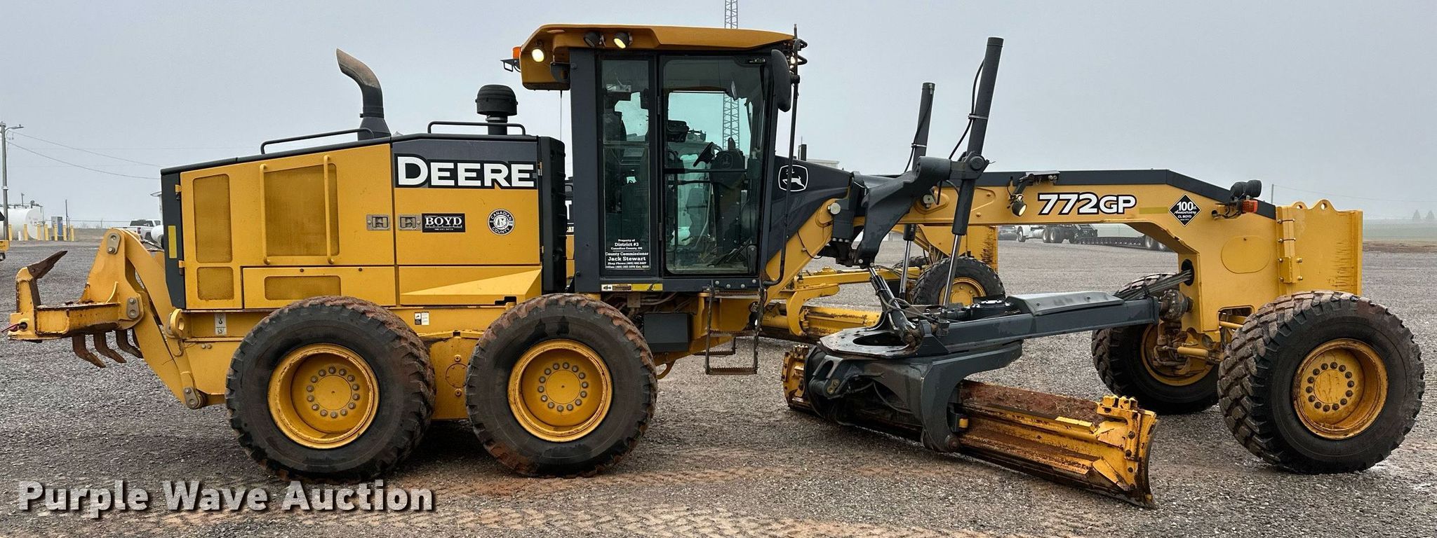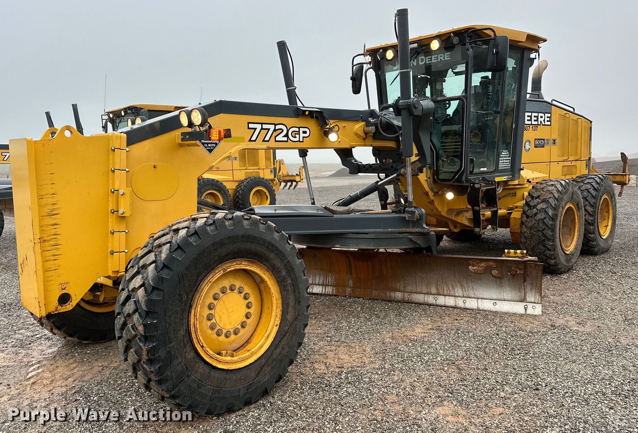 Purple Wave is selling a used Motor Grader in Oklahoma. This item is a 2014 John Deere 772GP motor grader with the following: Hours: 10,294 on meter, Serial: 1DW772GPEDE656413