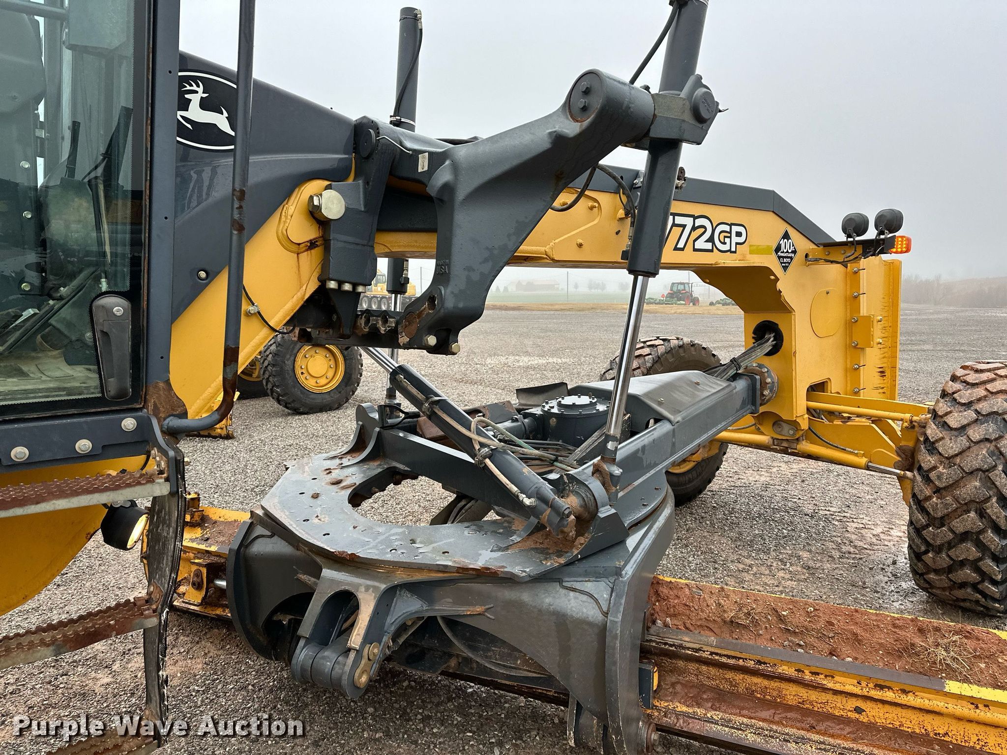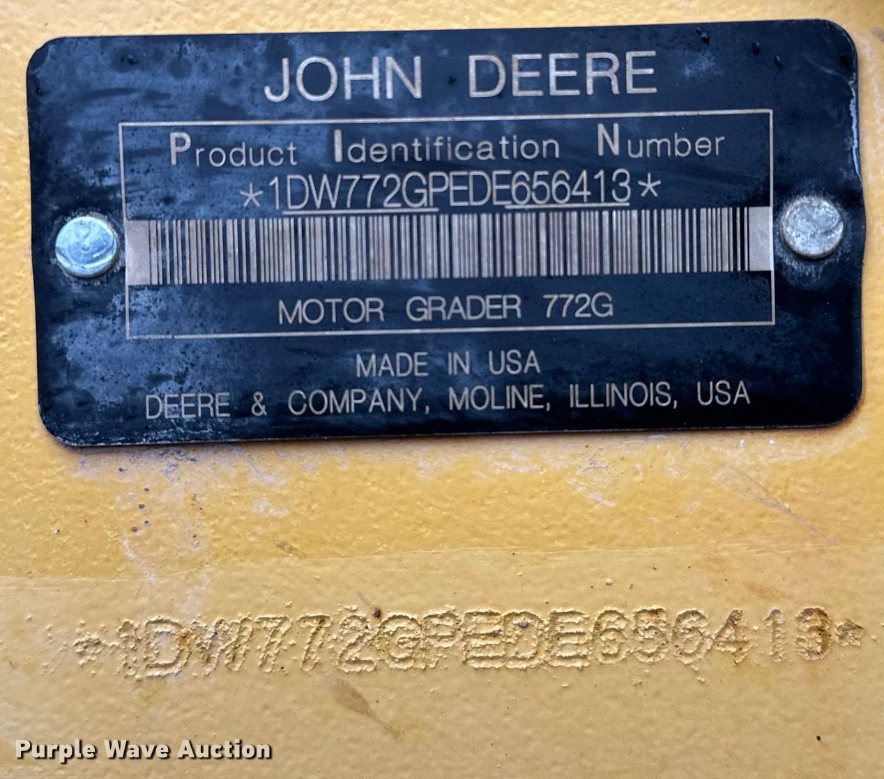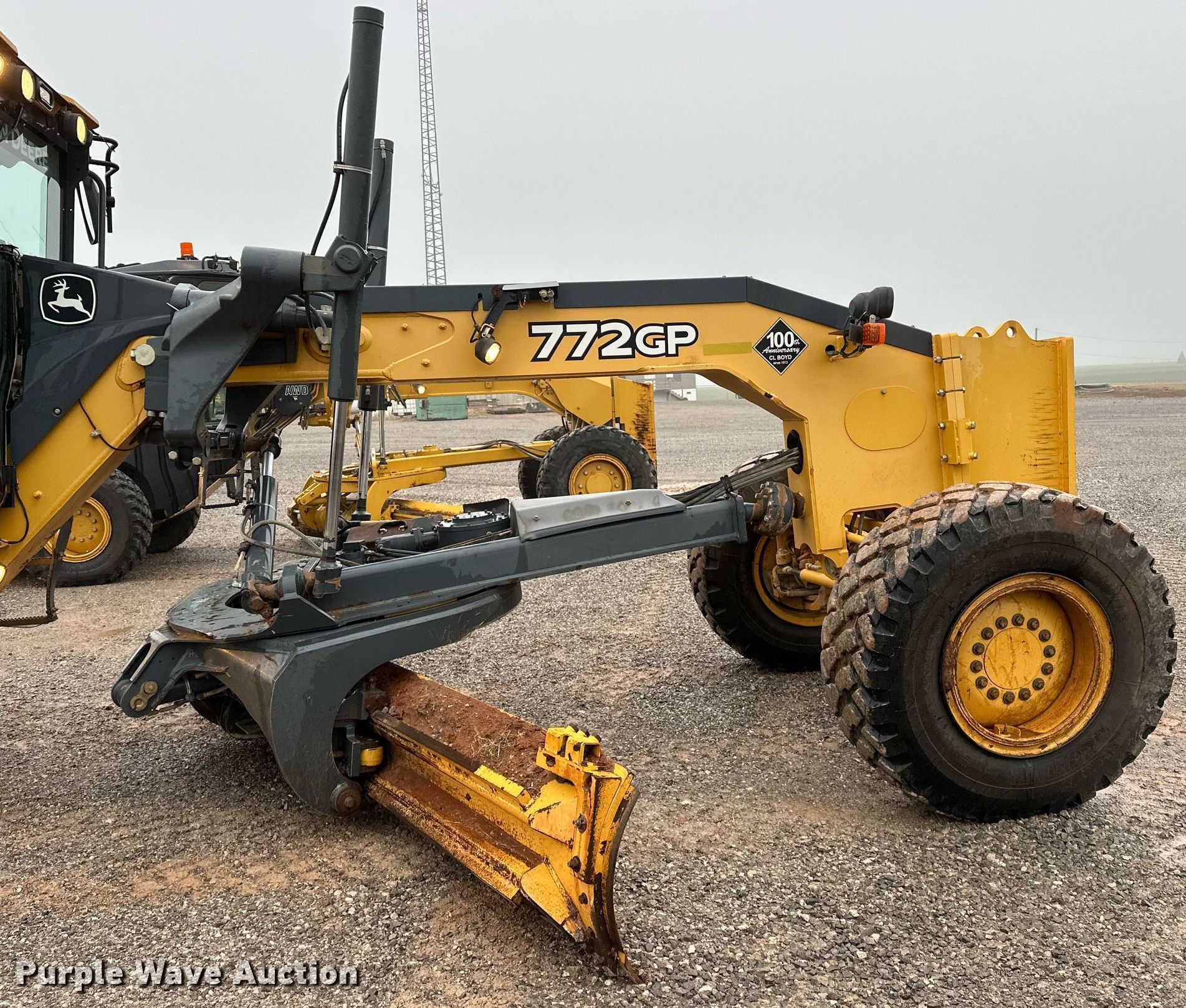 Purple Wave is selling a used Motor Grader in Oklahoma. This item is a 2014 John Deere 772GP motor grader with the following: Hours: 10,294 on meter, Serial: 1DW772GPEDE656413