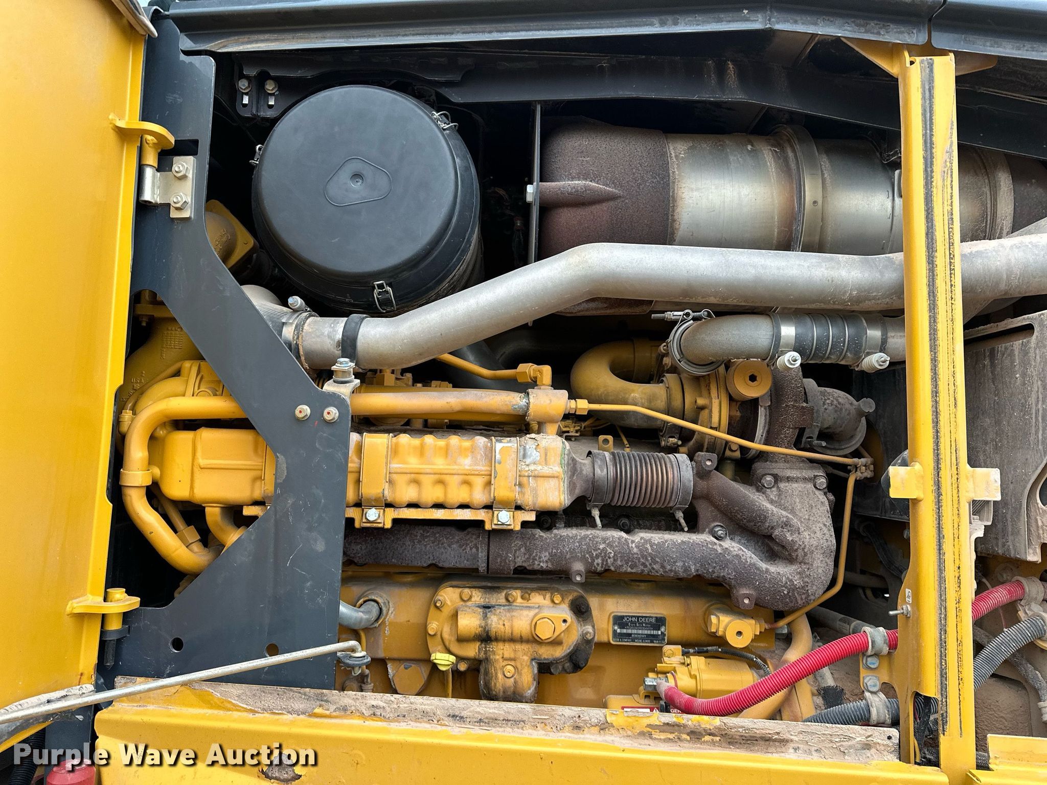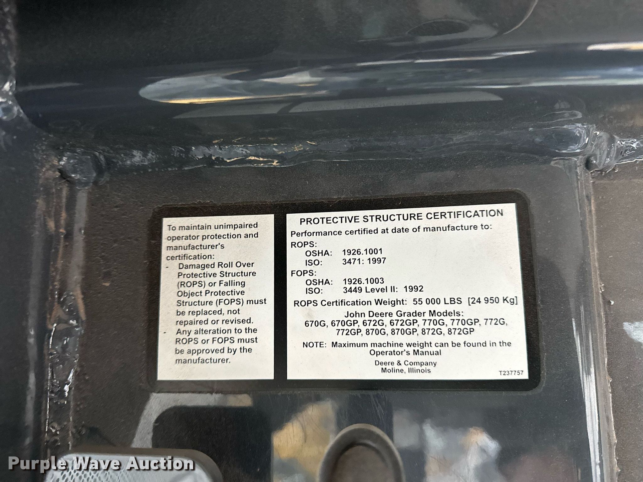2014 John Deere 772GP motor grader. Hours: 10,294 on meter, Serial: 1DW772GPEDE656413. Engine John Deere, Serial: RG6090R064411, Cylinders: 6, Fuel type: Diesel. Transmission Powershift, 8F - 8R. Chassis All wheel drive, Differential lock. Operators station Enclosed cab, AC, Heat, Hydraulic control valves: 8. Features Moldboard: Tip control, Side shift, Moldboard total length: 14', Circle slip clutch, Front-mounted push block, Rear ripper Ripper shanks: 3, Scarifier teeth: 7. Tires Size: 17.5R25. Notes Tip control issues. Canadian County. 1205 North Calumet Road. Calumet, OK 73014