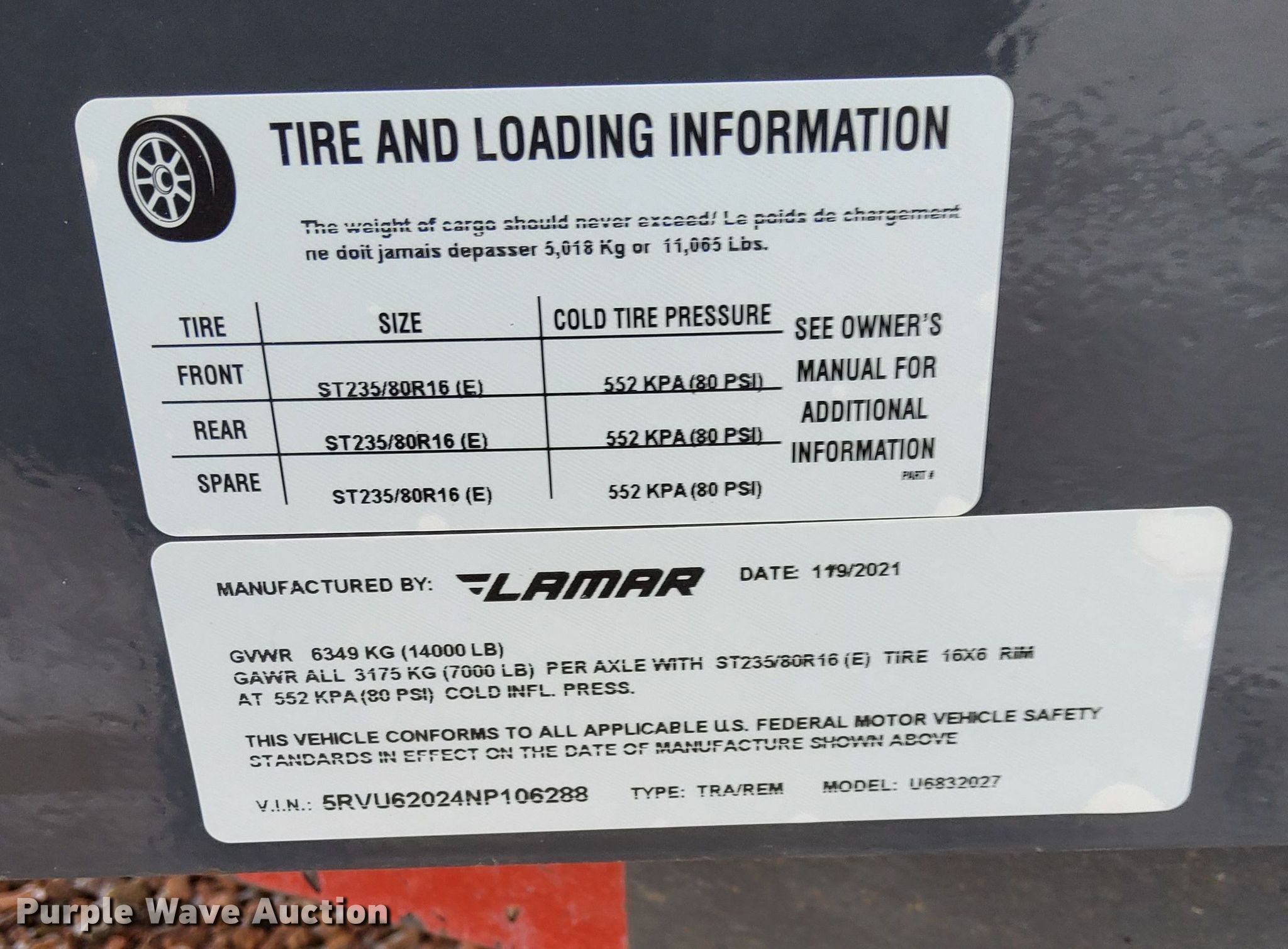 2022 Lamar U6832027 equipment trailer. VIN: 5RVU62024NP106288. Dimensions Overall: 24' 6" L x 101" W, Deck: 20' 6" L x 83" W, Ramps: Manual Length: 5'. Features Deck type: Wood. Chassis Ball hitch: 2 5/16", Suspension: Spring, Brakes: Electric, Axles: Tandem, GVWR: 14,000 lbs, GAWR: 7,000 lbs. Tires Steel wheels, Size: 235/80R16. Colorado title. Title distribution may be delayed up to 14 days from verification of funds. 600 South 4th Street. Lamar, CO 81052