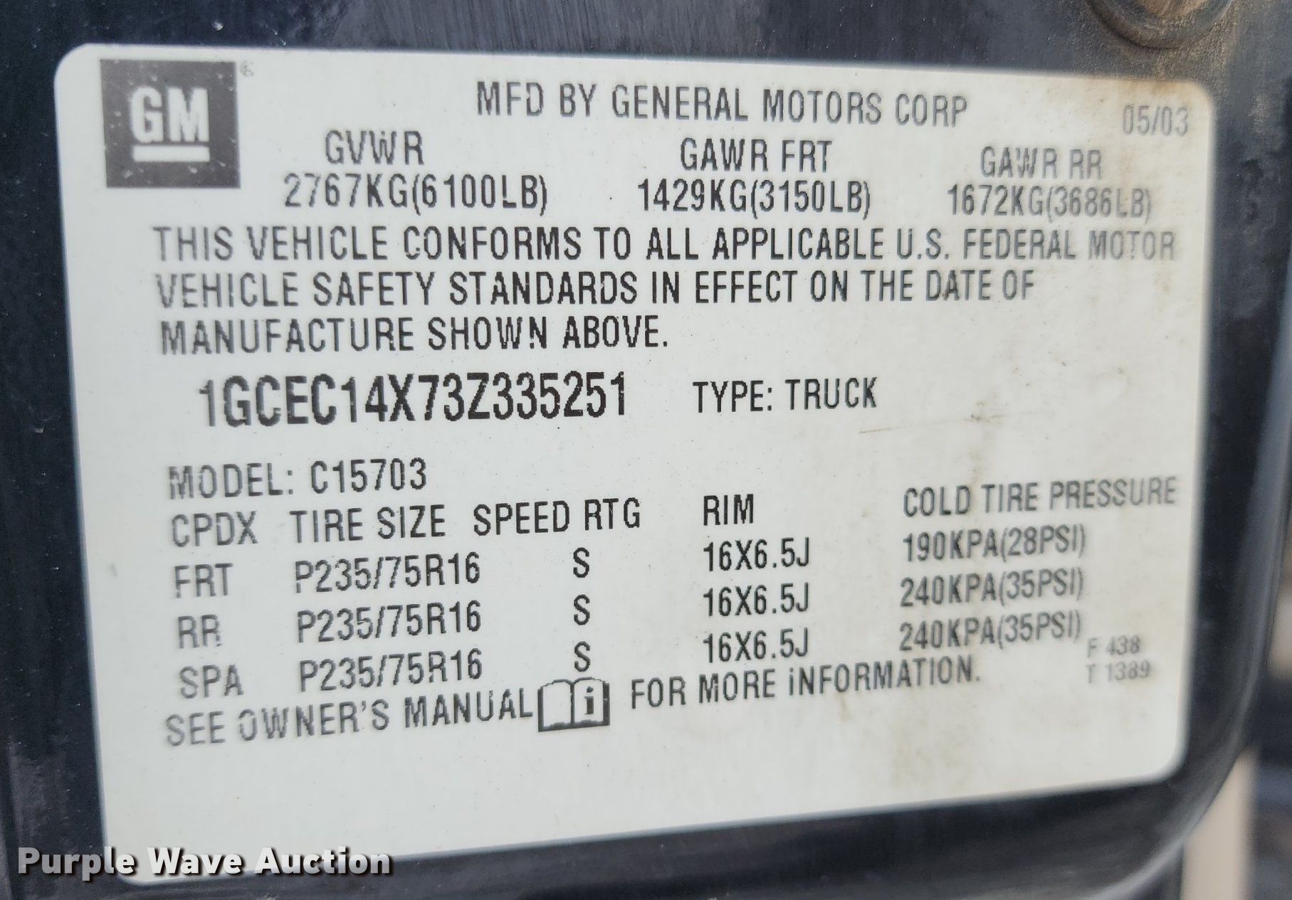 - VIN: 1GCEC14X73Z335251
