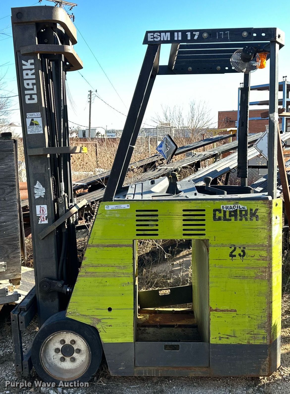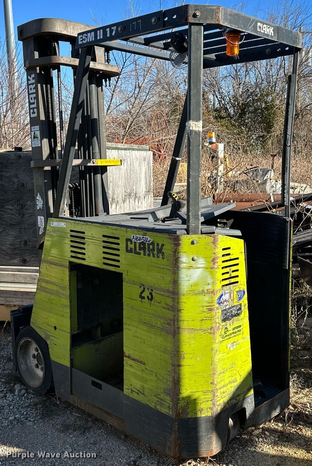 Purple Wave is selling a used Warehouse Forklift in Oklahoma. This item is a Clark ESMII-17 order picker with the following: Hours: Unknown, Serial: ESM247-0220-8722FB