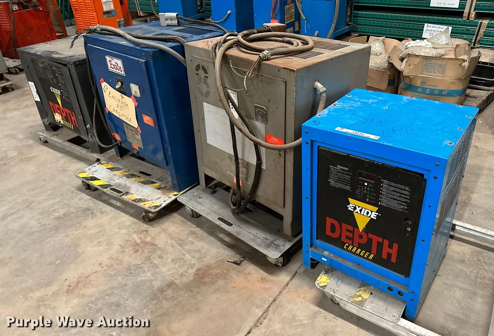 Purple Wave is selling a used Forklift Attach. in Oklahoma. This item is a (4) Exide forklift battery chargers with the following: 24 volts, Single phase, (3) three phase
