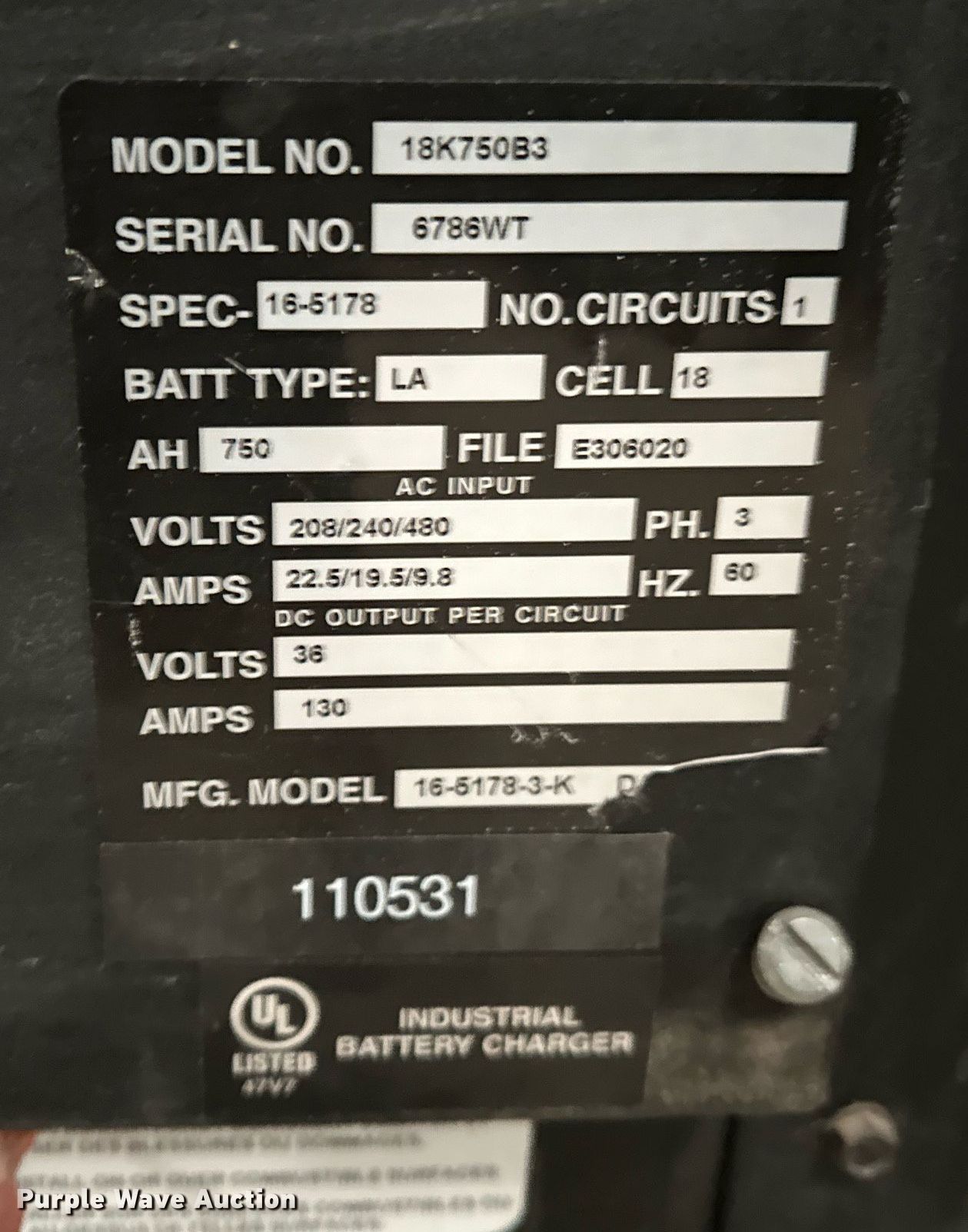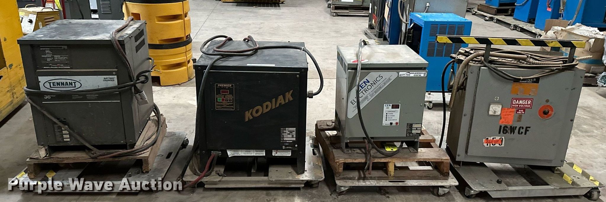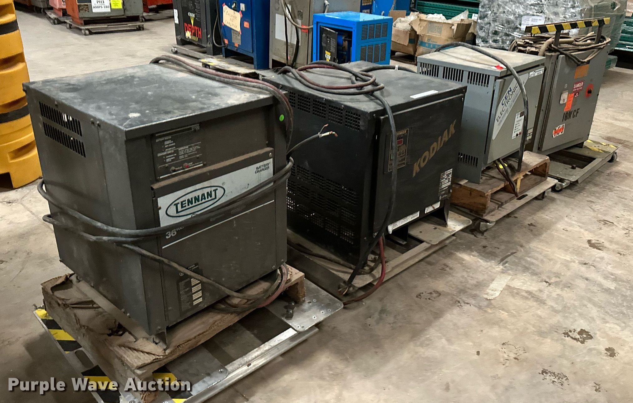 Purple Wave is selling a used Forklift Attach. in Oklahoma. This item is a (4) forklift battery chargers with the following: Tennant 2200, Volts: 36, Single phase, Kodiak Premier, Volts: 36, Phase: Three, Gen 80, Volts: 36, Single phase, Gould, Volts: 12, Phase: Three