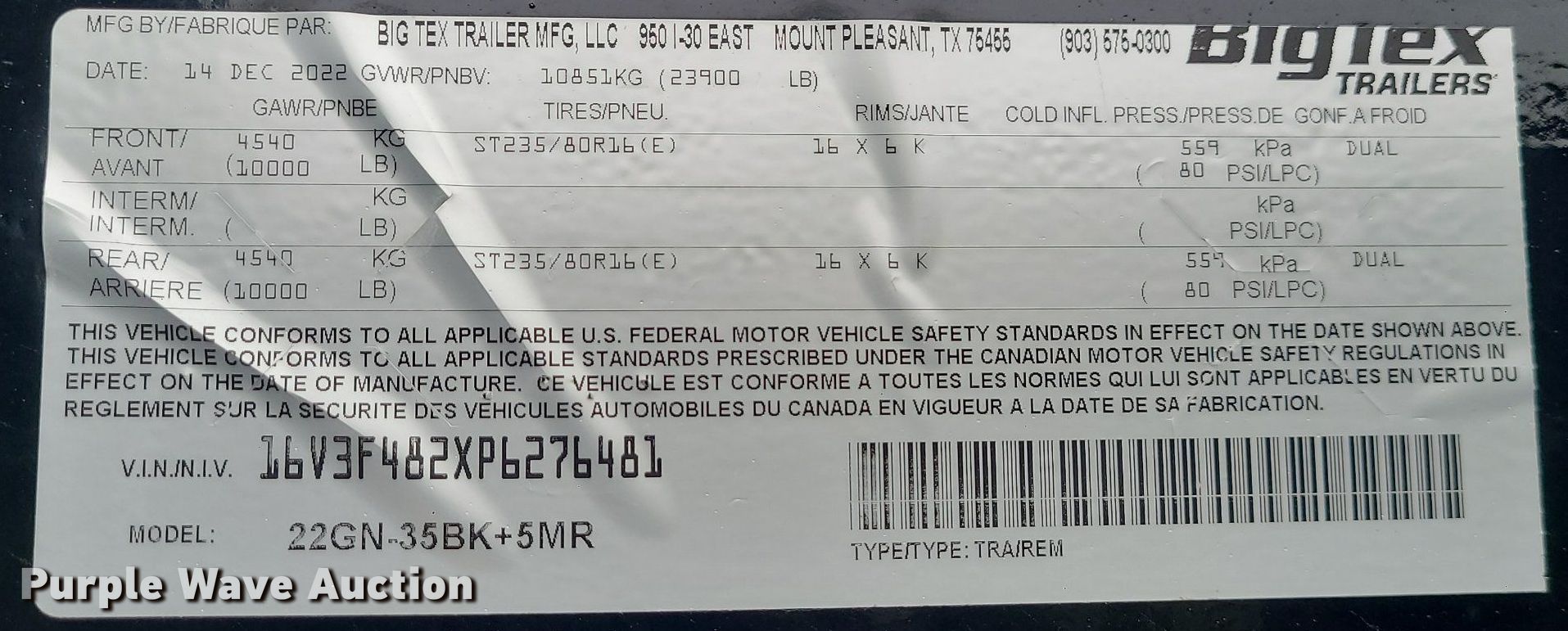 Purple Wave is selling a used Equip. Trailer in Missouri. This item is a 2023 Big Tex 22GN-35BK+5MR equipment trailer with the following: VIN: 16V3F482XP6276481