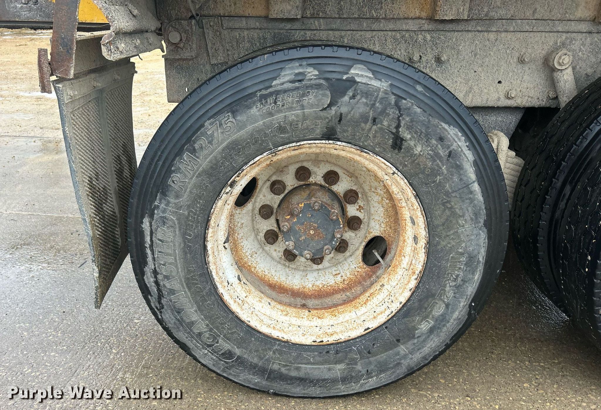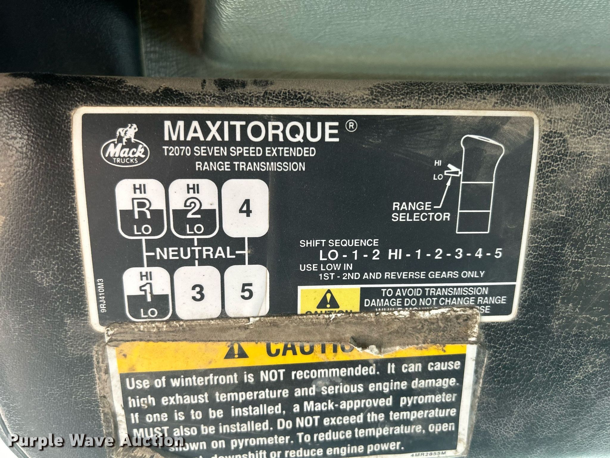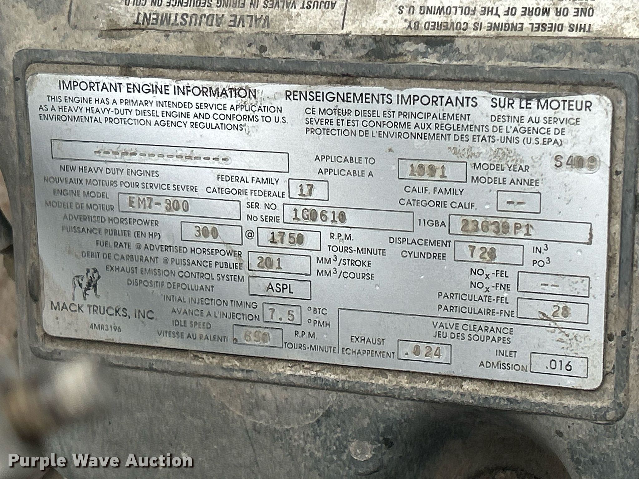 1991 Mack RD690S live-bottom truck. Miles: 23,099 on odometer, Hours: 2,658 on meter, VIN: 2M2P264C4MC009682. Engine Mack EM7-300, Displacement: 12.0L, Cylinders: 6, Fuel type: Diesel. Transmission Mack Maxitorque T2070, Manual, Speed: 7. Chassis Double frame, Axles: Triple, Pusher axle, Differential lock: Inter-axle, Suspension: Camelback, Brakes: Air, PTO, Wheelbase: 236". Interior AC, Heat. Features Live-bottom dump body Flow Boy 97-268, 18' L x 94" W, Side height: 52", Floor: Belted bottom, Belt/ chain width: 26", Bed type: Steel, Roll tarp, End gate: Air operated. Tires Front: 425/65R22.5, Rear: 11R22.5, Lift axle: 10R17.5. Iowa title. Title distribution may be delayed up to 14 days from verification of funds. Larry L. Detterman Inc.. 1547 12th Avenue South. Clinton, IA 52732