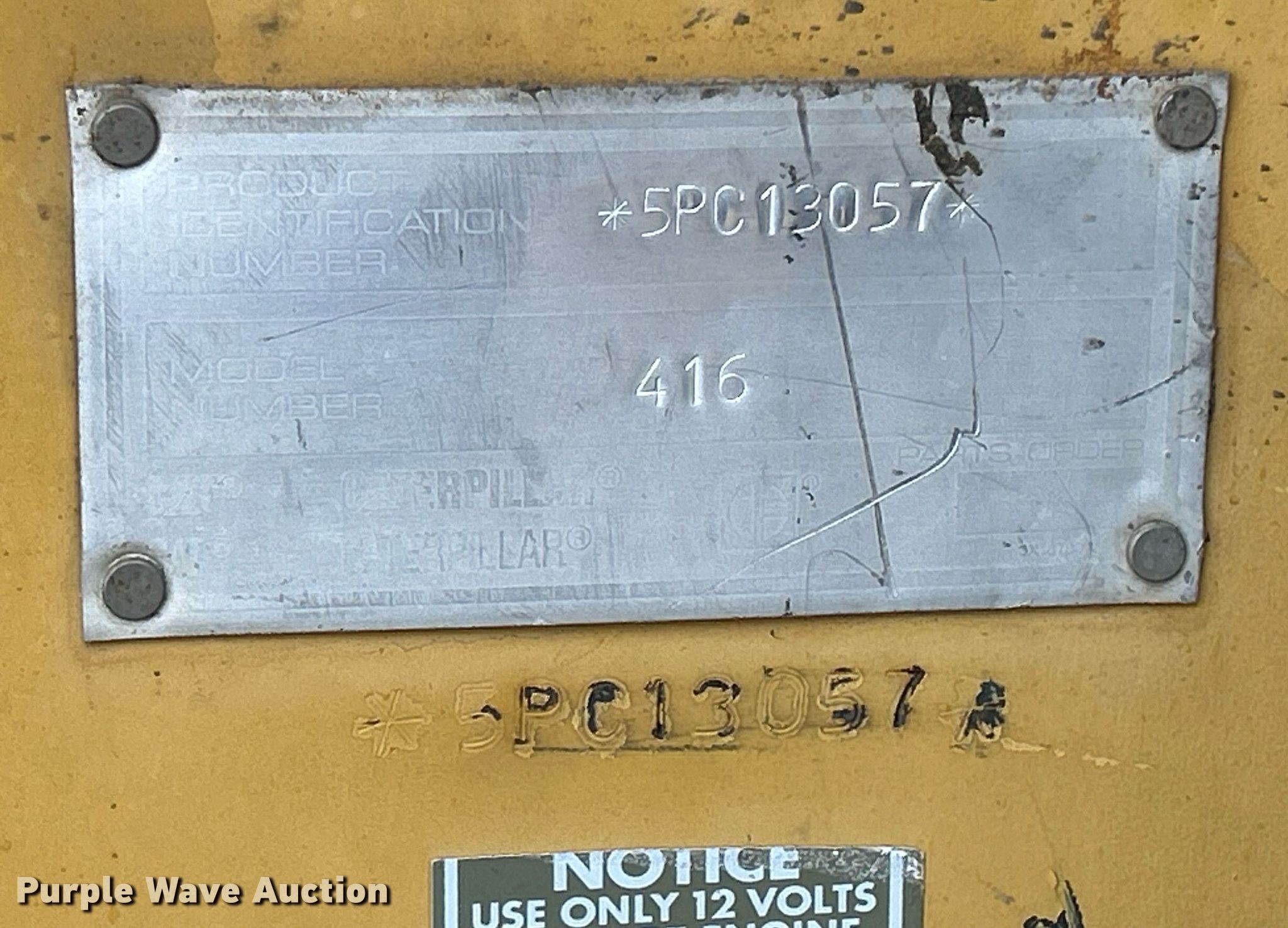 1990 Caterpillar 416 backhoe. Hours: 7,303 on meter, Serial: 5PC13057. Engine Cylinders: 4, Fuel type: Diesel. Transmission Shuttle shift, 4F - 4R. Chassis Four wheel drive, Differential lock. Operators station Enclosed cab, Heat, Backhoe controls: Four stick. Features Loader Bucket Width: 88", Cutting edge: Bolt-on, Backhoe Extendable stick, Bucket Width: 36", Cutting edge: Weld-on, Teeth: 6.. Tires Front: 12.5/80-18, Rear: 19.5L-24. Notes Glass cracked. Larry L. Detterman Inc.. 1547 12th Avenue South. Clinton, IA 52732