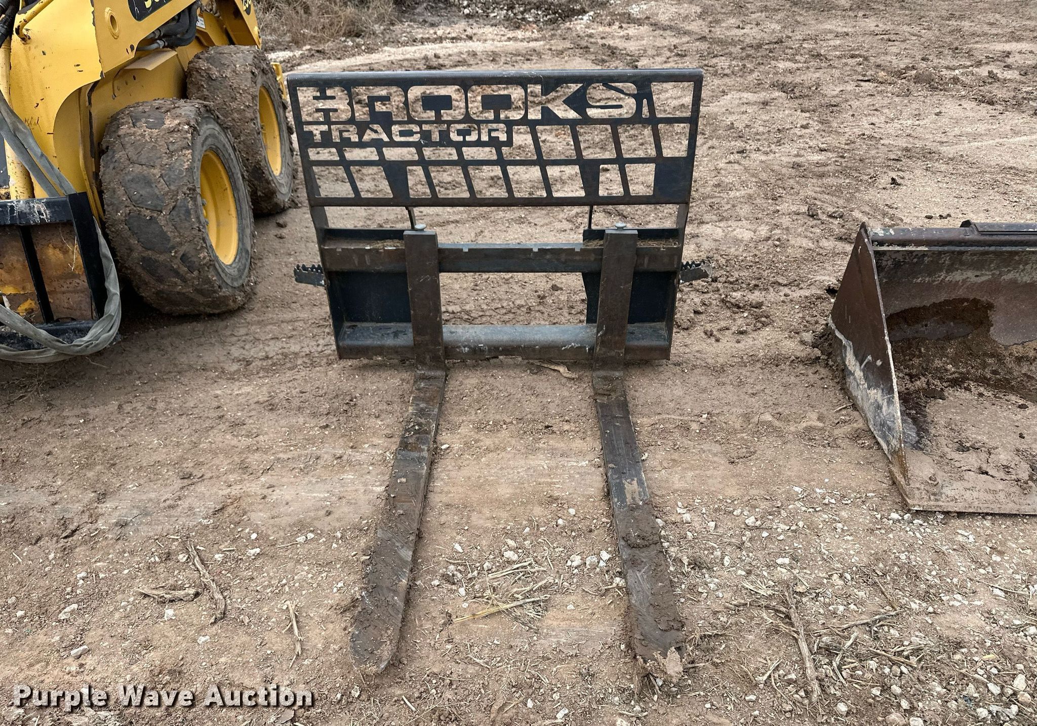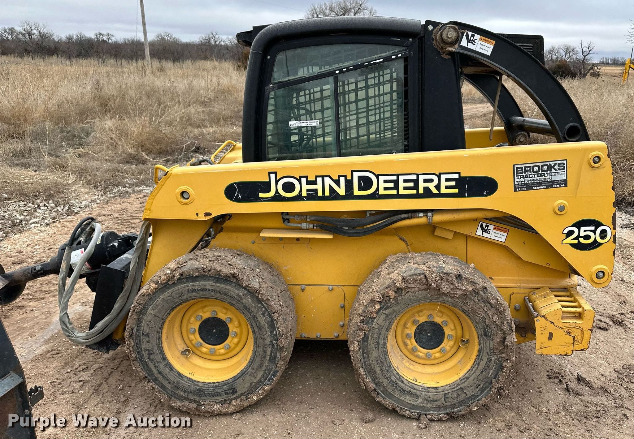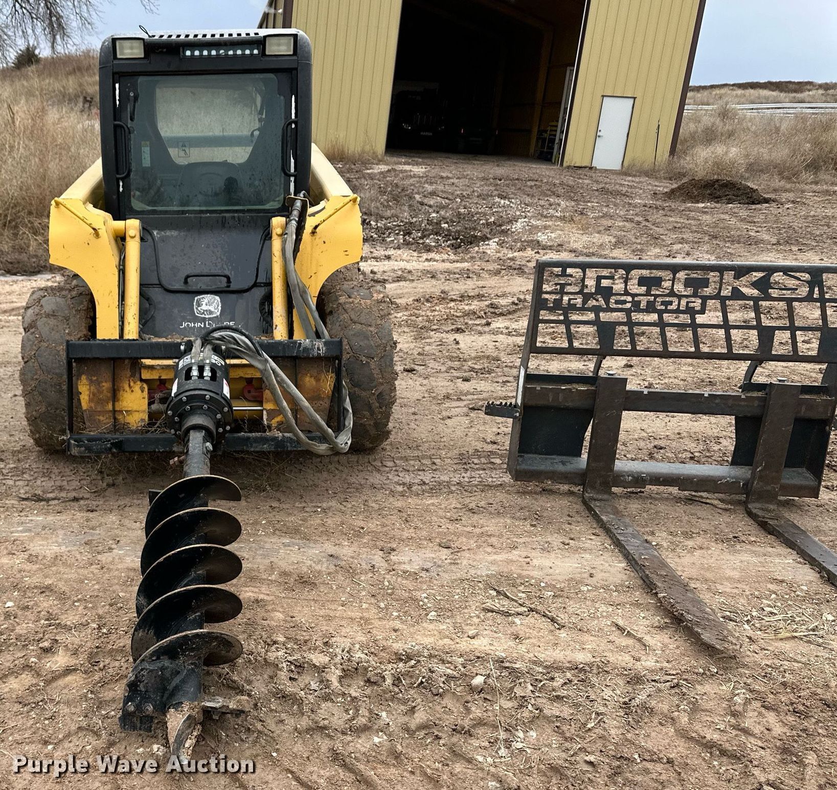 2002 John Deere 250 skid steer loader. Hours: 301 on meter, Serial: KV0250A451487. Engine John Deere, Cylinders: 3, Fuel type: Diesel. Transmission Hydrostatic. Operators station Enclosed cab, AC, Heat, Bucket control: Foot, Electronic Monitoring System panel. Features Auxiliary hydraulics, Quick coupler: Hydraulic, Counter weights, Bucket John Deere, Width: 71", Cutting edge: Bolt-on, Forks Brooks Tractor, Length: 48", Auger John Deere PA30, Diameter: 12". Tires Size: 12-6.5. Withers Farm. Ashland, KS 67831