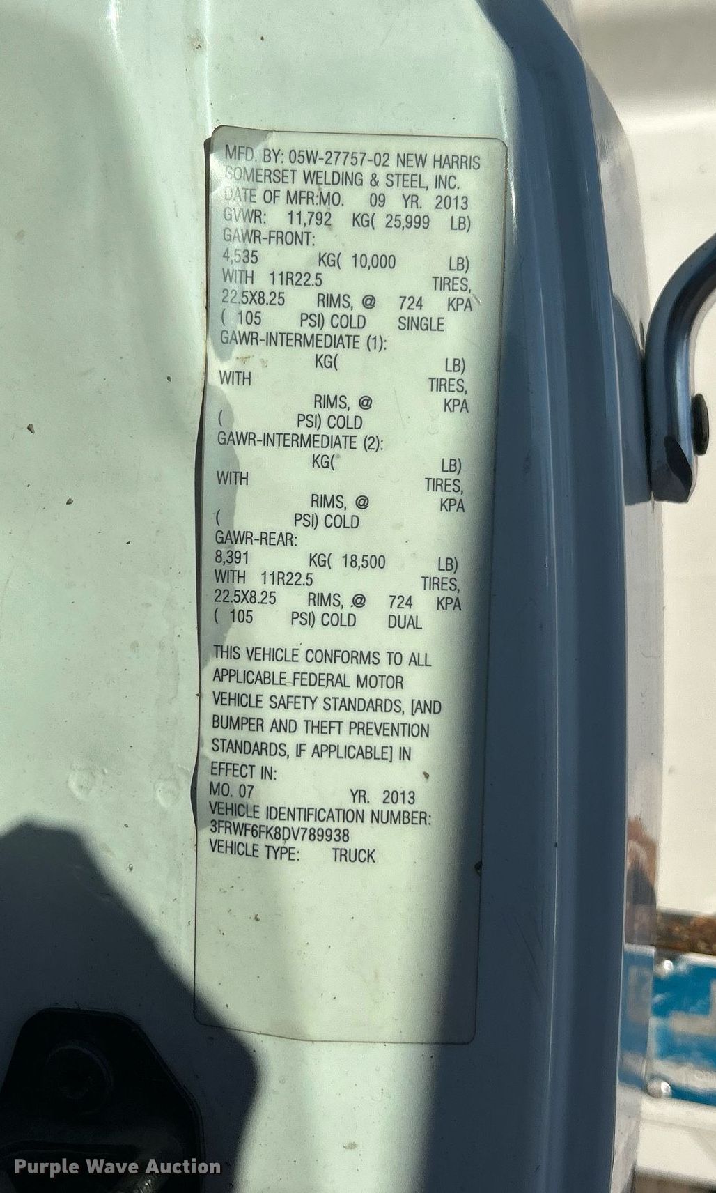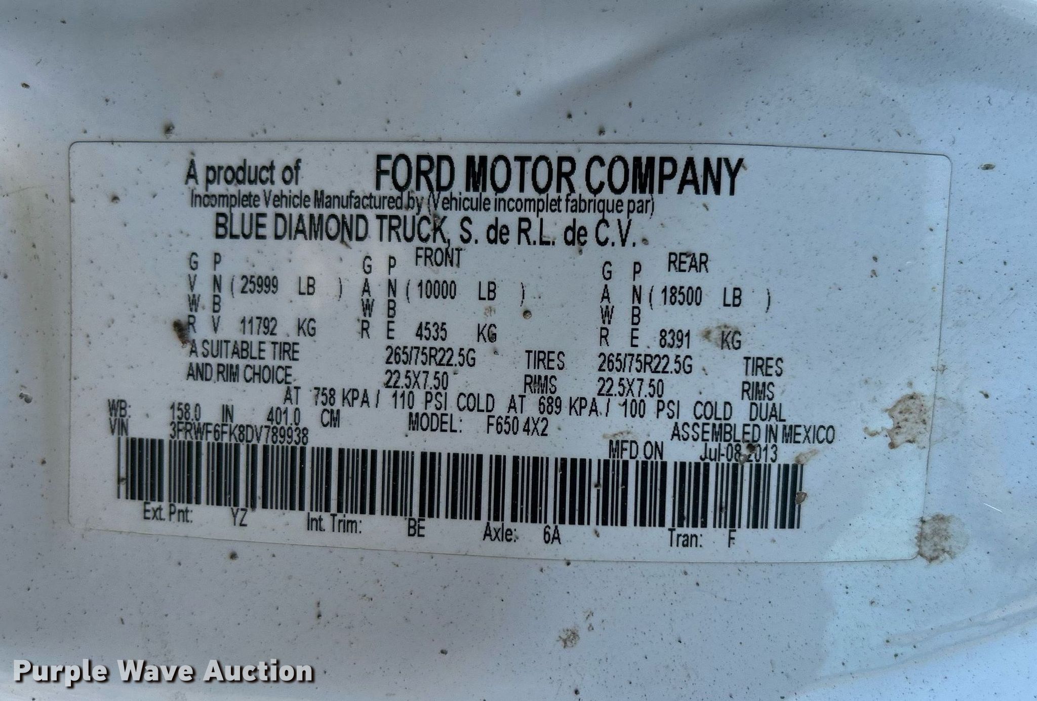 2013 Ford F650 Super Duty dump truck. Miles: 108,906 on odometer, VIN: 3FRWF6FK8DV789938. Engine Displacement: 6.7L, Cylinders: 6, Fuel type: Diesel. Transmission Automatic. Chassis Axles: Single, Suspension: Spring, Brakes: Air, PTO, GVWR: 25,999 lbs, Wheelbase: 158". Interior AC, Heat, Power windows, Cruise control, Brake controller. Features Dump bed J & J Truck Bodies & Trailers S-25-13, 10' L x 96" W, Side height: 30", Side board height: 10", Bed type: Steel, Roll tarp, Ram: Single. Tires Size: 11R22.5. Notes Bed contents included. Oklahoma title. Title distribution may be delayed up to 14 days from verification of funds. 15107 North 137th East Avenue. Collinsville, OK 74021