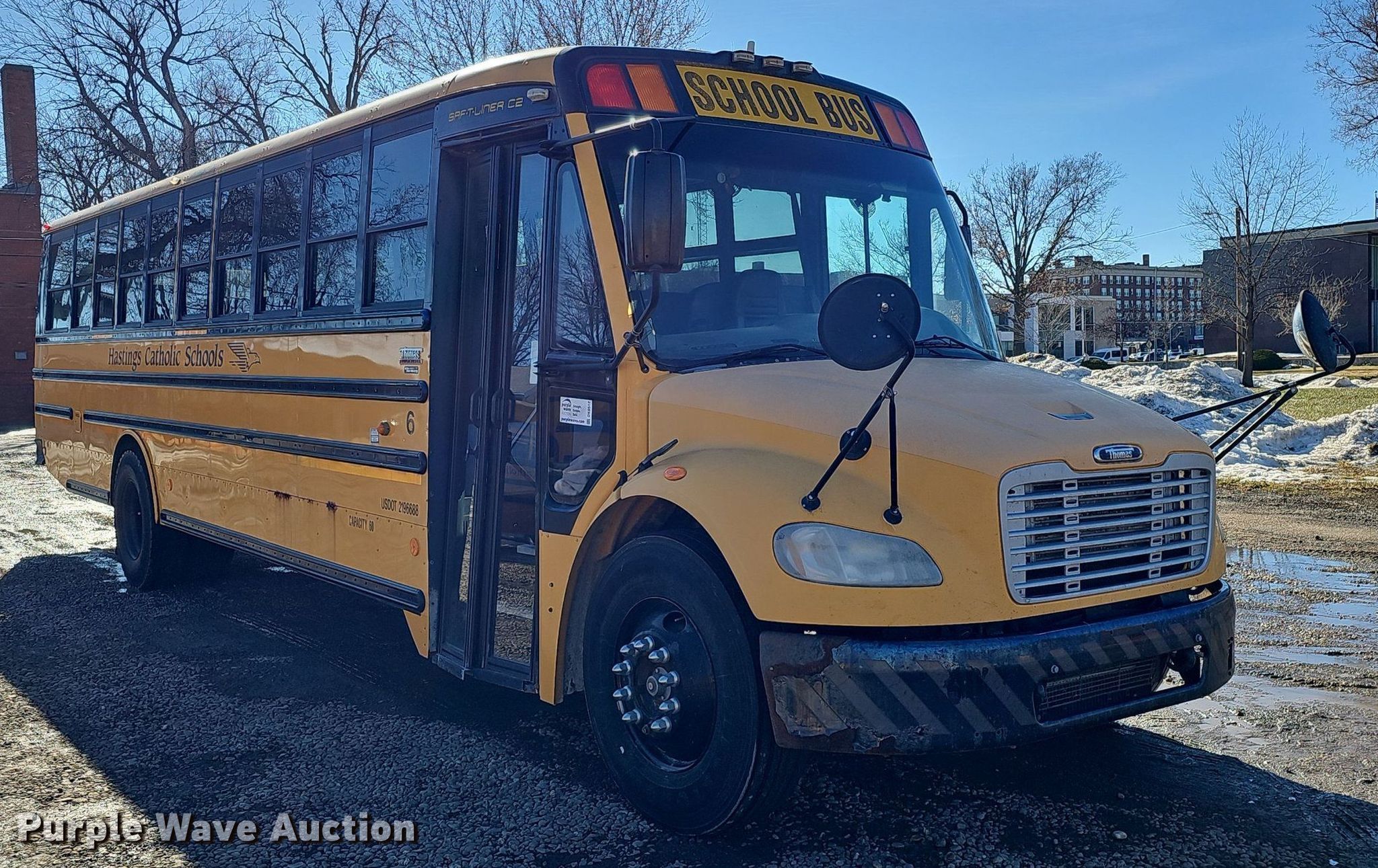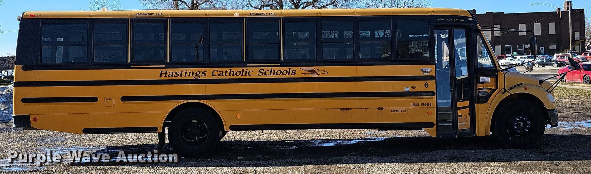 2008 Thomas Built Saf-T-Liner C2 school bus. Miles: 142,472 on odometer, Hours: 5,035 on meter, VIN: 4UZABRCS48CY19633, Unit #: 6. Engine Mercedes-Benz MBE 900, Serial: 0906584598, Displacement: 6.4L, Cylinders: 6, Fuel type: Diesel, HP: 210. Transmission Automatic. Chassis Axles: Single, Suspension: Air, Brakes: Air, GVWR: 27,000 lbs, Wheelbase: 258". Interior Heat, Heated mirrors, Cruise control, Auxiliary controls, Electric passenger sliding door, Passengers: 60. Tires Size: 11R22.5. Notes Windshield chipped or cracked, Dead battery. Nebraska title. Seller is a government entity who will be assigning and distributing the title. Please contact the seller for distribution questions. Title distribution may be delayed up to 14 days from verification of funds. St. Cecelia Catholic School. 521 North Kansas Avenue. Hastings, NE 68901
