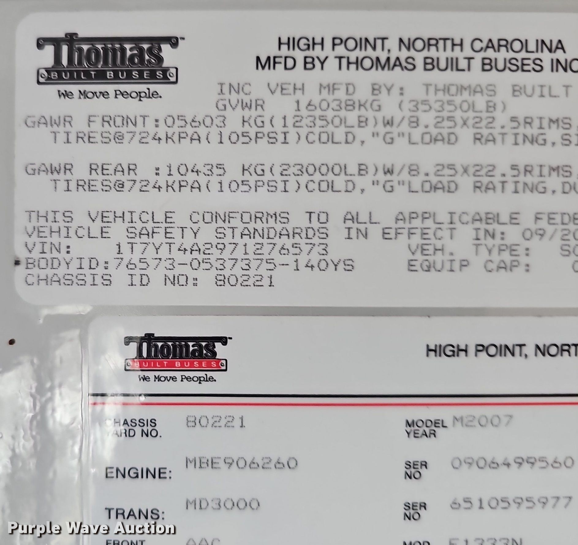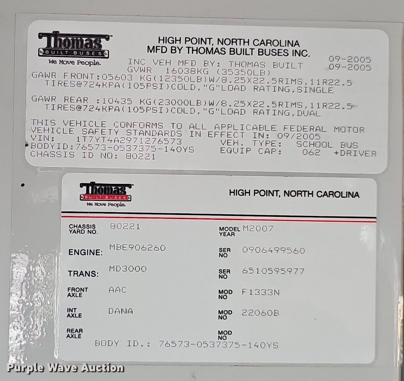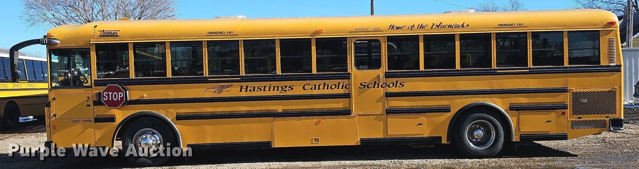 2007 Thomas Built Saf-T-Liner HDX school bus. Miles: 148,705 on odometer, Hours: 5,845 on meter, VIN: 1T7YT4A2971276573, Unit #: 7. Engine Cylinders: 6, Fuel type: Diesel. Transmission Allison, Automatic. Chassis Axles: Single, Suspension: Air, Brakes: Air, GVWR: 35,350 lbs, Wheelbase: 268". Interior Heat, Heated mirrors, Cruise control, Auxiliary controls, Electric passenger sliding door, Passengers: 62, Wheelchair lift. Tires Size: 11R22.5. Notes Windshield chipped or cracked. Nebraska title. Seller is a government entity who will be assigning and distributing the title. Please contact the seller for distribution questions. Title distribution may be delayed up to 14 days from verification of funds. St. Cecelia Catholic School. 521 North Kansas Avenue. Hastings, NE 68901