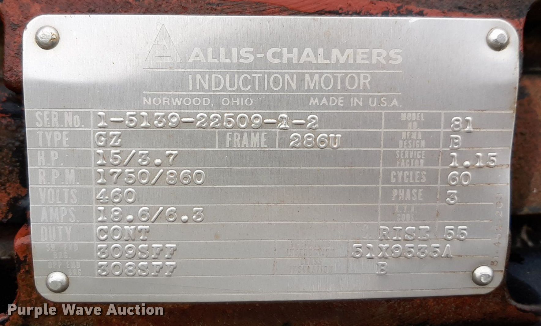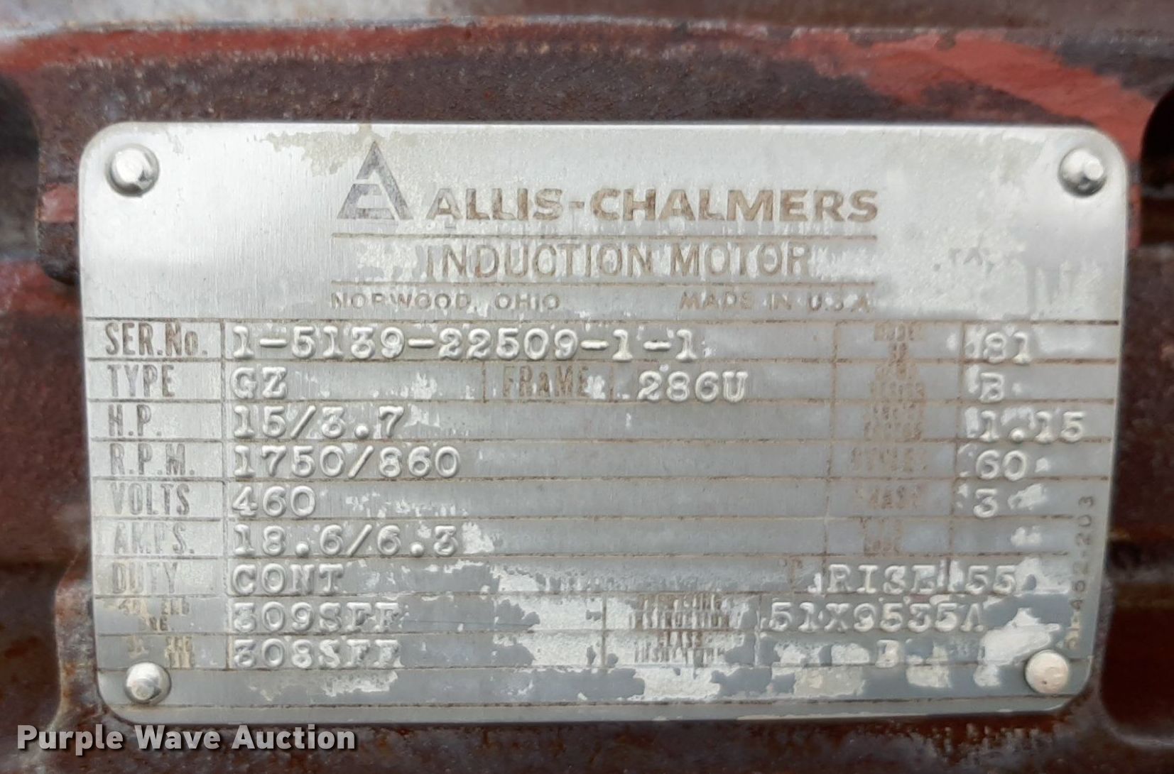 Purple Wave is selling a used Electric Motor in Kansas. This item is a Electric motor with the following: (2) Allis Chalmer electric motors, HP: 15, Volts: 460, (2) 72" fans, Shrouds