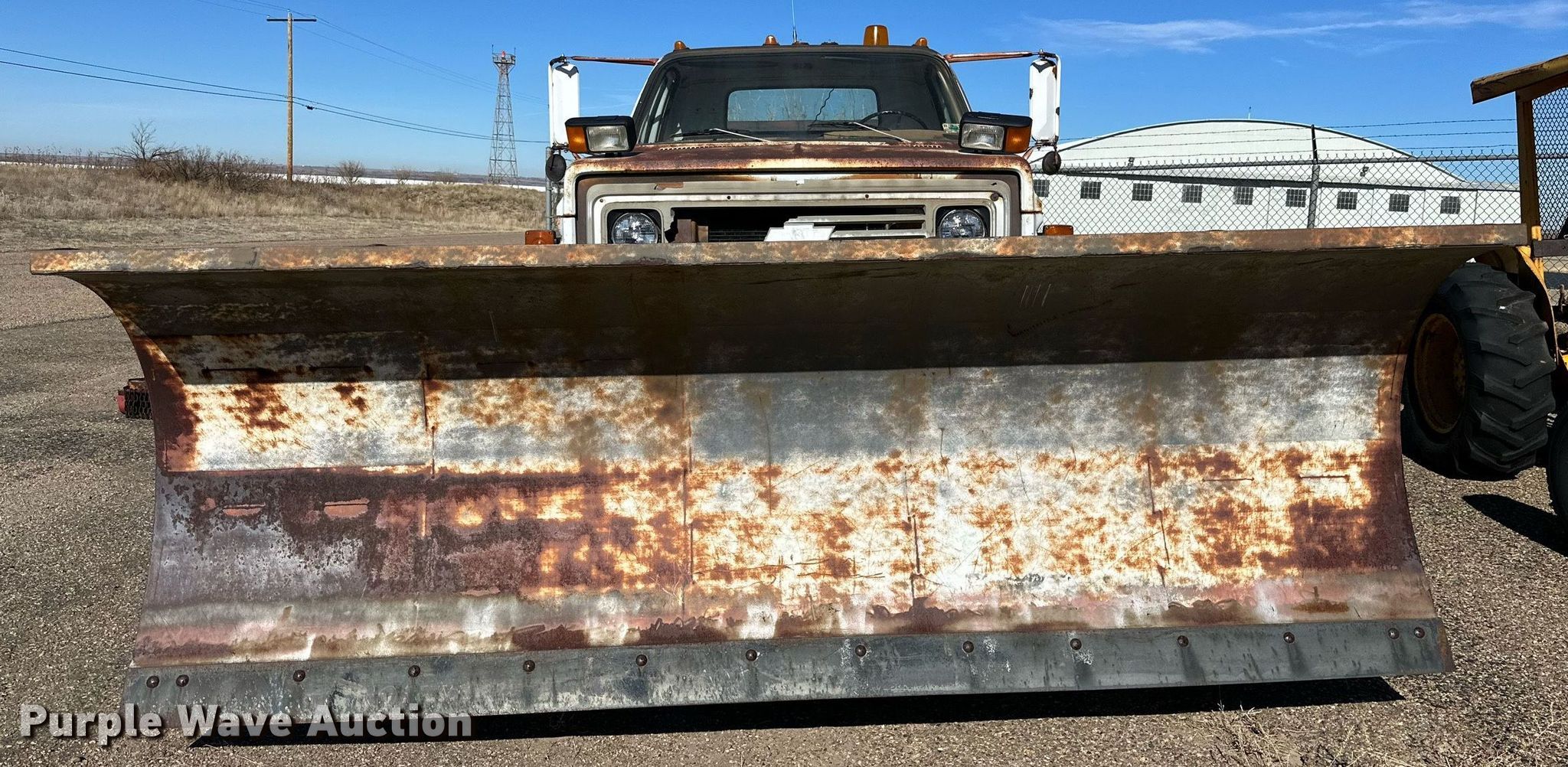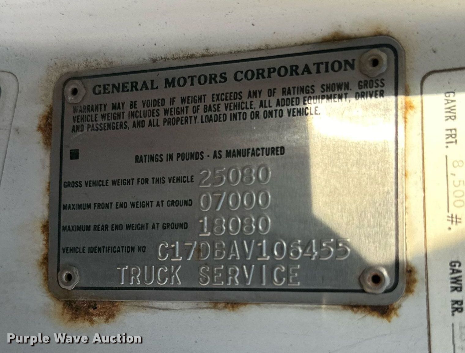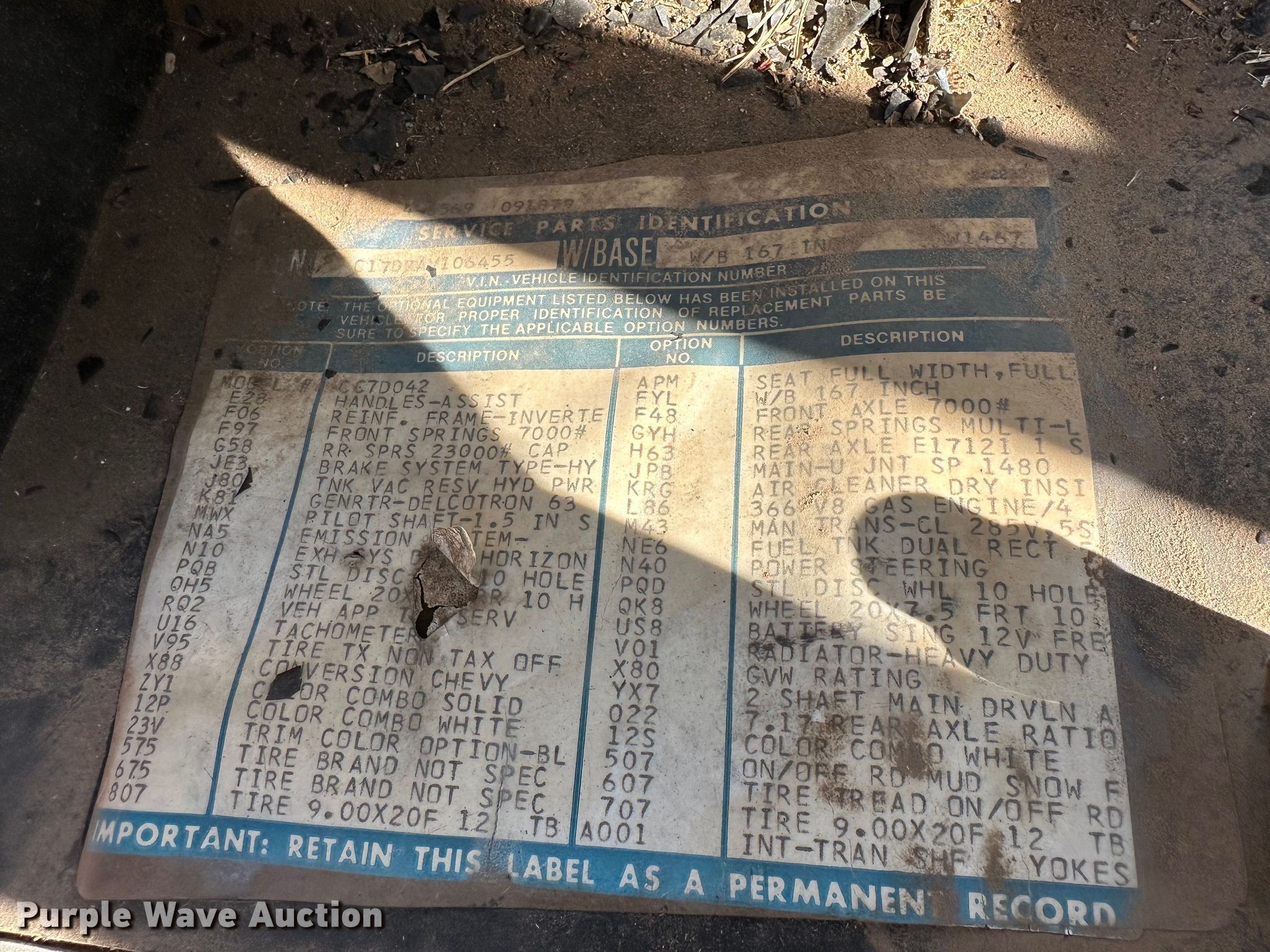 1980 Chevrolet dump truck. Miles: 34,342 on odometer, VIN: C17DBAV106455. Engine Cylinders: 8, Fuel type: Gas. Transmission Manual, Speed: 5. Chassis Axles: Single, Suspension: Spring, Brakes: Hydraulic. Interior AC, Heat. Features Dump bed 8' L x 96" W, Side board height: 34", Bed type: Steel, End gate: Manual, Plow Width: 144". Tires Size: 9.00-20. Notes Hood issues, does not open, Non-operational unit. Texas title. Title distribution may be delayed up to 14 days from verification of funds. 1400 Veta Street. Borger, TX 79007