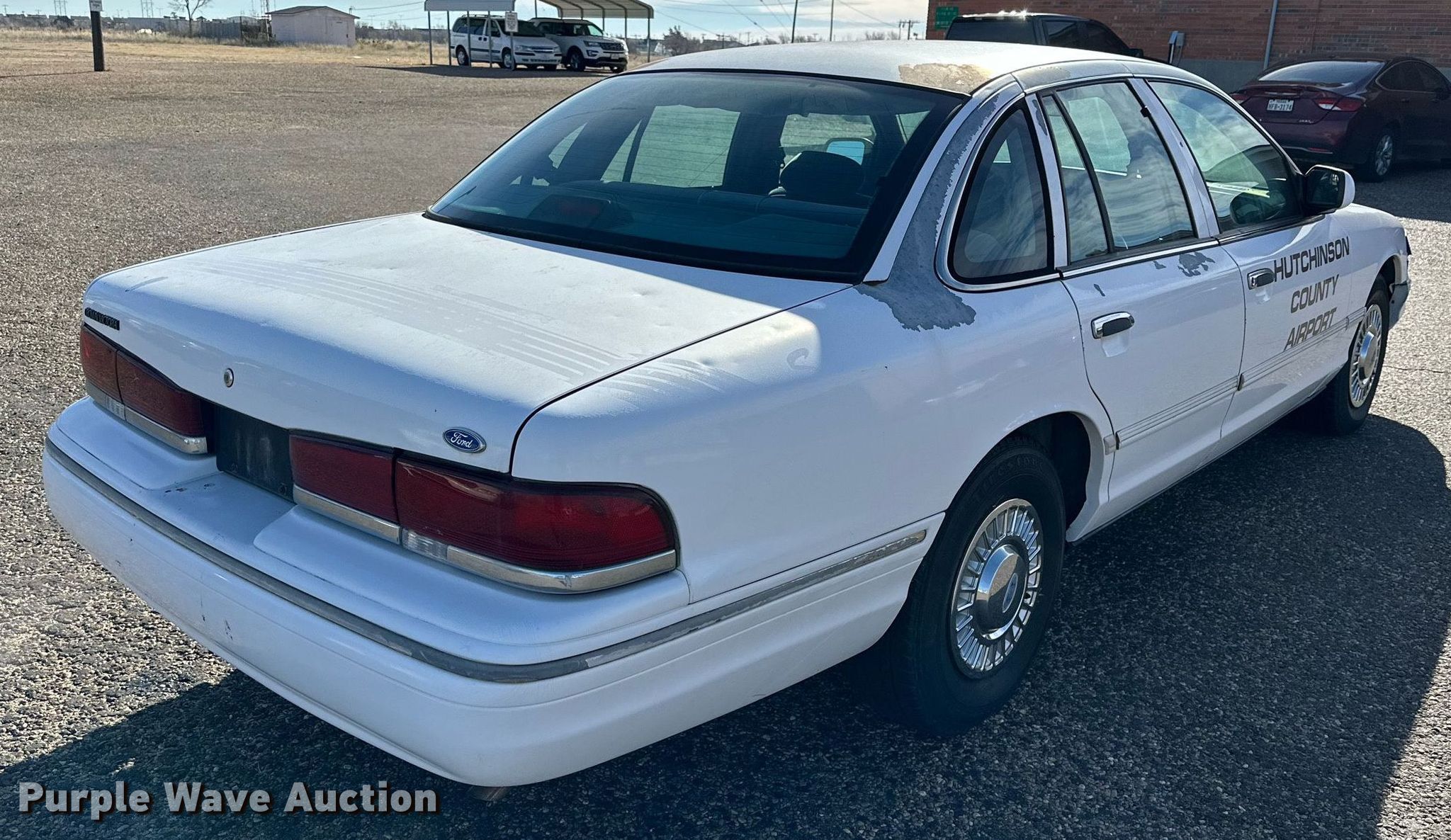 1996 Ford Crown Victoria Police Interceptor. Miles: 141,038 on odometer, VIN: 2FALP71W6TX116903. Engine Displacement: 4.6L V8 SOHC, Cylinders: 8, Fuel type: Gas. Transmission Automatic. Interior AC, Heat, Power windows, Power locks, Cruise control. Tires Size: 225/75R15. Notes Windshield chipped or cracked, Hail damage, Dead battery, Non-operational reverse. Texas title. Title distribution may be delayed up to 14 days from verification of funds. 1400 Veta Street. Borger, TX 79007
