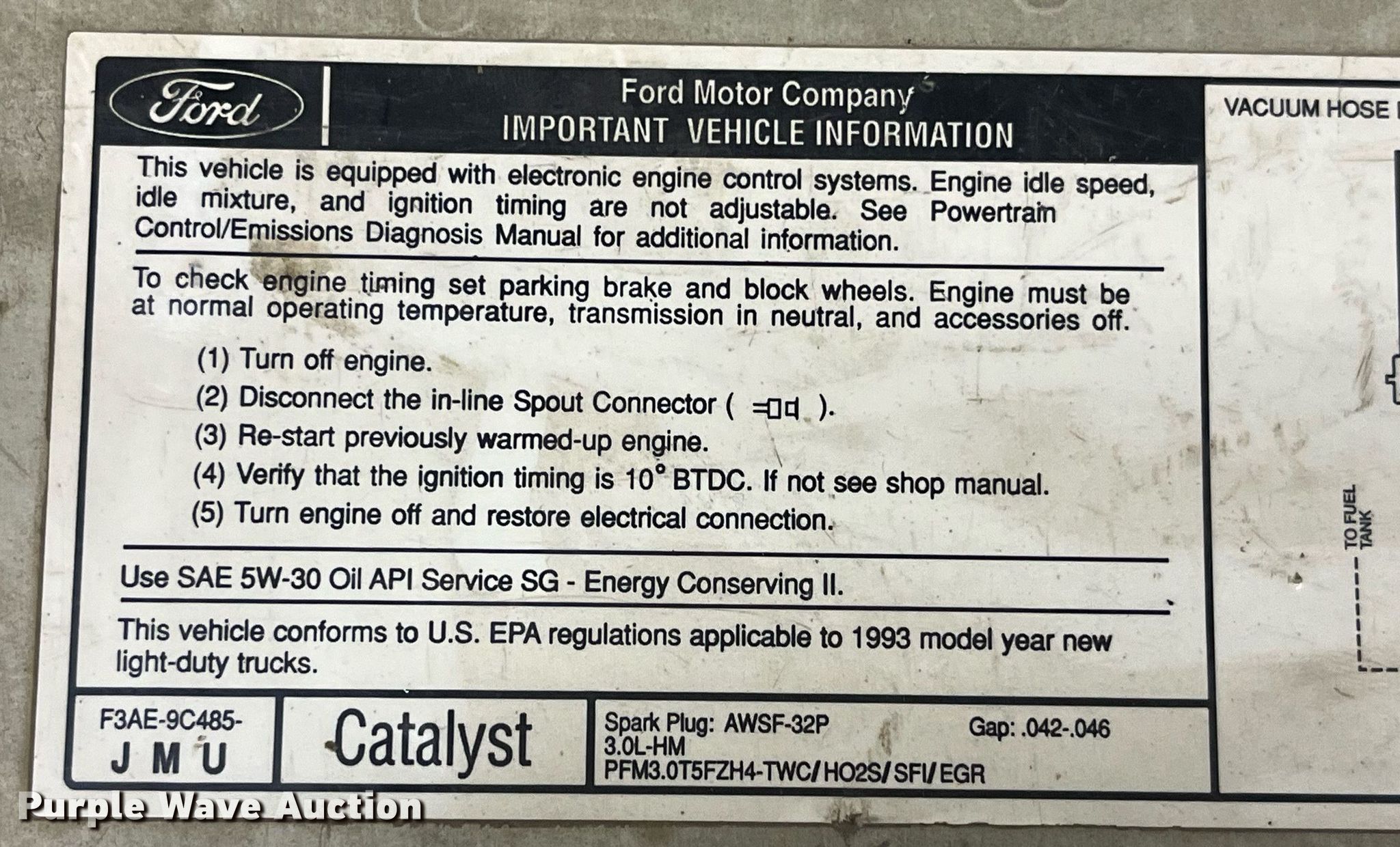 1993 Ford Ranger XL pickup truck. Miles: 62,637 on odometer, Hours: 4,801 on meter, VIN: 1FTCR10U9PUD59720. Engine Displacement: 3.0L V6 OHV, Cylinders: 6, Fuel type: Gas. Transmission Automatic. Interior Heat. Tires Size: 215/70R14. Notes Windshield chipped or cracked, Possible fuel pump issue, Non-operational unit. Iowa title. Title distribution may be delayed up to 14 days from verification of funds. Ottumwa Water Works. 230 Turner Drive. Ottumwa, IA 52501