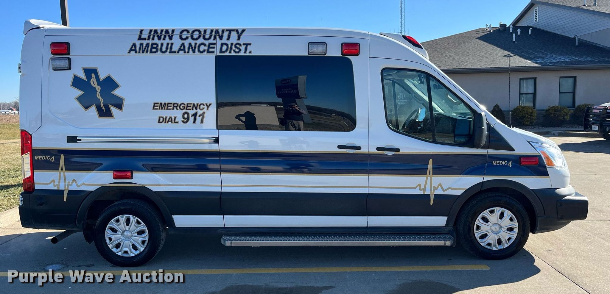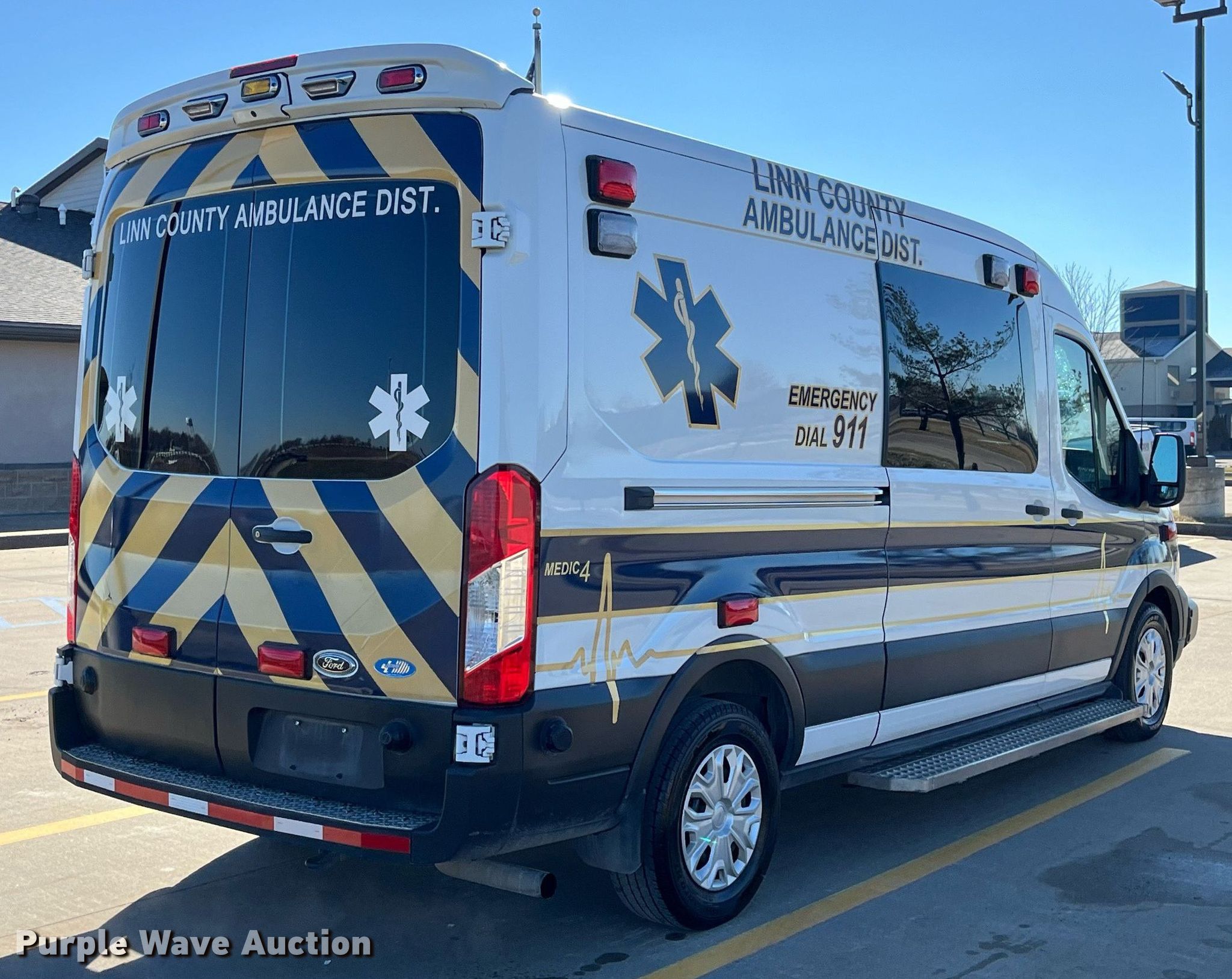 2020 Ford Transit 250 ambulance. Miles: 246,170 on odometer, VIN: 1FDBR1CG7LKA77062. Engine Displacement: 3.5L V6 DOHC, Cylinders: 6, Fuel type: Gas. Transmission Automatic. Chassis Axles: Single, Suspension: Spring, Brakes: Hydraulic, GVWR: 9,070 lbs. Interior AC, Heat, Power windows, Power locks, Cruise control, Backup camera, Auxiliary controls. Features Ambulance body PA/ siren controls, Oxygen hookups. Tires Size: 235/65R16. Missouri title. Title distribution may be delayed up to 30 days from verification of funds. Linn County Ambulance District. 28600 Missouri 11. Brookfield, MO 64628