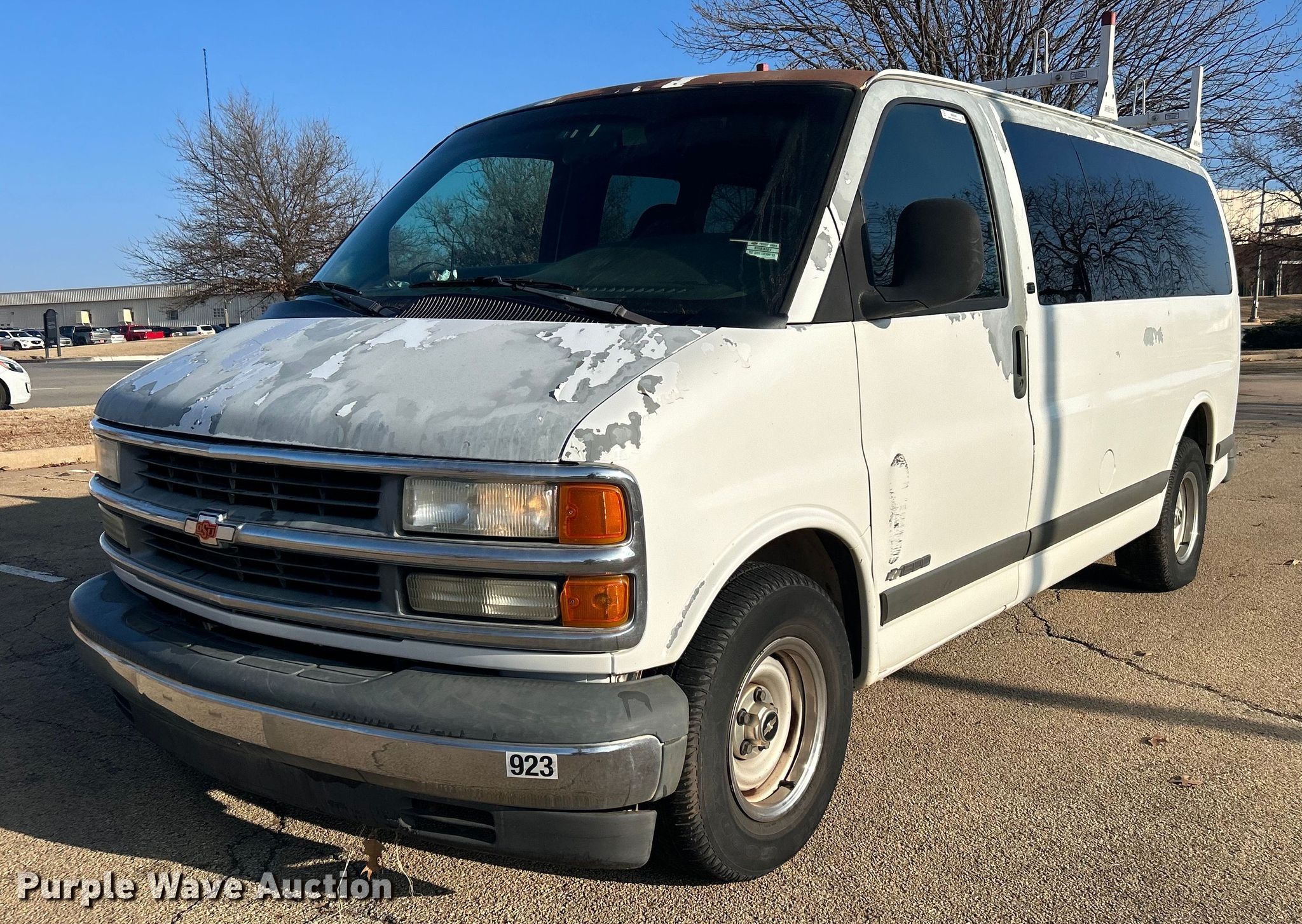 2002 Chevrolet Express 1500 van. Miles: 124,079 on odometer, VIN: 1GNFG15M921247710, Unit #: 923, Sale #: 2428-KP. Engine Displacement: 5.0L V8 OHV, Cylinders: 8, Fuel type: Gas. Transmission Automatic. Interior AC, Heat, Power windows, Power locks, Cruise control. Tires Size: P235/75R15. Notes Dash warning indicator: Check engine, Possible engine issues, rough idle. Oklahoma title. Oklahoma State University. Stillwater, OK 74074